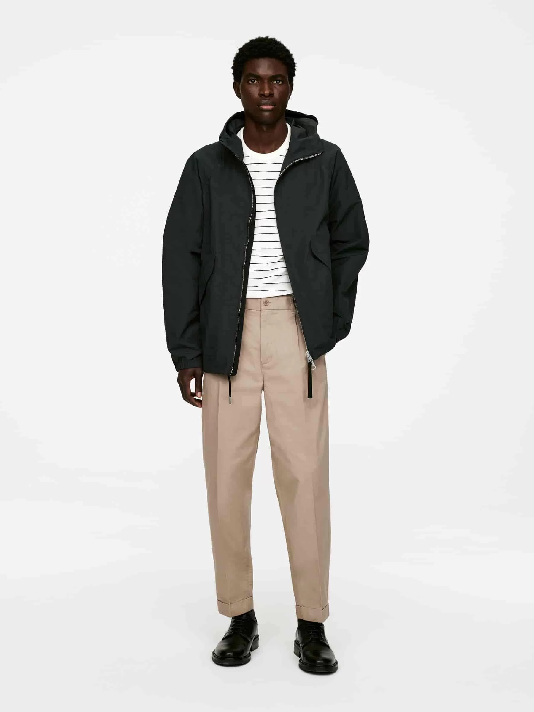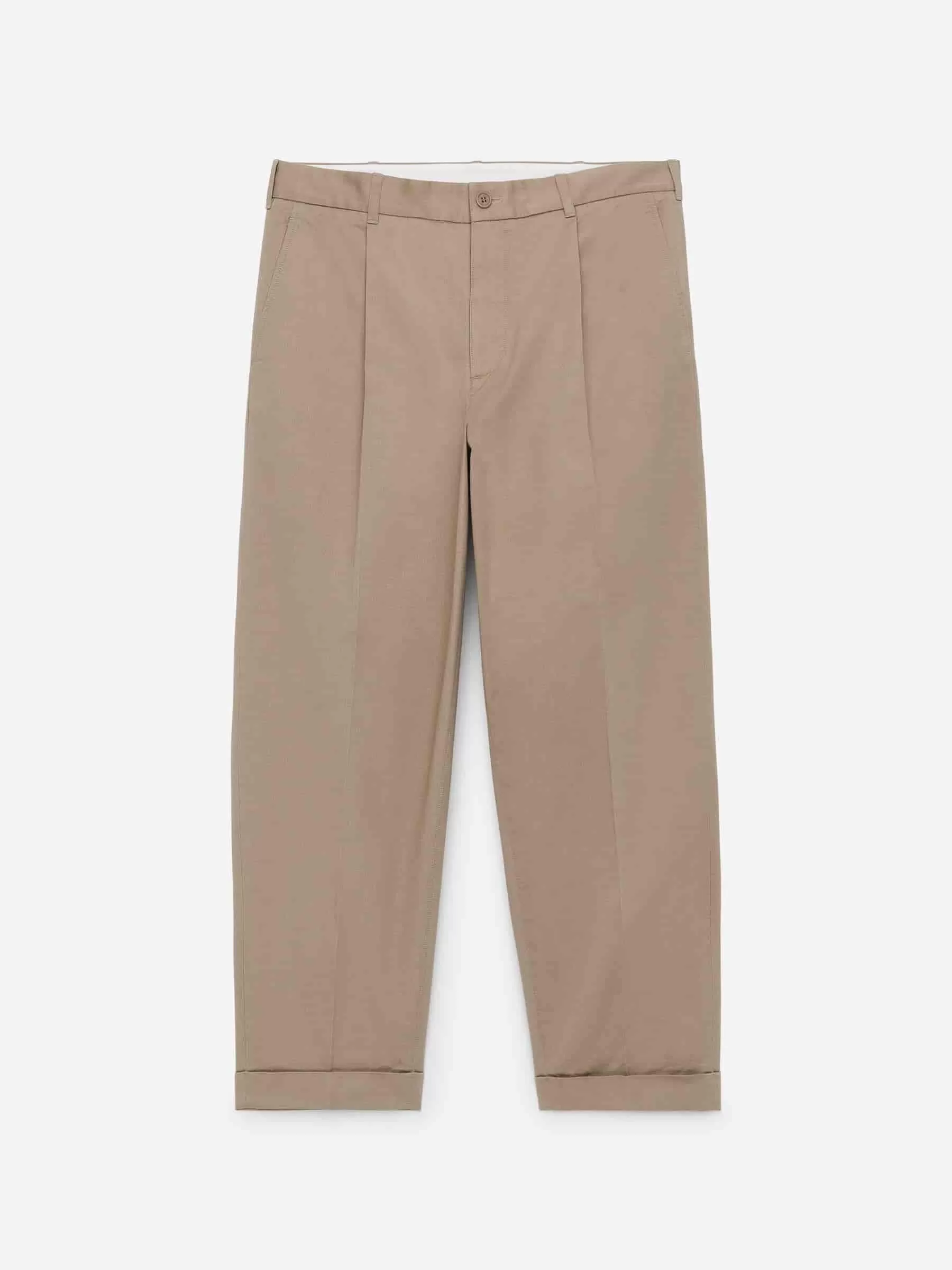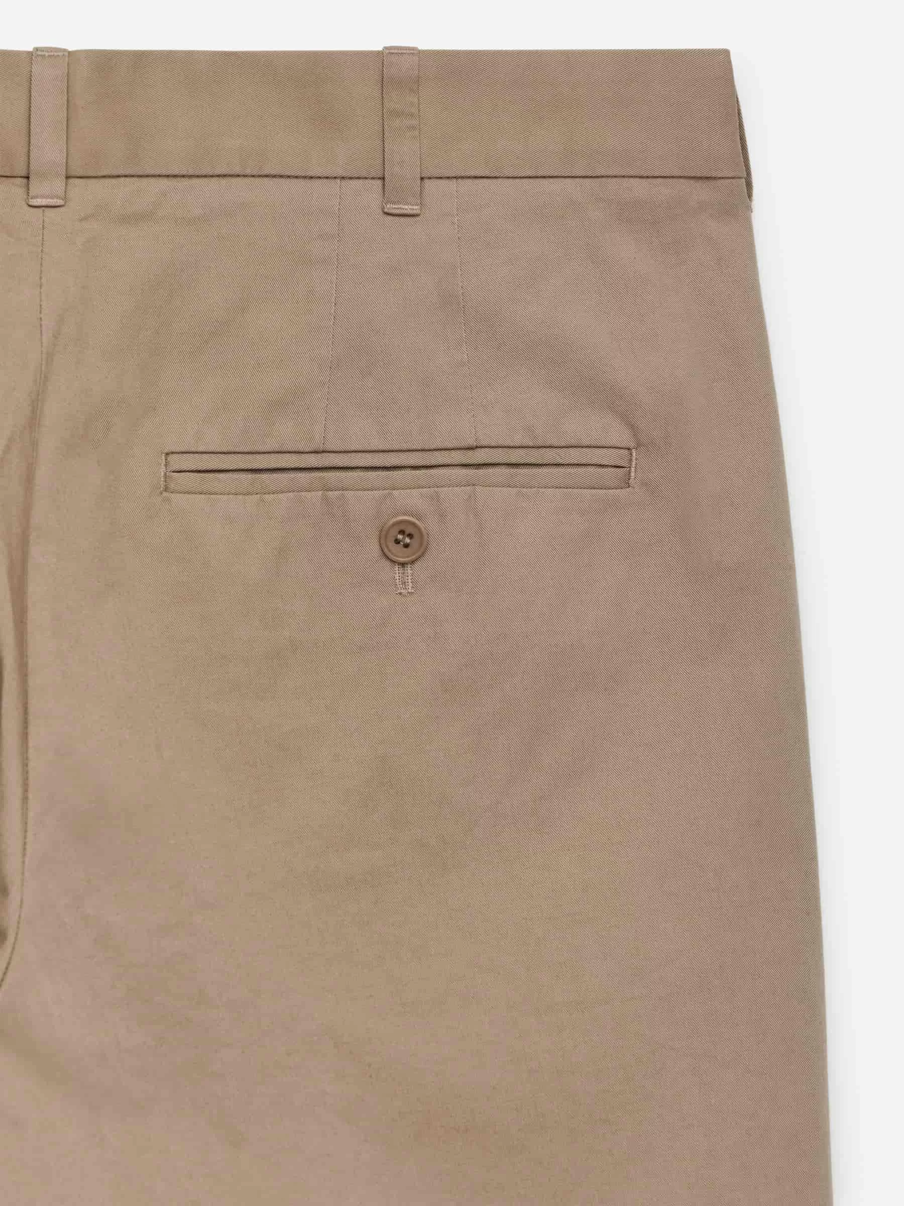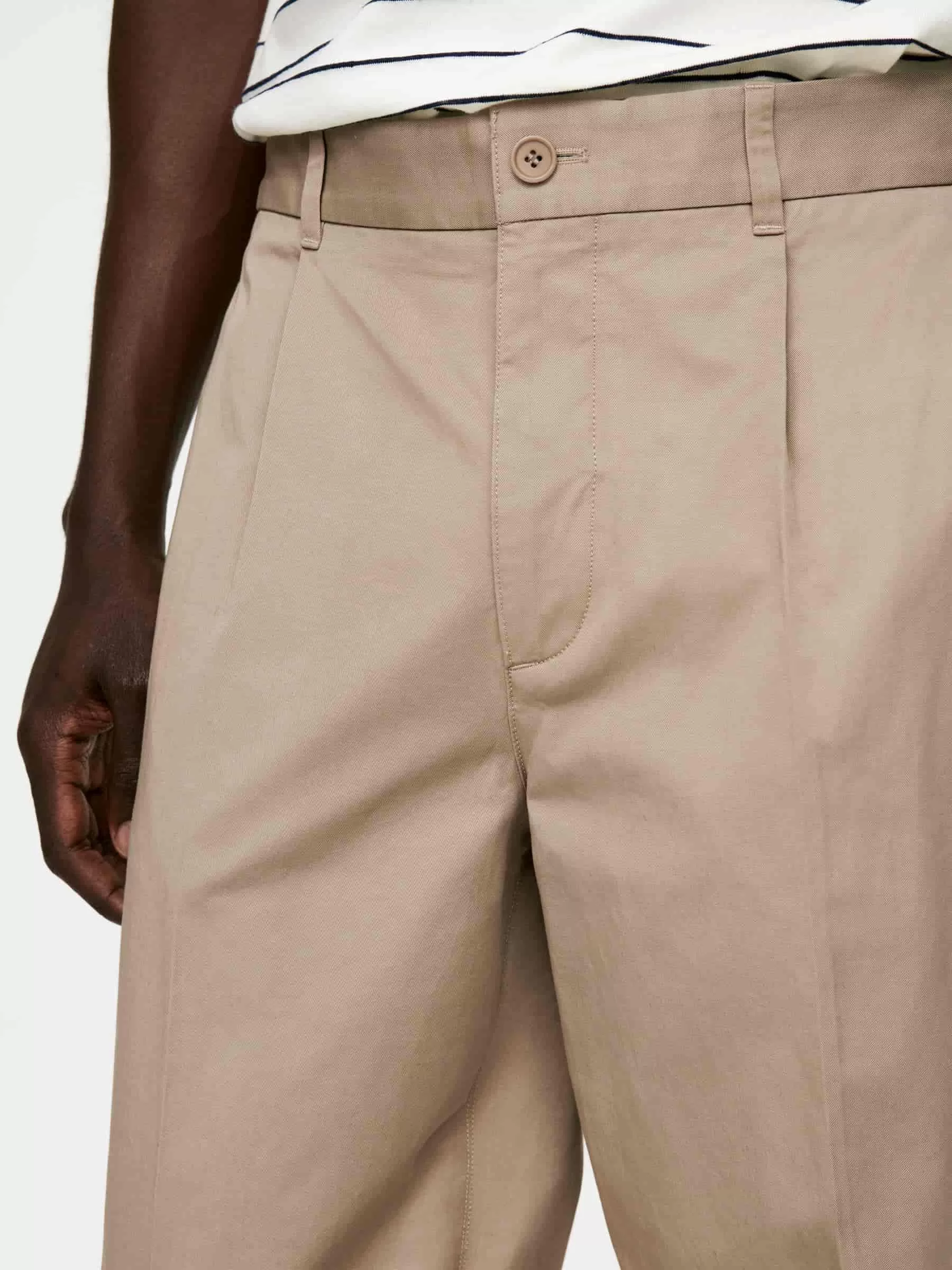 Cotton trousers featuring straight-cut legs with a fixed fold-up at bottom hemline. Two slanted pockets at front and two jetted pockets with buttoning at the back. Waistband with hook-and-bar closure and zip fly. Regular fit.