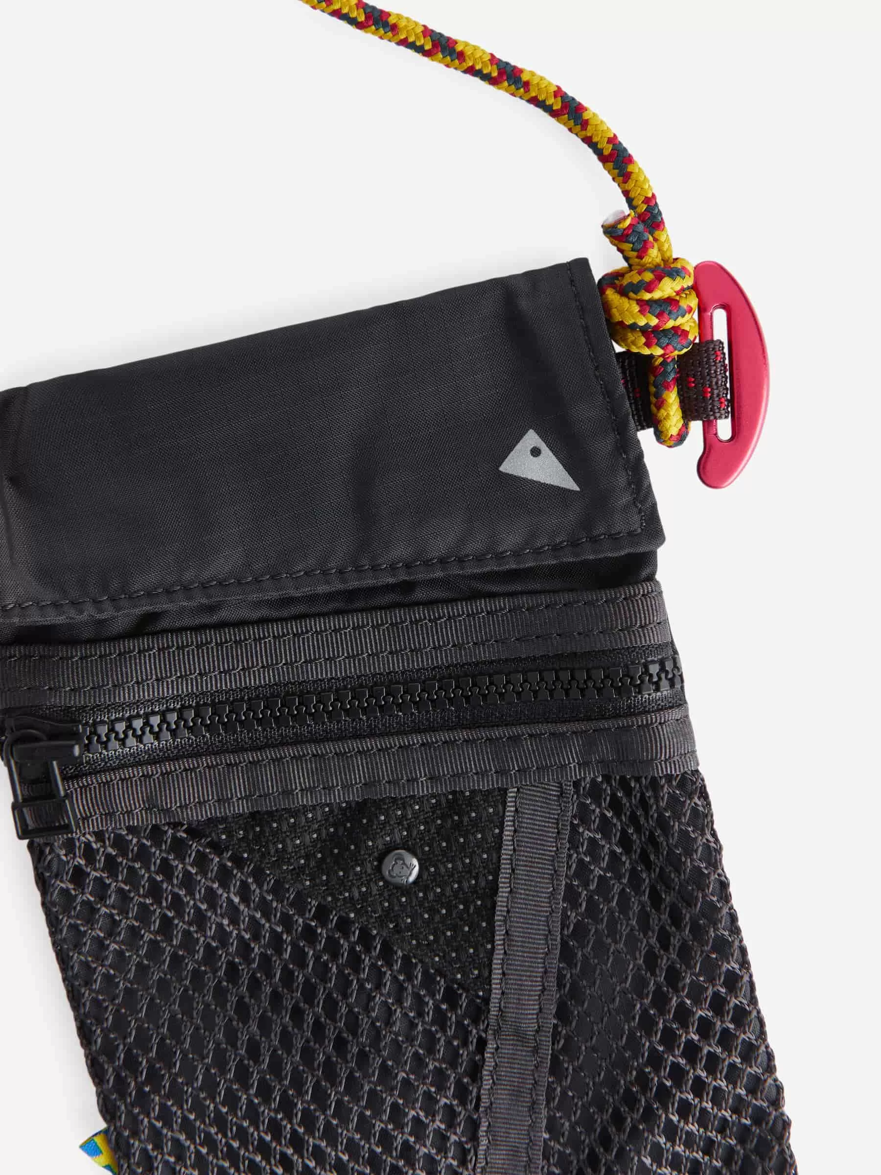 The Algir Lanyard Pocket from Swedish mountaineering brand Klättermusen is made from 100% recycled polyamide with Econyl® yarn. Detailed with an adjustable cord to hang over shoulder or around neck and two toggles to attach to backpack. Velcro lid opening, small pocket on the inside and mesh pocket on the outside.