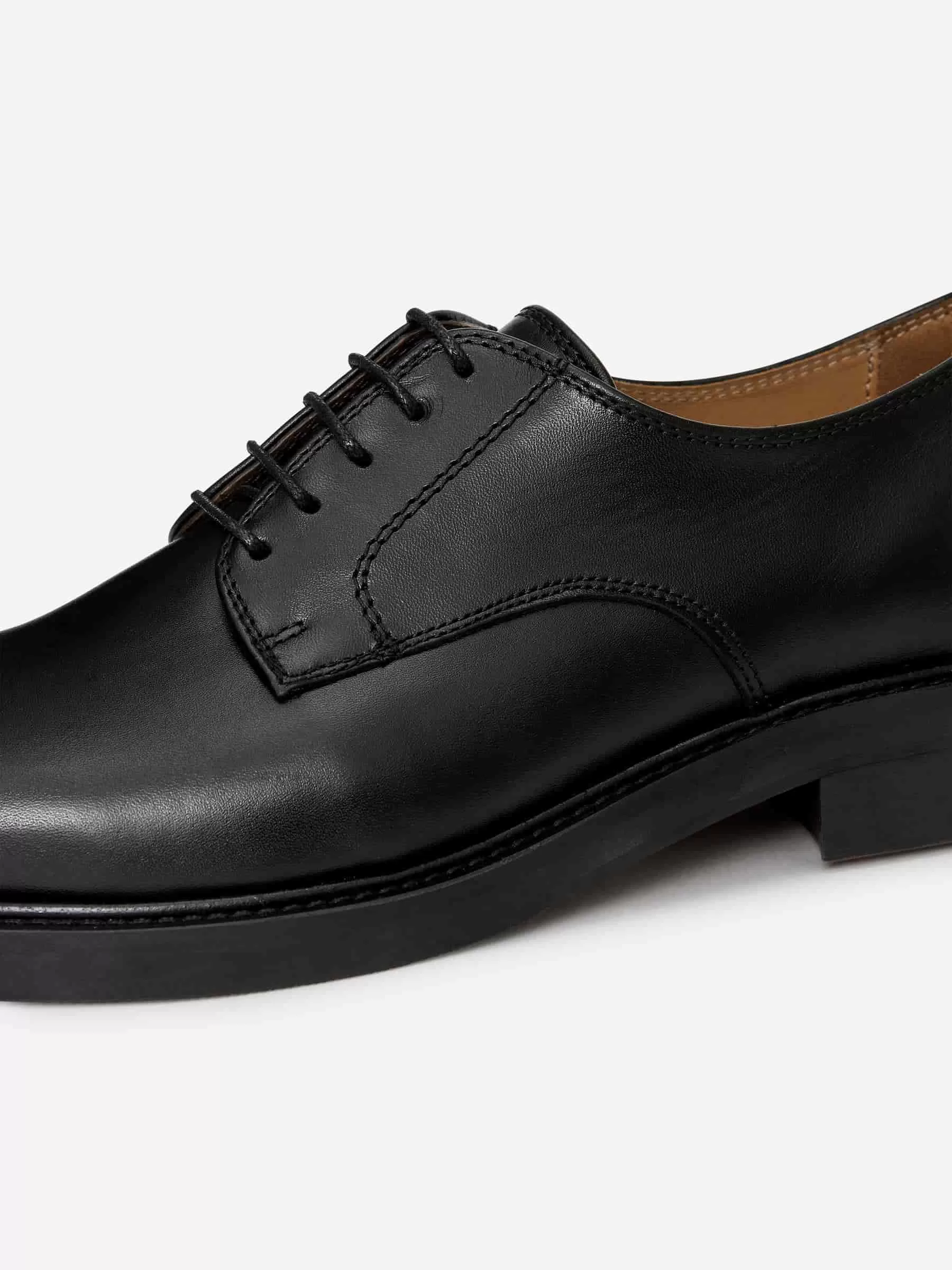 Classic derby shoes with a welted leather outsole, five eyelets and a leather-stacked heel. Leather lining and waxed cotton laces.