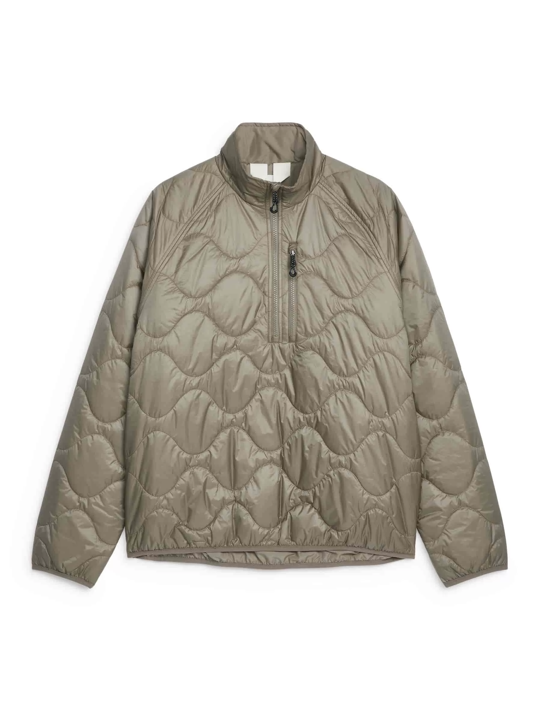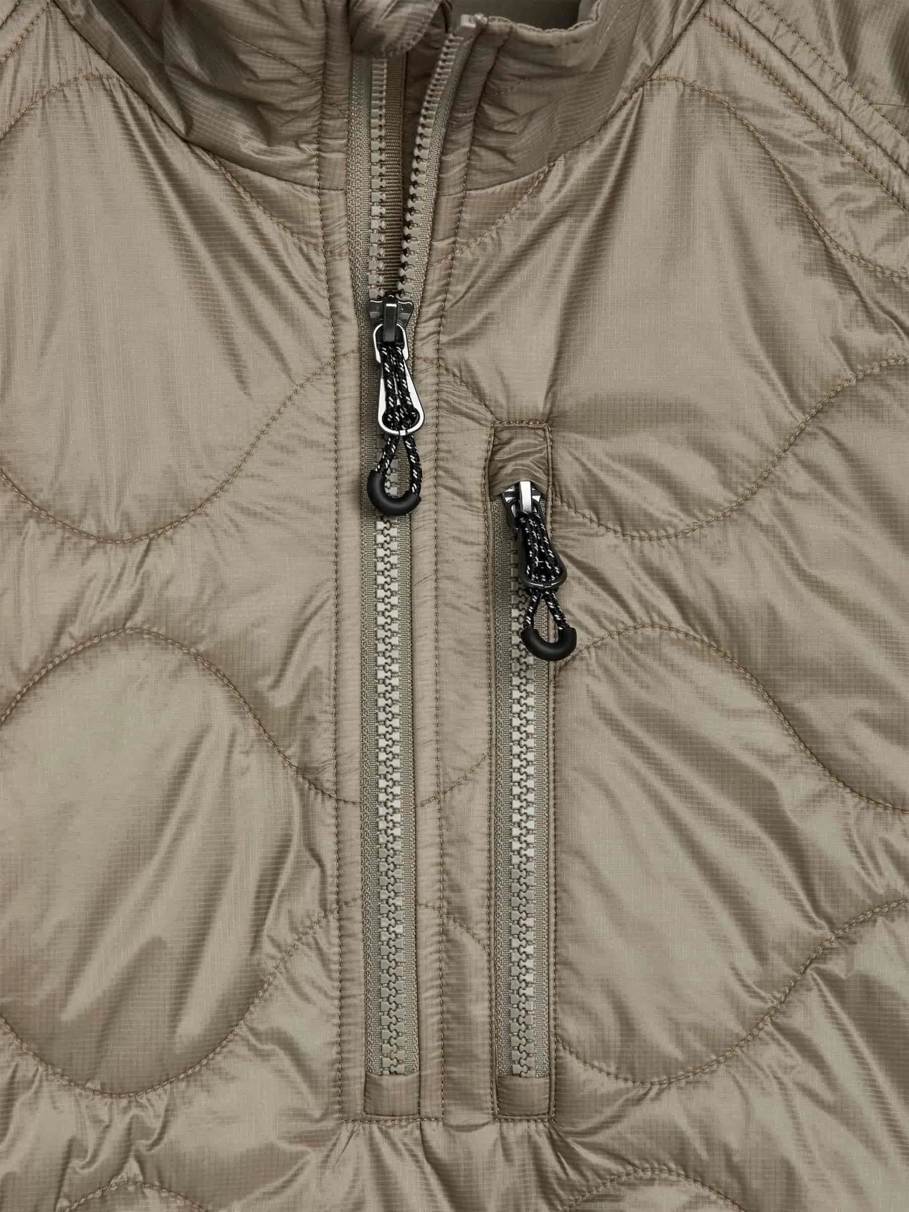 Quilted jacket with a lightweight padding and a ripstop shell. A pop-over style with a high collar and a half-zip. Raglan-cut sleeves for ease of movement. Single chest pocket with zip closure. Elastic binding at end of sleeves and at bottom hem. A versatile piece that also can be used for layering during the colder season.
