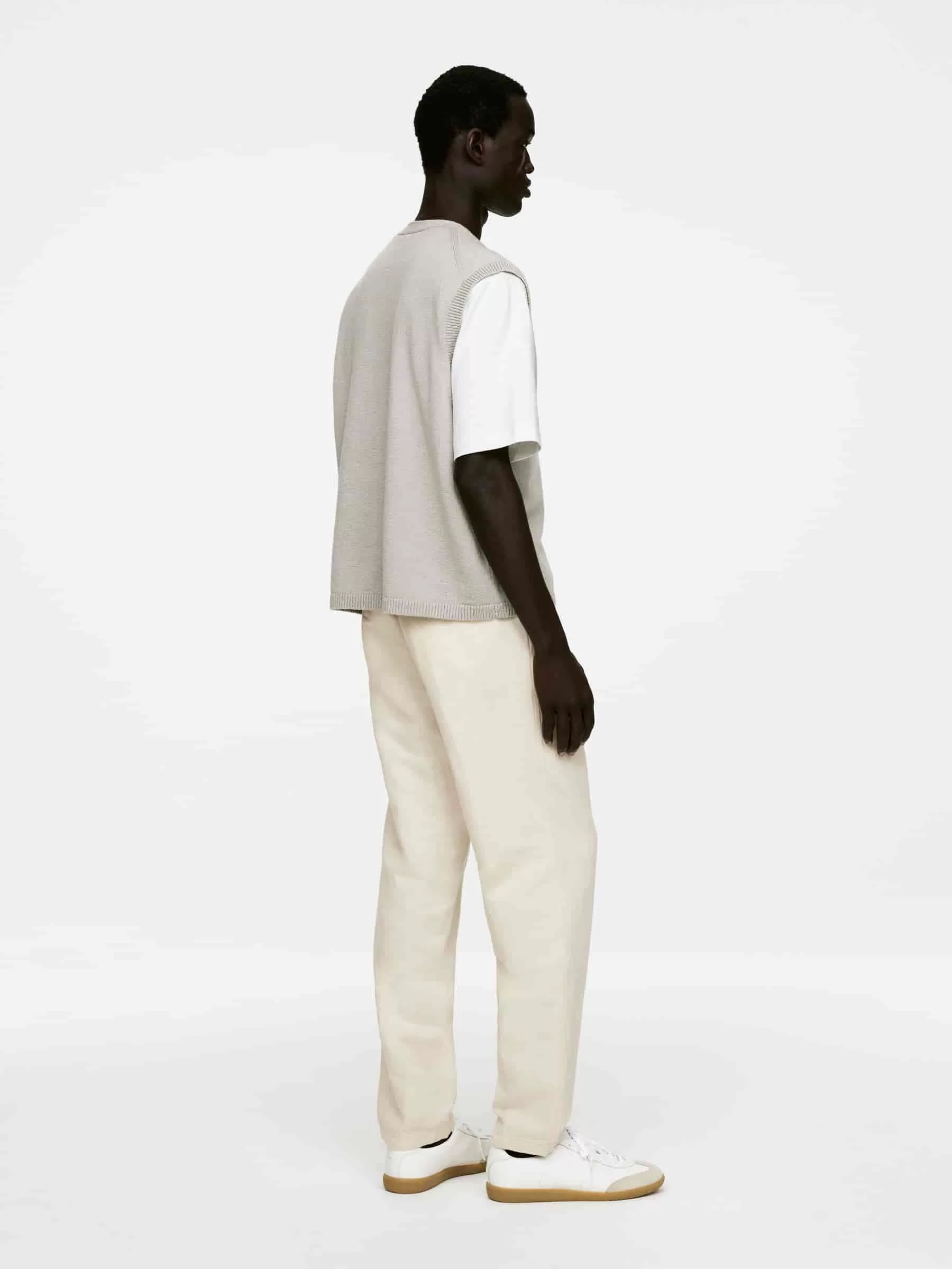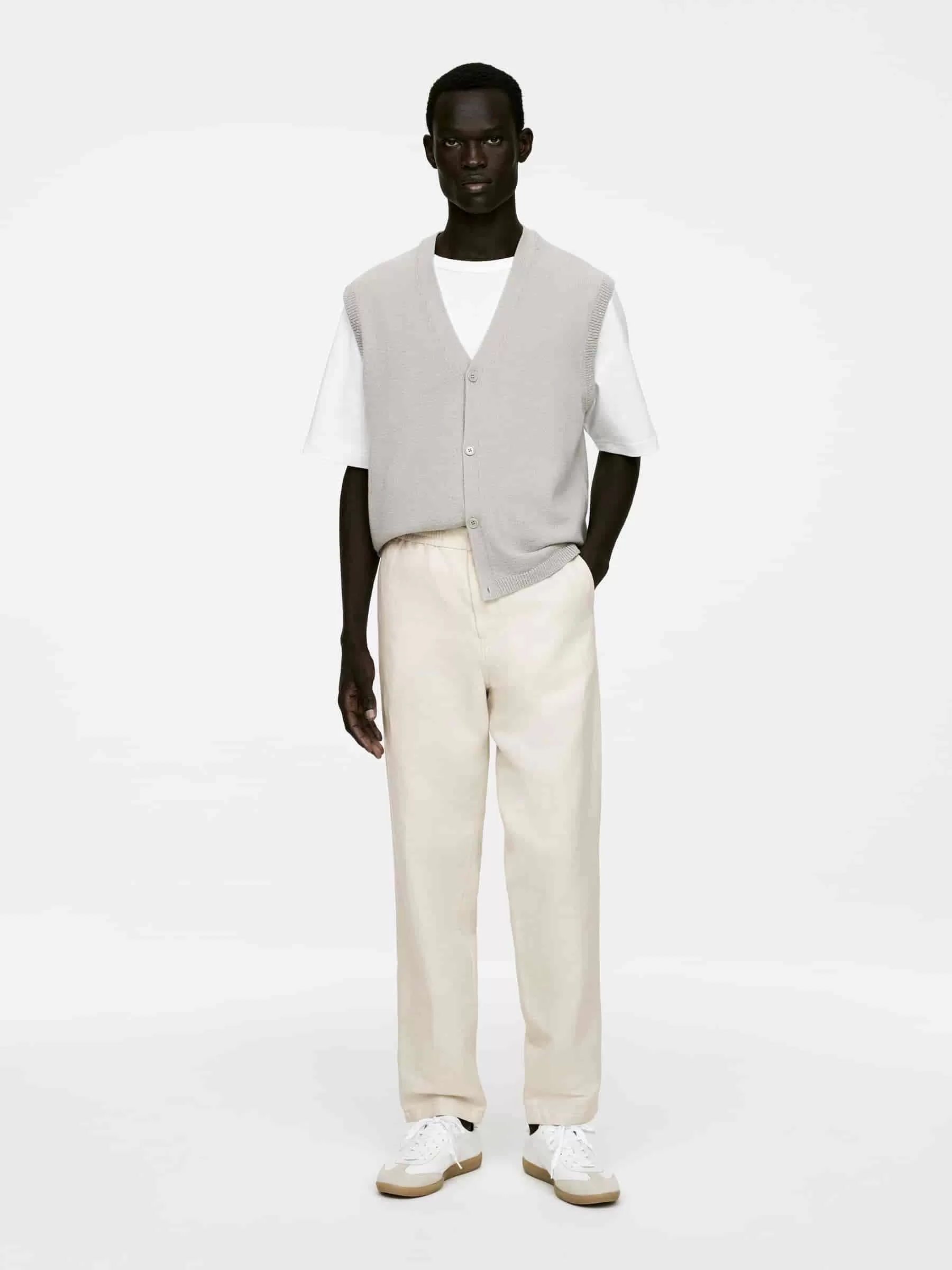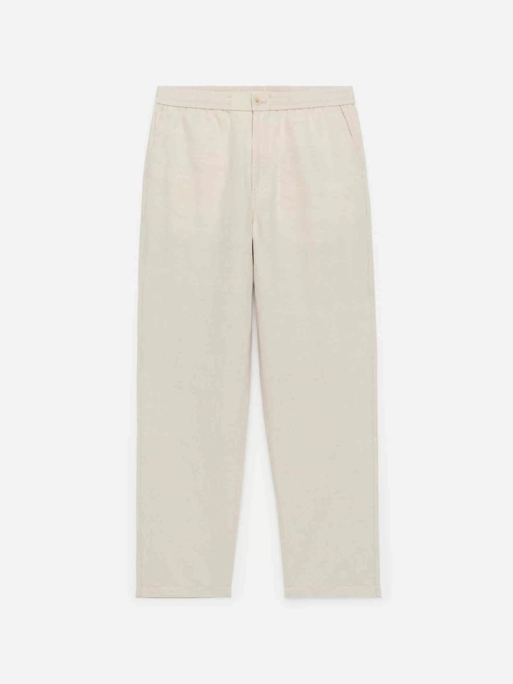 Trousers sewn from a linen blend. Detailed with an elasticated waistband with a drawstring on the inside, button closure and a zip fly. Slanted pockets at front and welt pockets at the back. Regular fit.