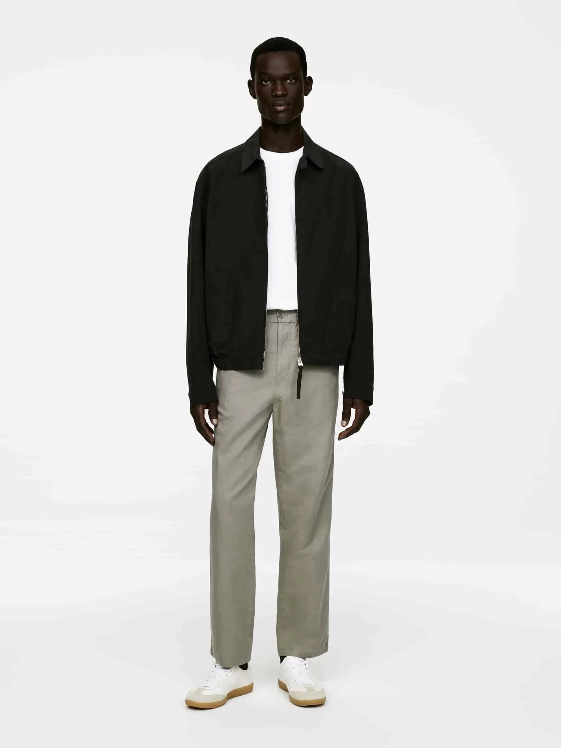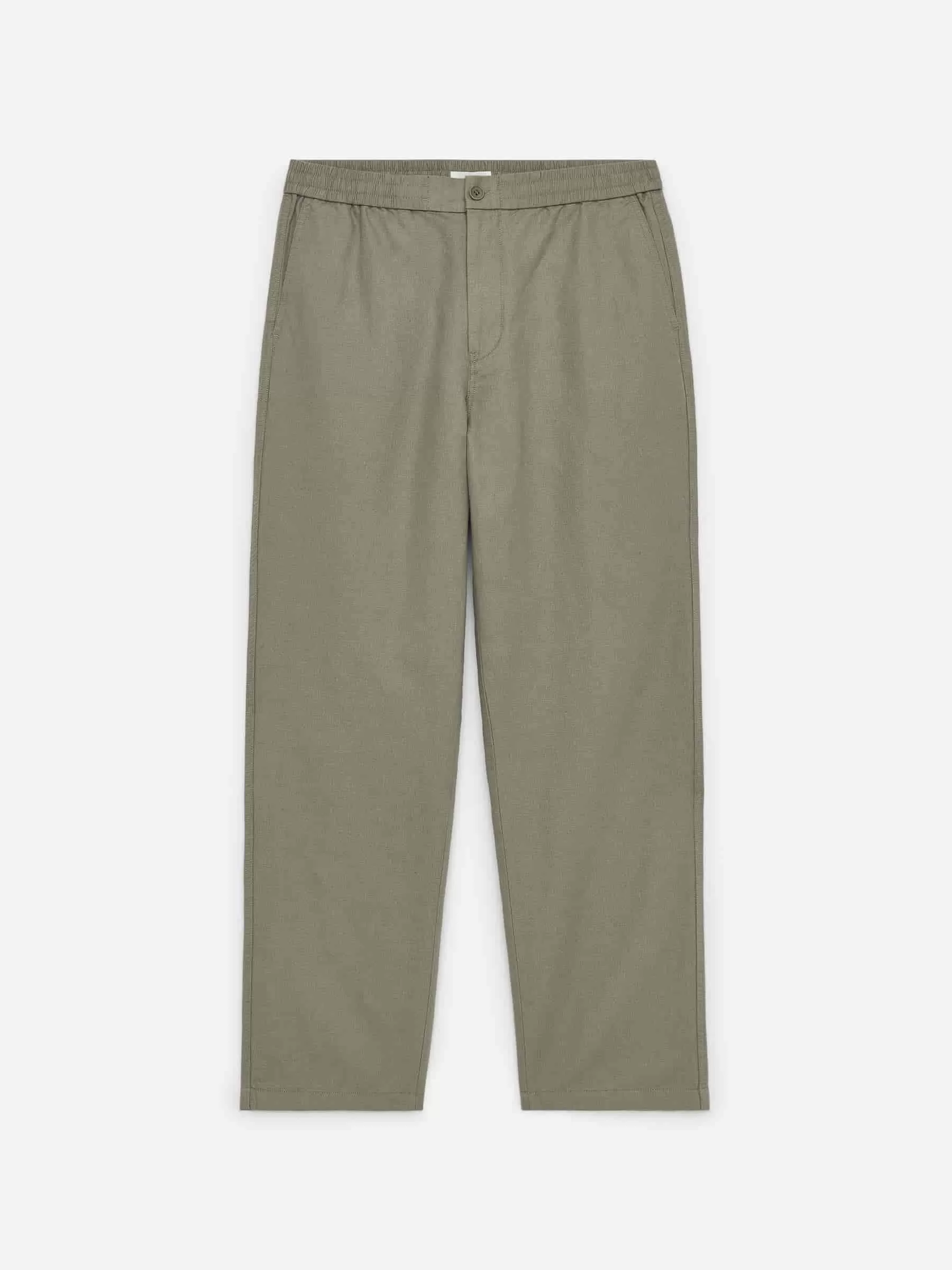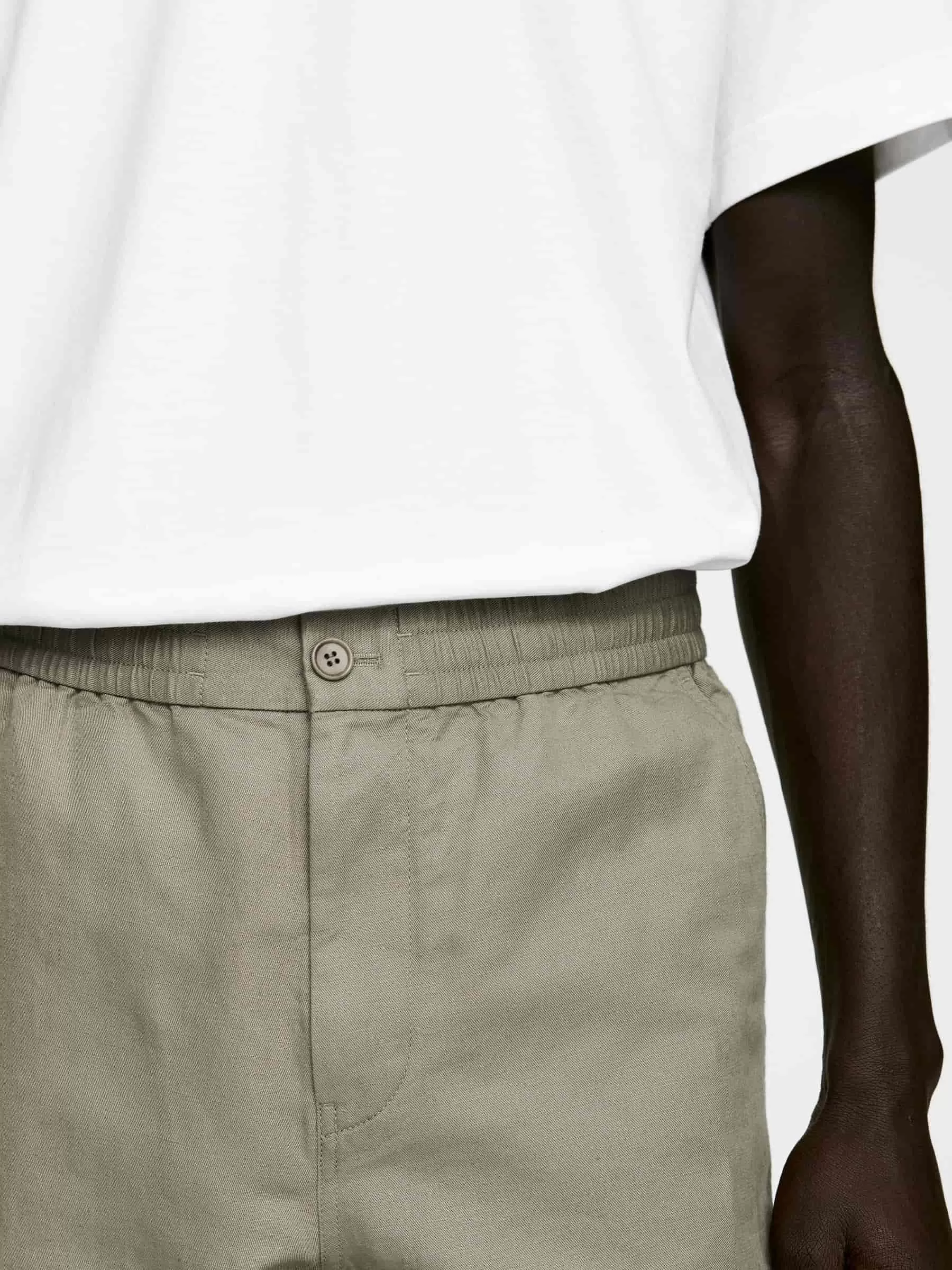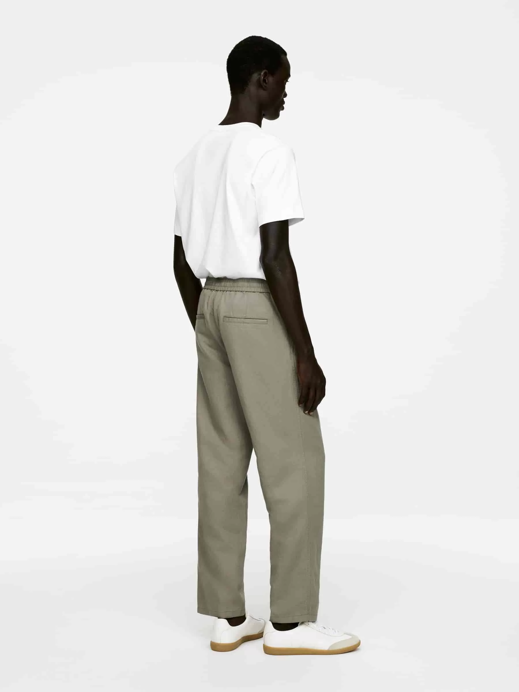 Trousers sewn from a linen blend. Detailed with an elasticated waistband with a drawstring on the inside, button closure and a zip fly. Slanted pockets at front and welt pockets at the back. Regular fit.