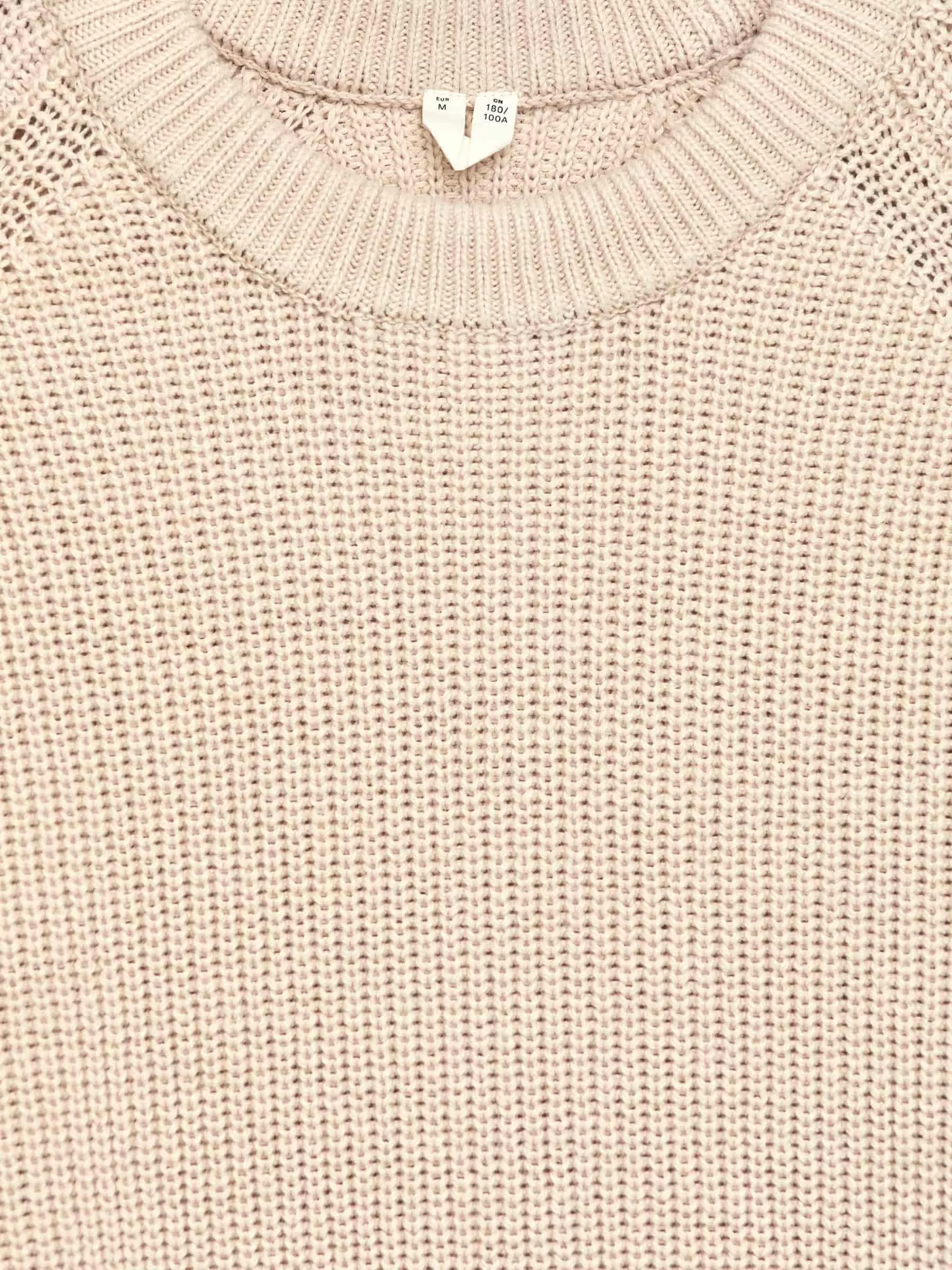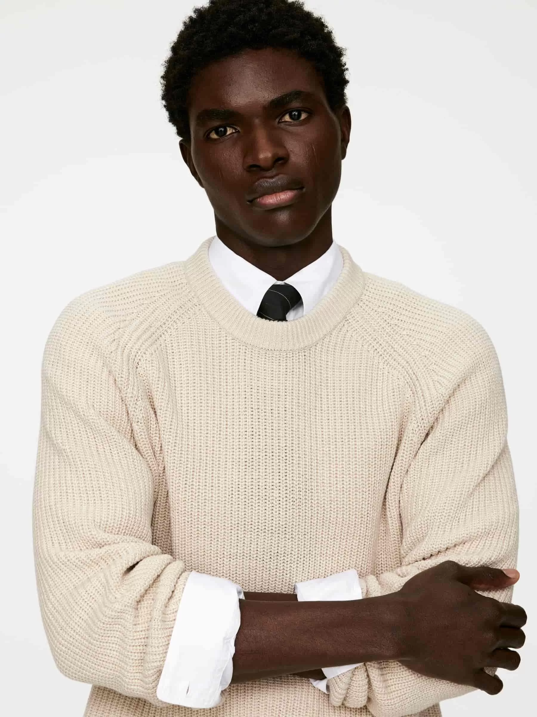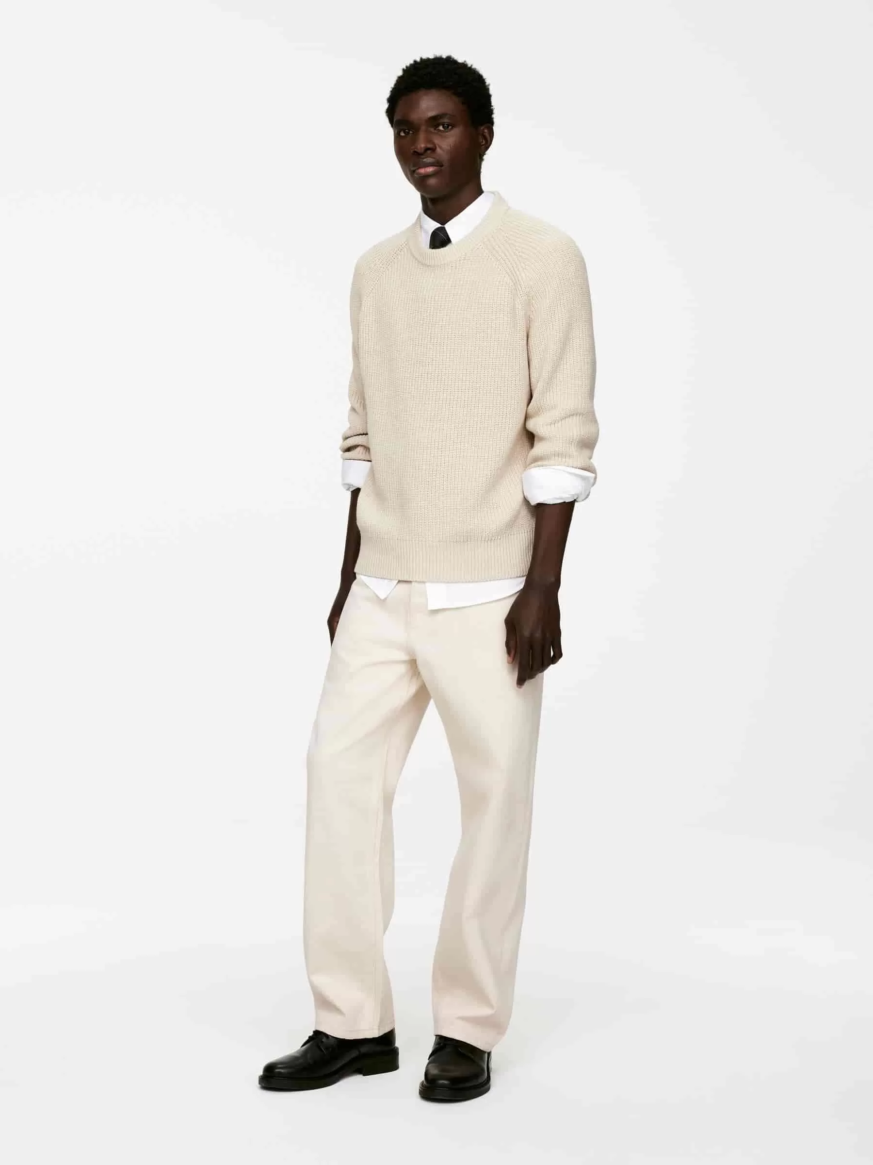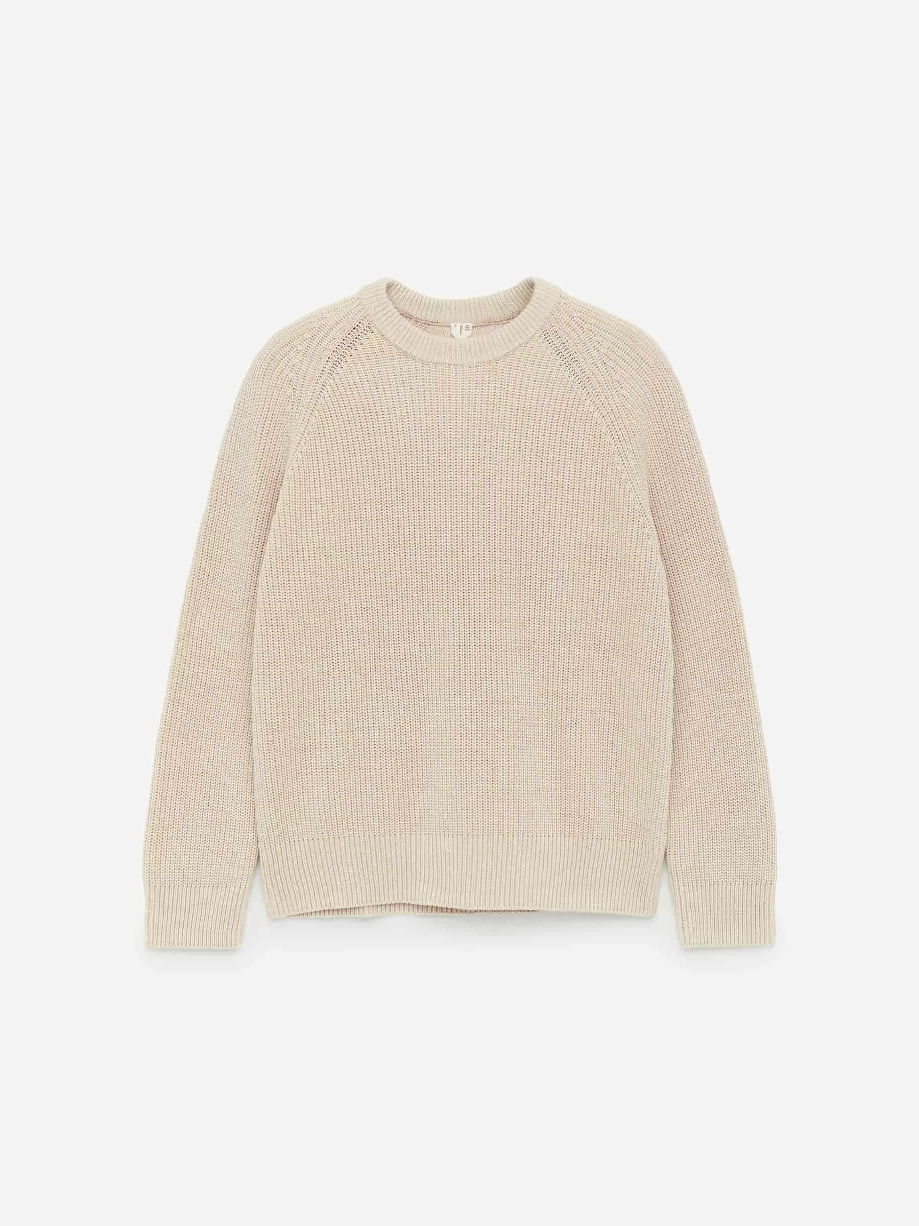 Jumper made from a blend of linen and cotton, knitted in a half-cardigan stitch. A crew-neck style with a chunky neckline and raglan-cut sleeves.