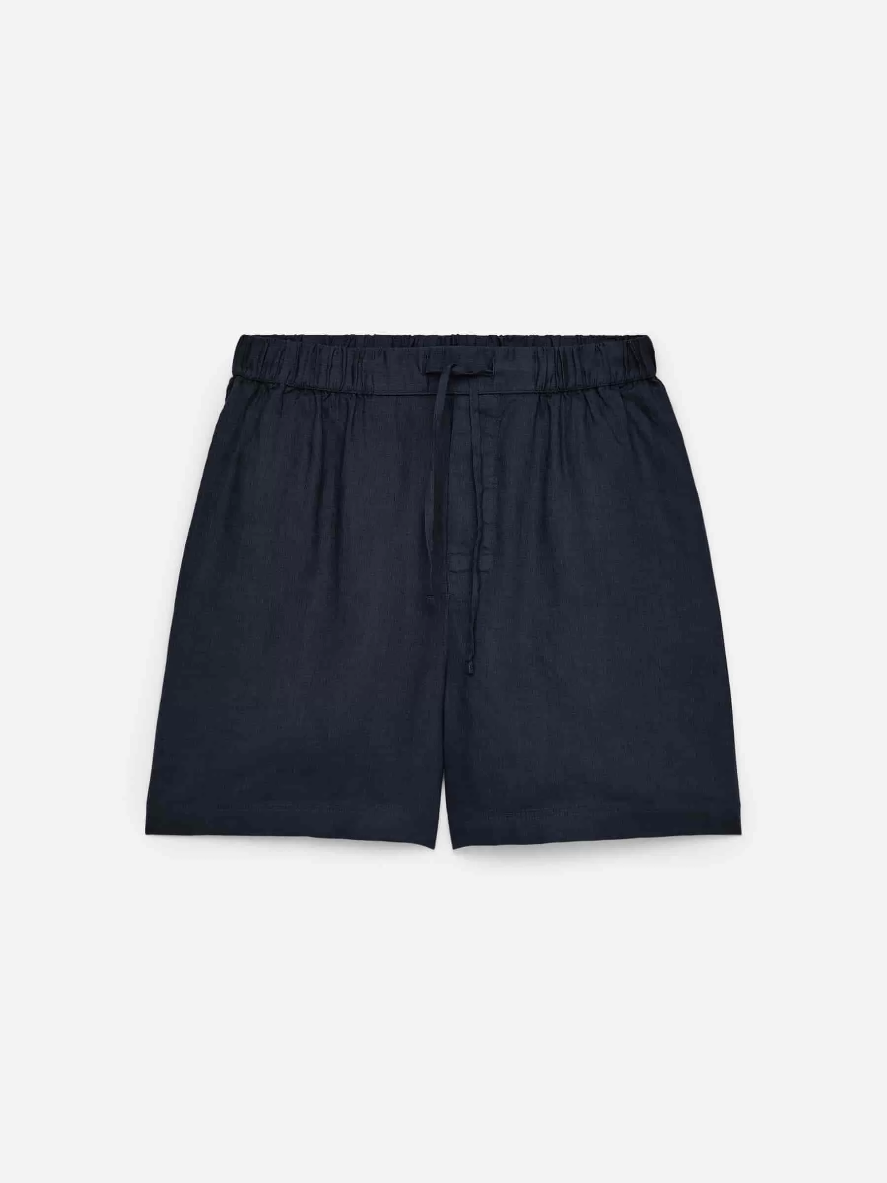 Linen shorts cut for a regular fit. A pull-on style with elastics and a drawstring at waist, pockets at side seams and a single patch pocket at the back. Button fly.