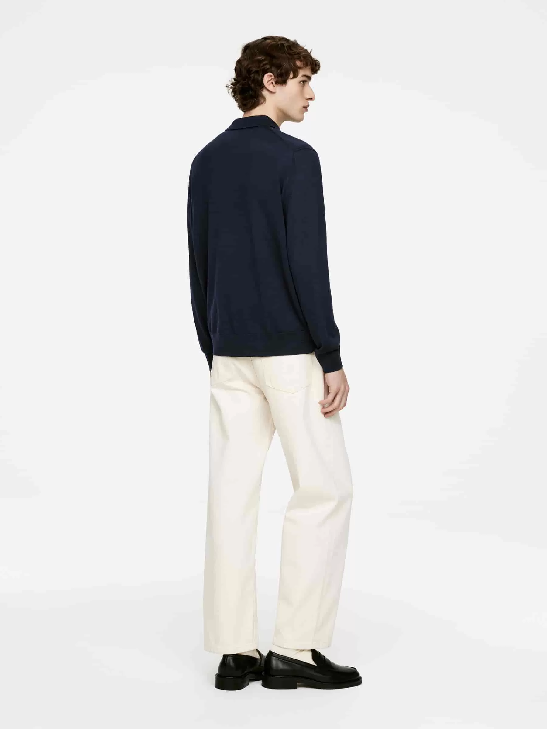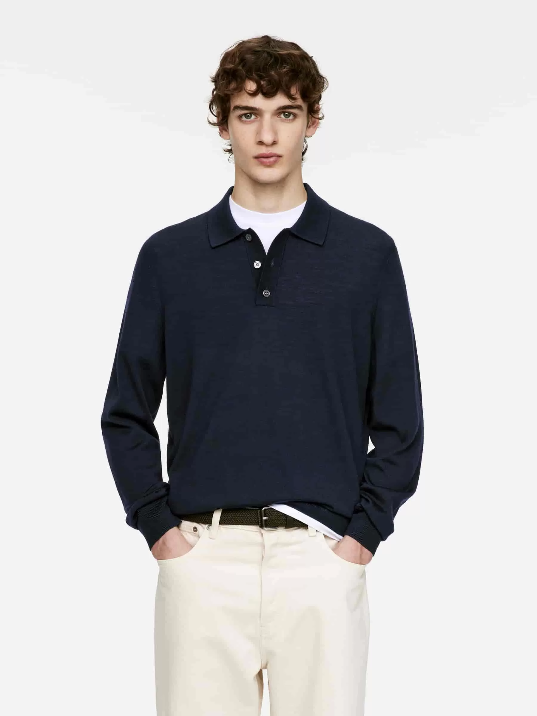 Fine-knit polo jumper crafted from merino wool. This style has a soft feel to the touch and a slightly lustrous surface. The jumper is detailed with collar and a buttoned half placket. The hemline and cuffs are rib-knitted. This jumper contains 100% RWS wool, certified by control union 1244999. Products certified to the Responsible Wool Standard (RWS) contain wool fiber from farms independently certified to animal welfare and land management requirements.