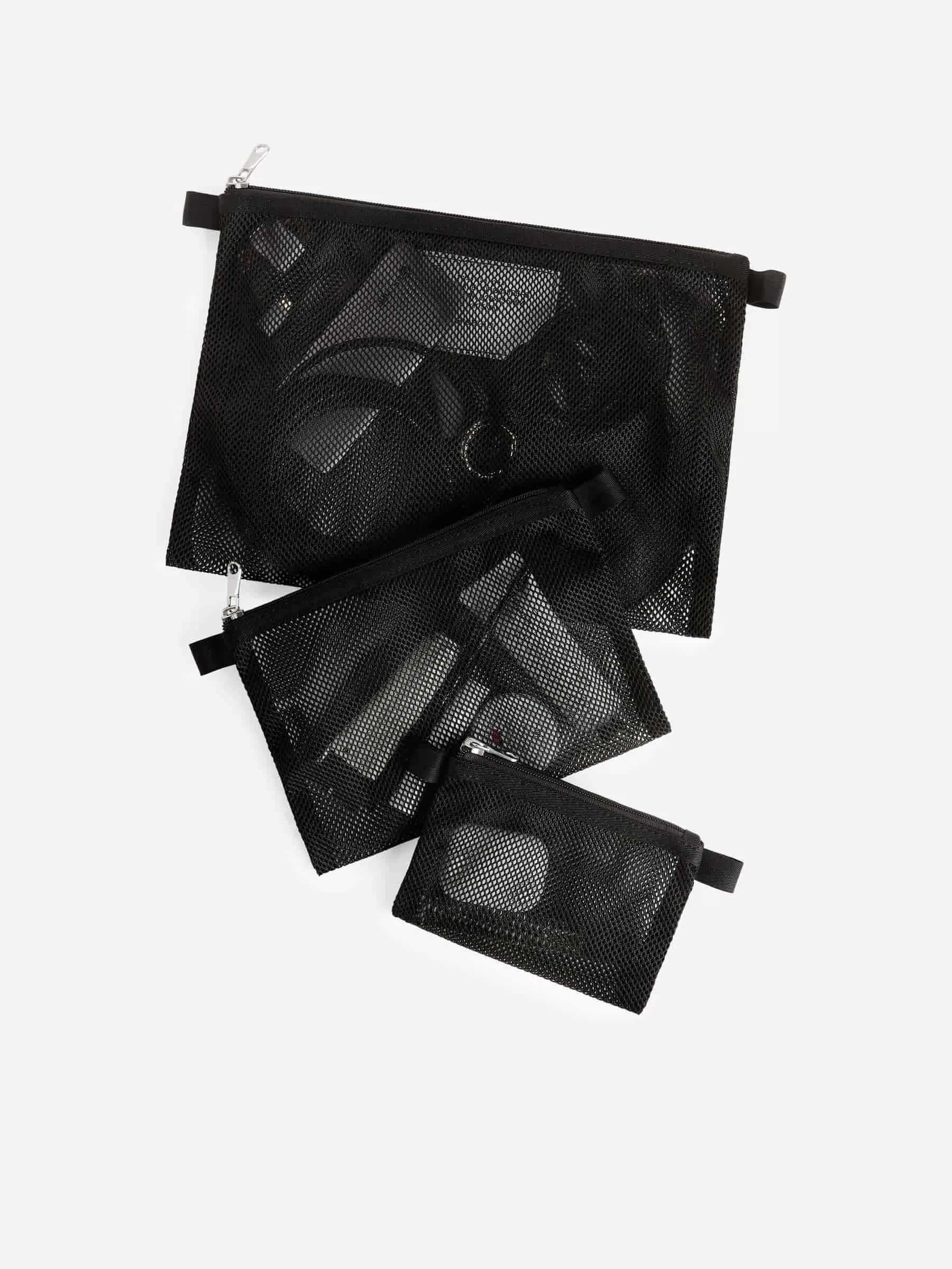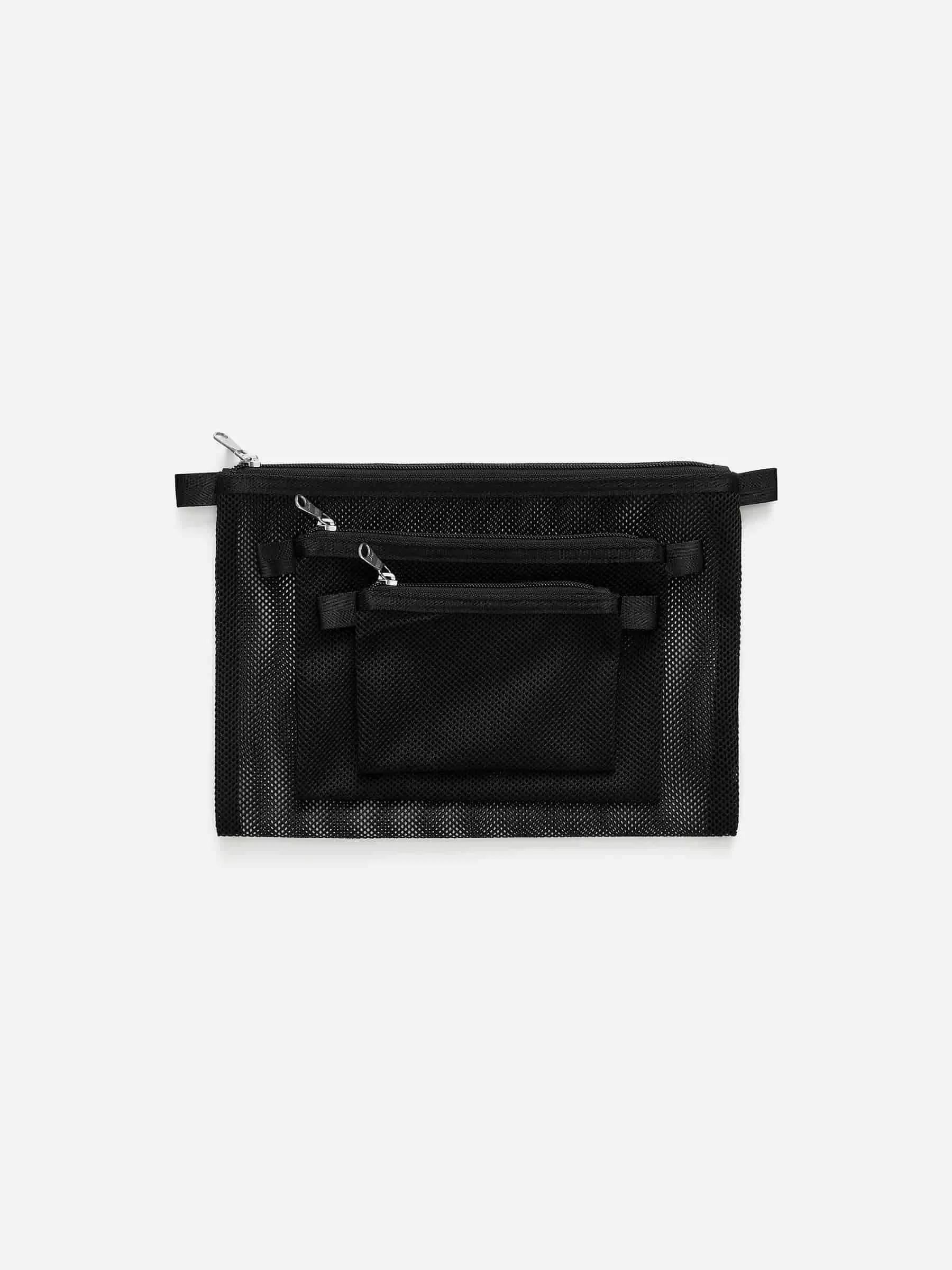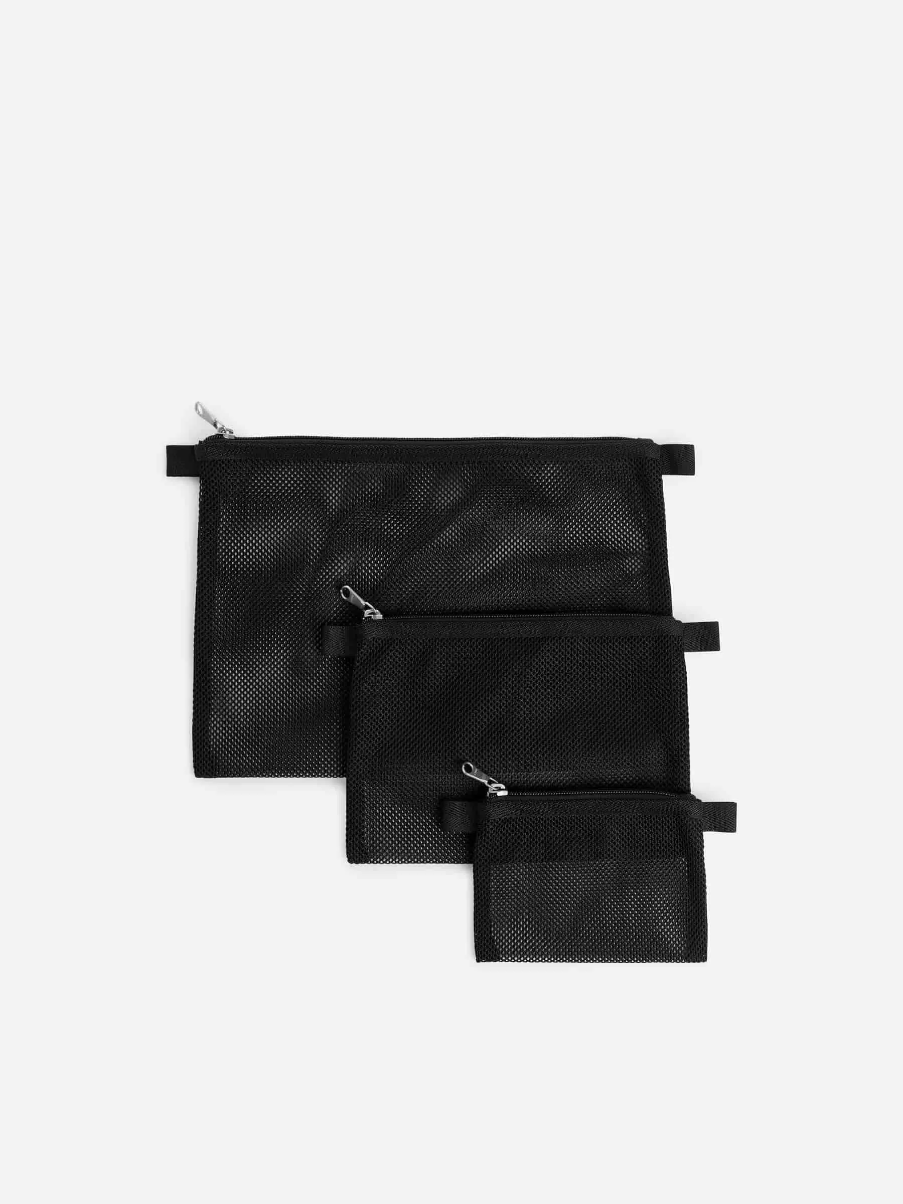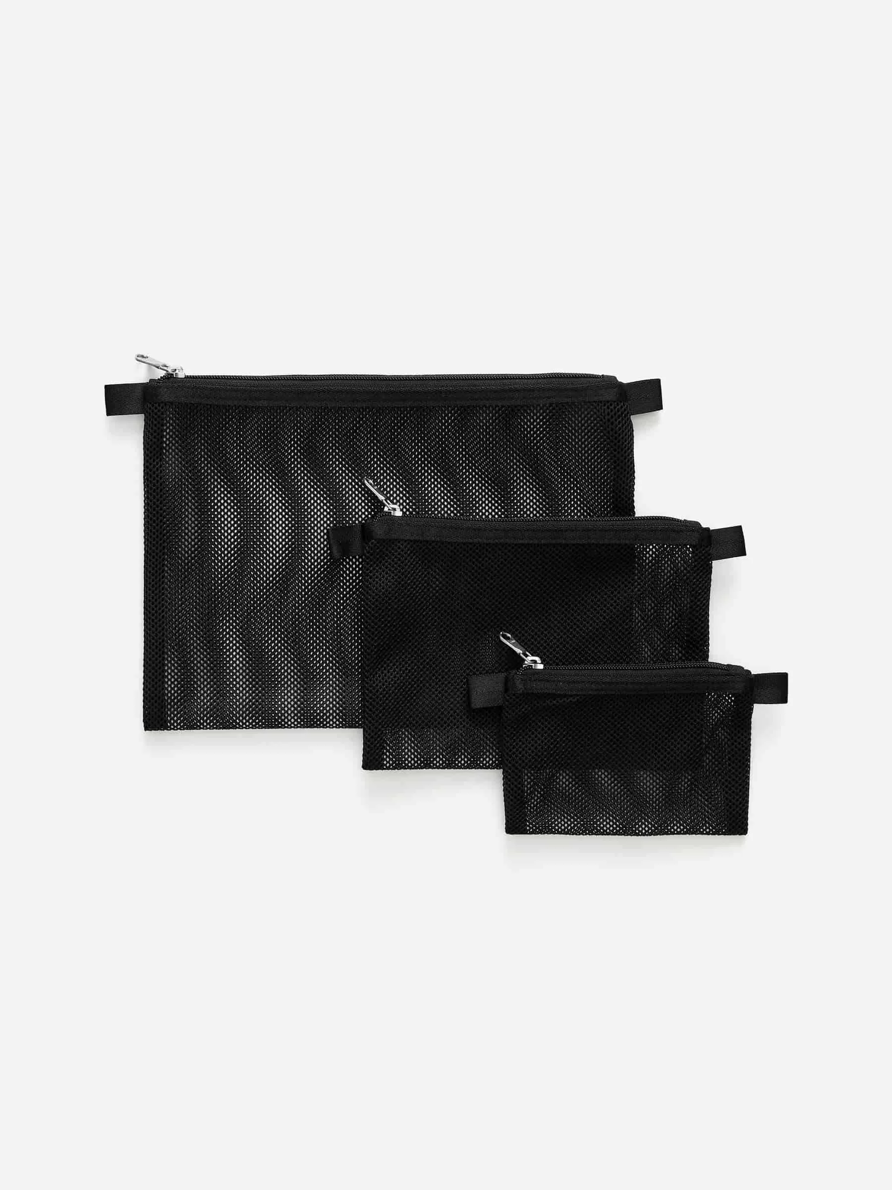 A set of three lightweight zip bags for easy packing and organising travel items. Durable see-through mesh fabric made from recycled polyester. Ideal both for travel and day-to-day use. Size 15.5 x 10.5 cm (small), 22 x 15.5 cm (medium), 31 x 22 cm (large).