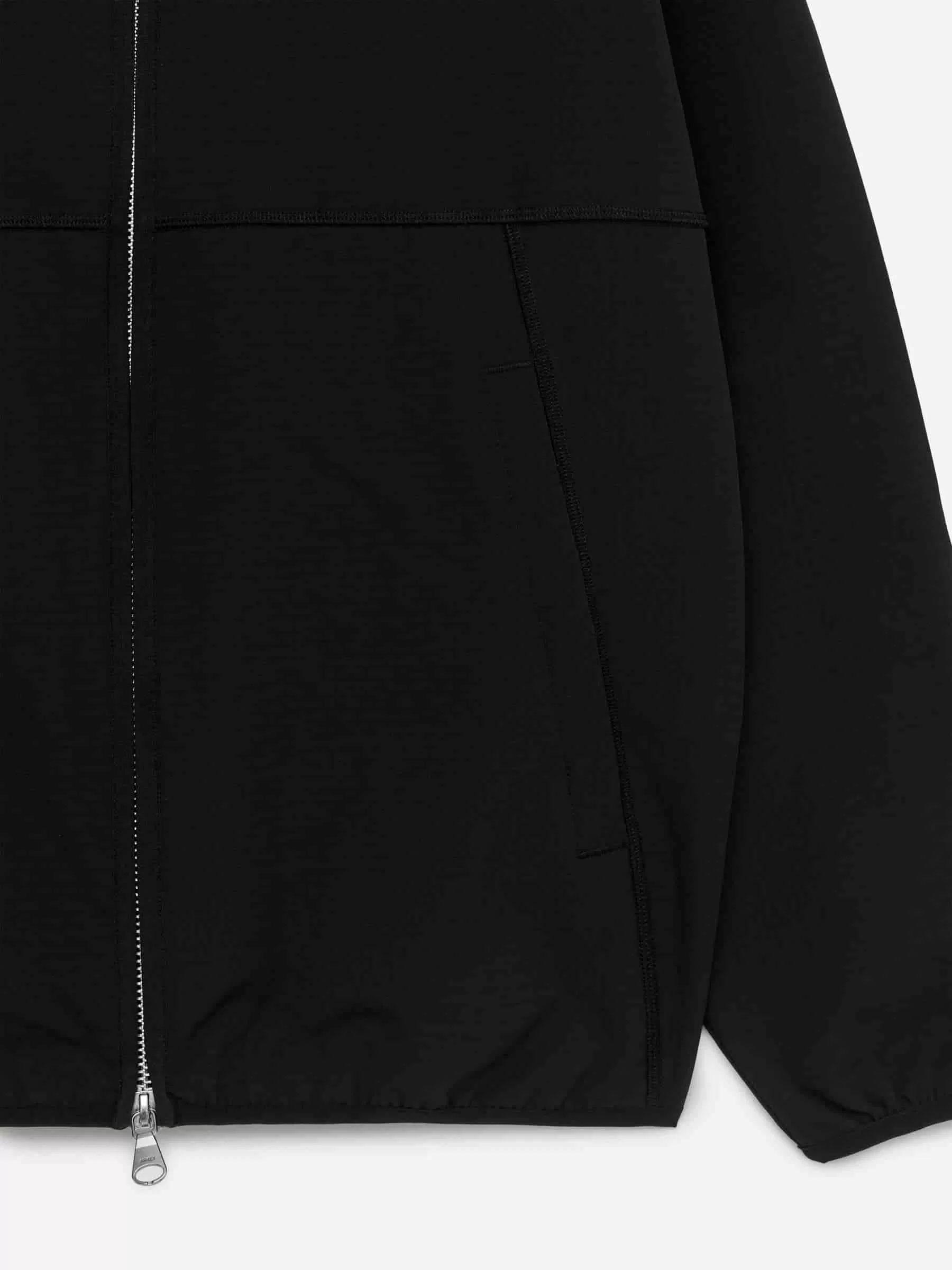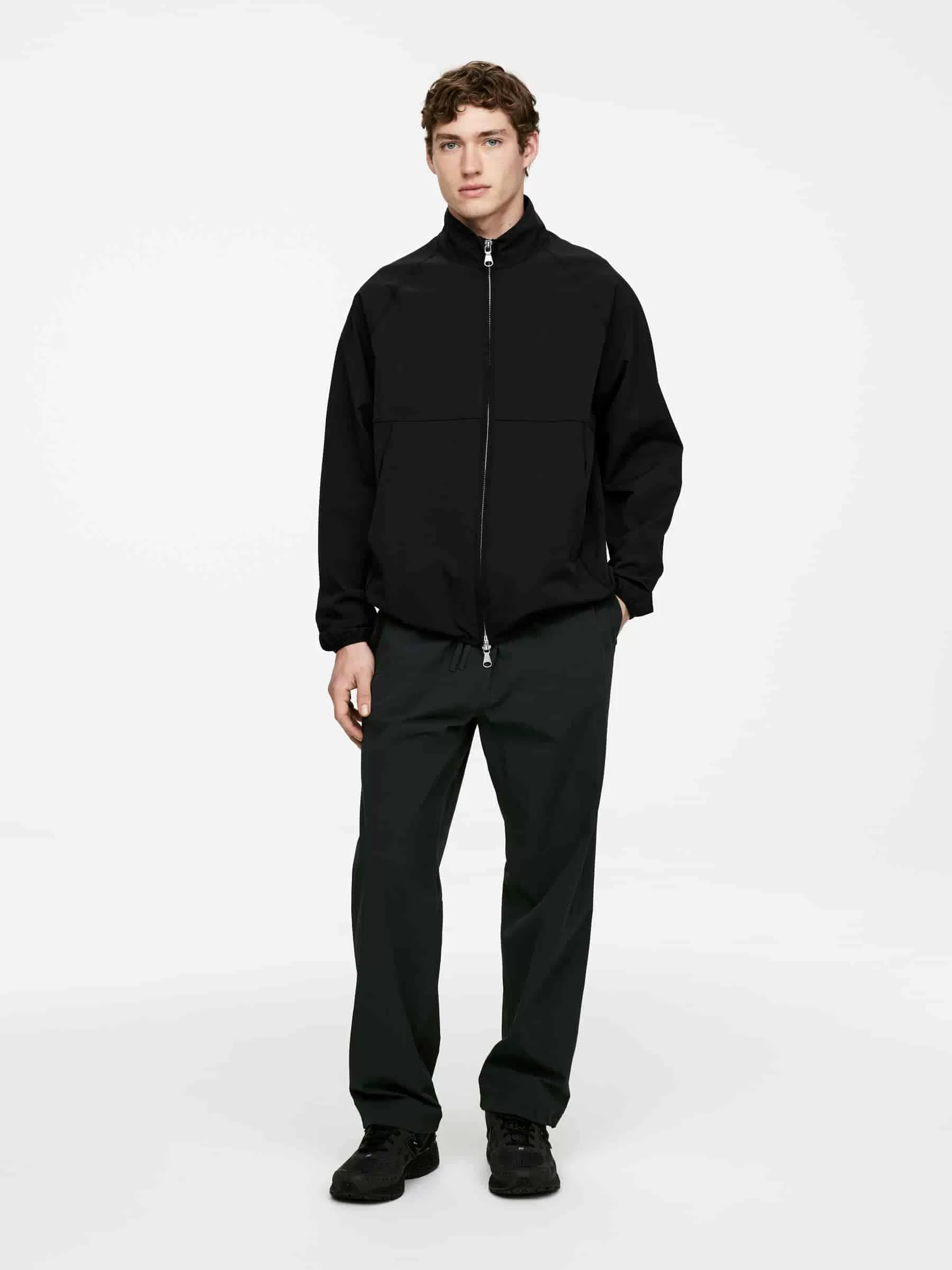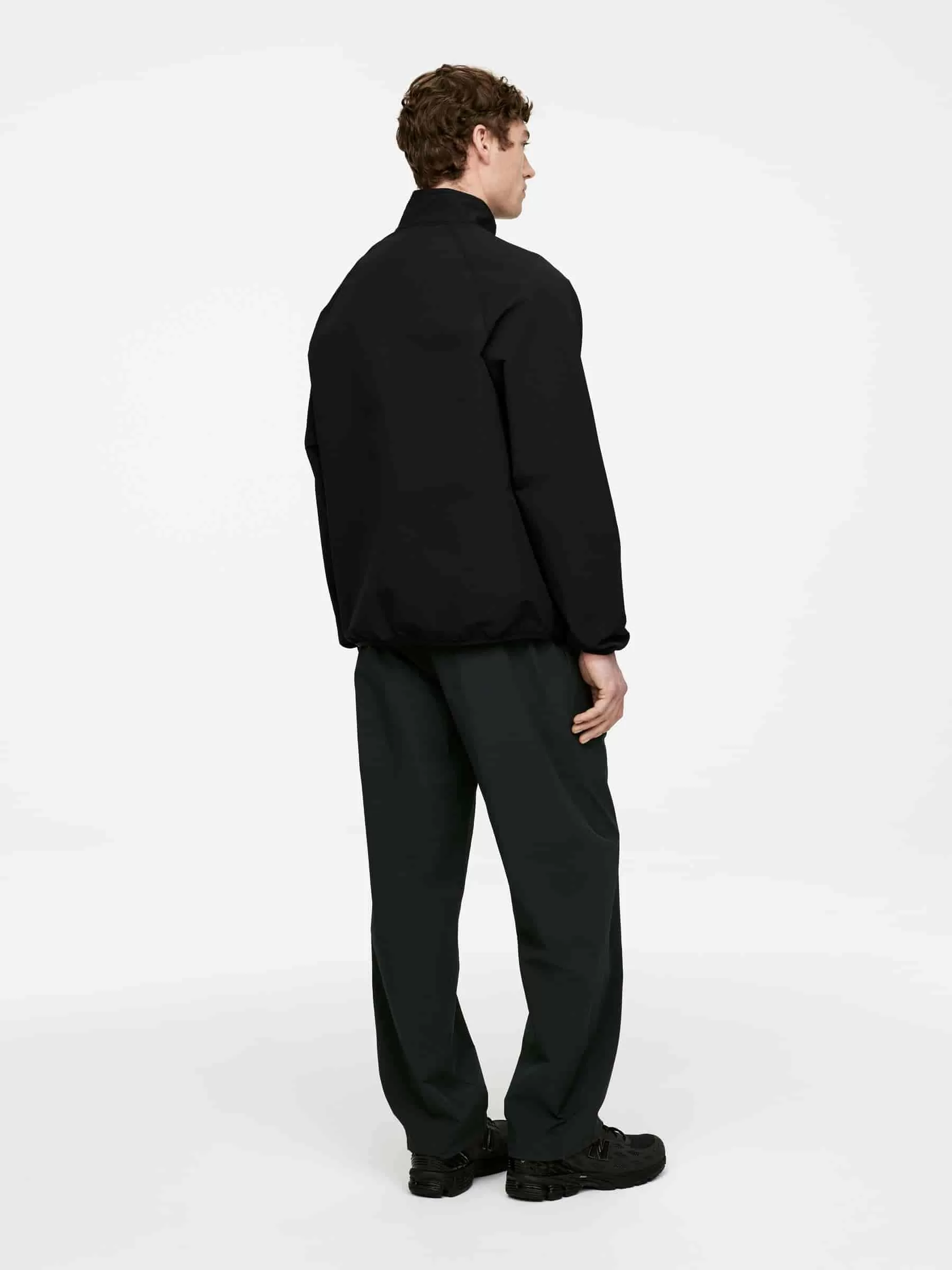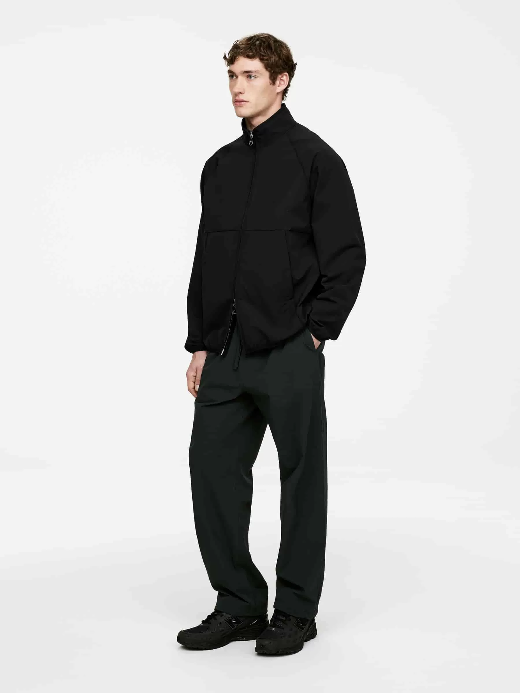 Jacket crafted from a stretchy nylon blend. Cut for a relaxed fit and style with a high double-layered collar with fleece on the inside. A two-way zip at front and large pockets with hidden snap button closure. Elastic binding at cuffs and hemline.