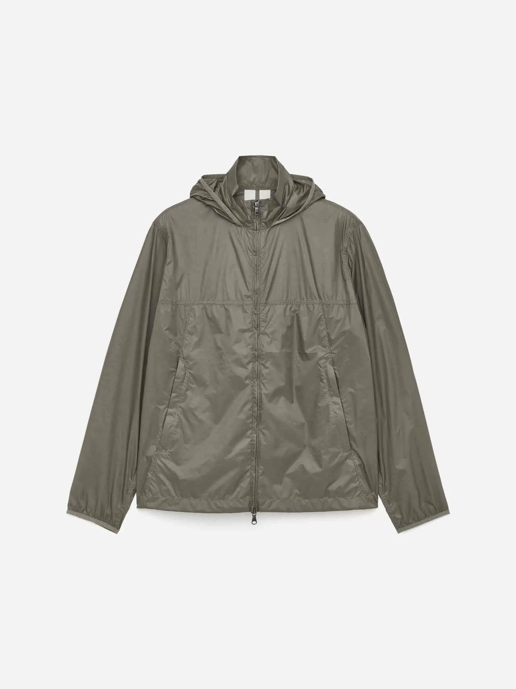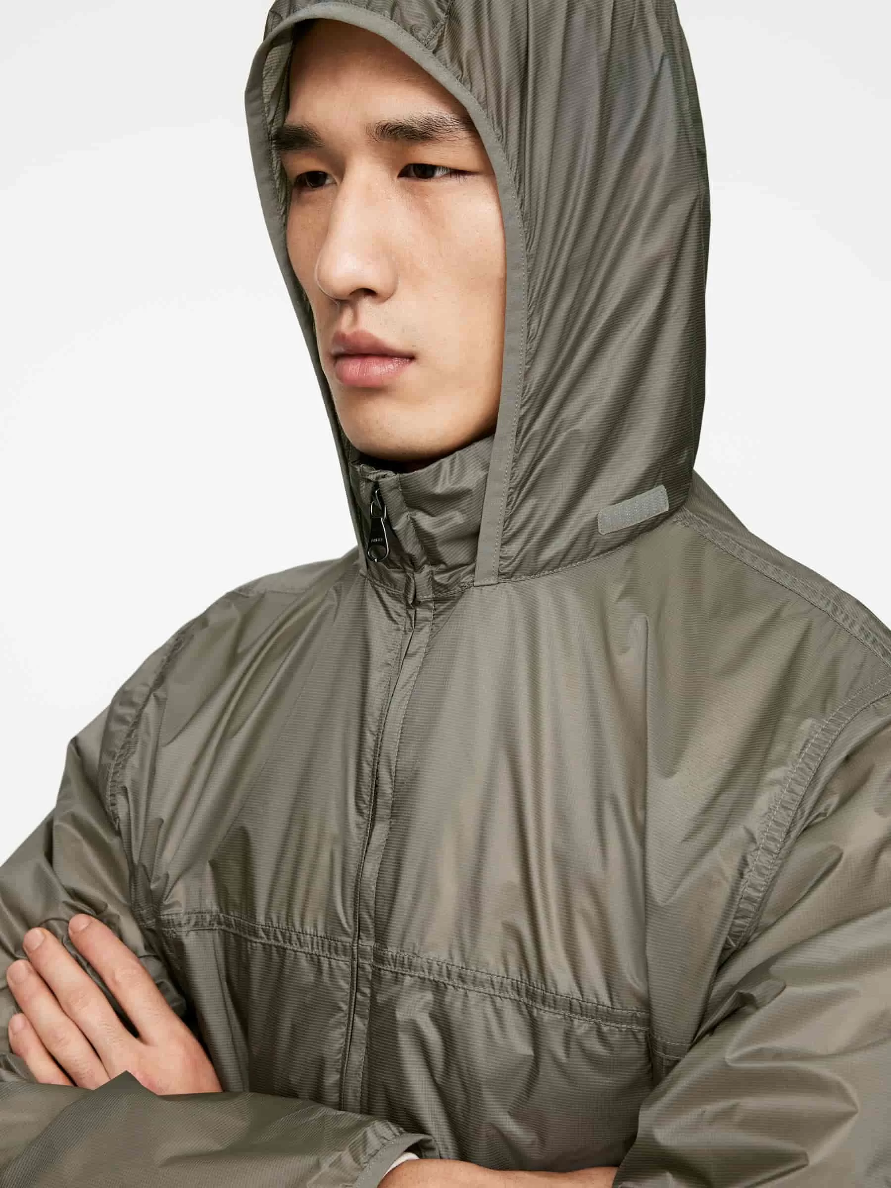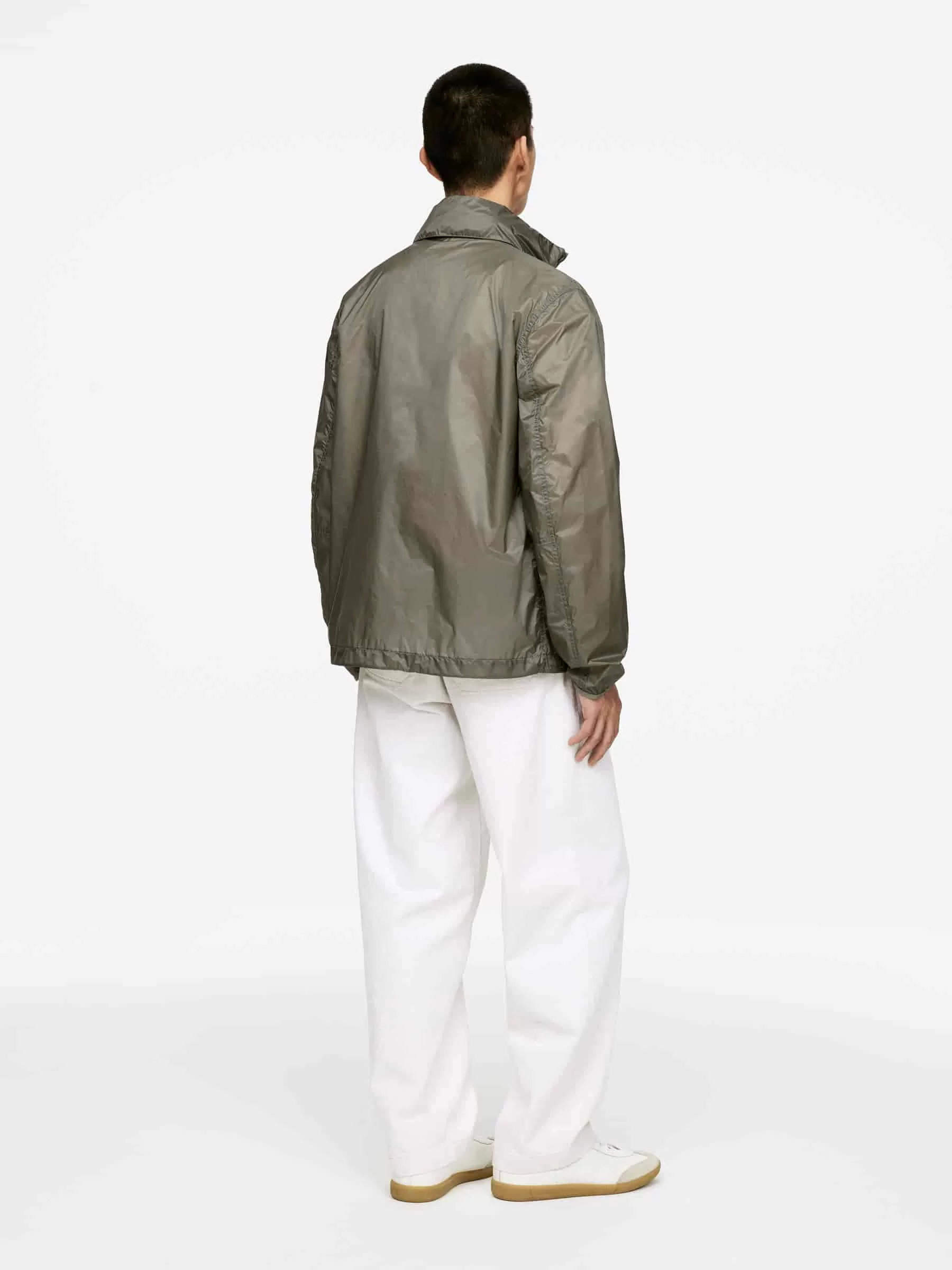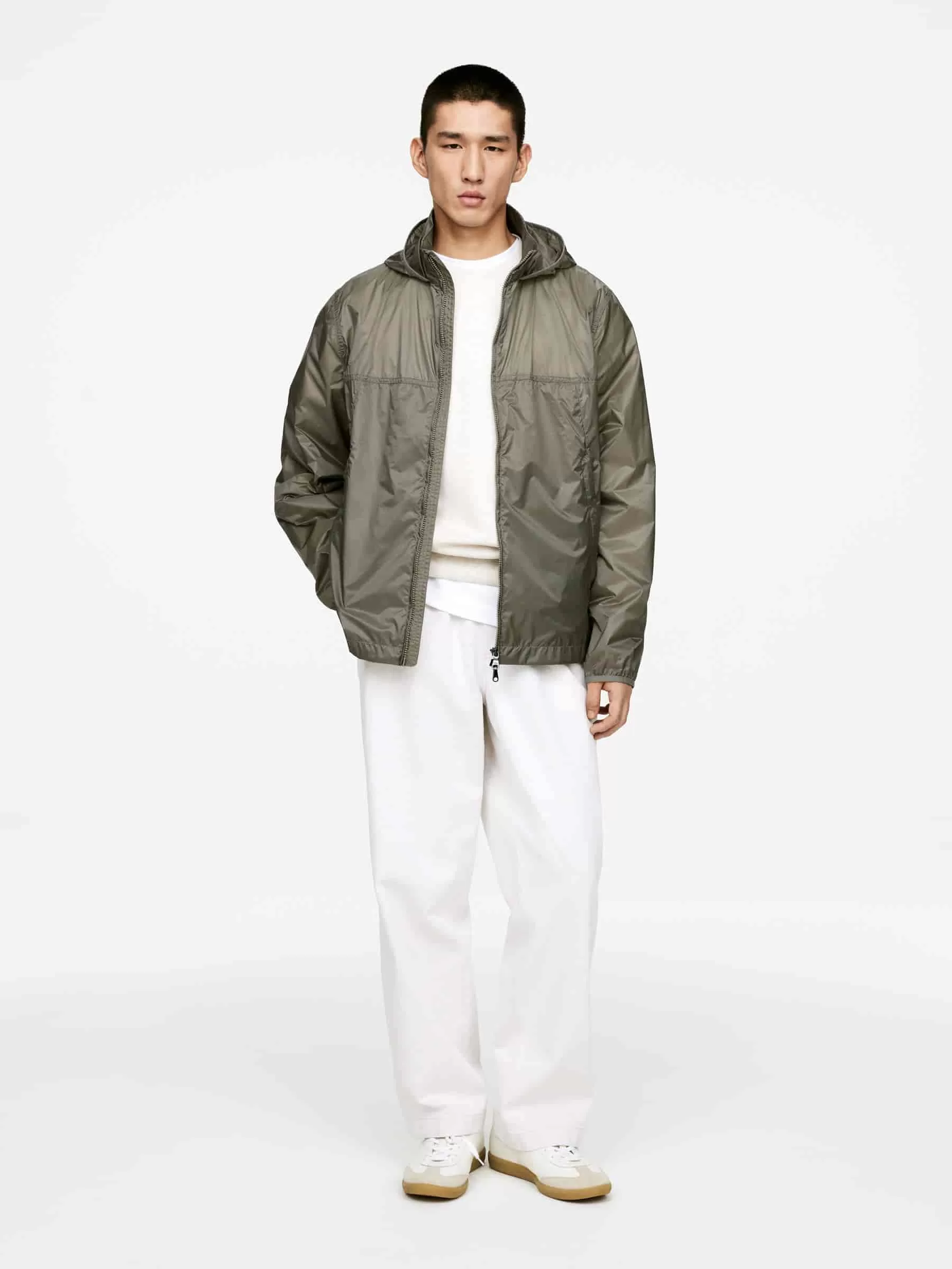 Nylon windbreaker with a two-way zip at front, slanted pockets with zip closure, and elastics at end of sleeves. A hood is tucked away in the high collar. Elastics with adjusters at bottom hemline.