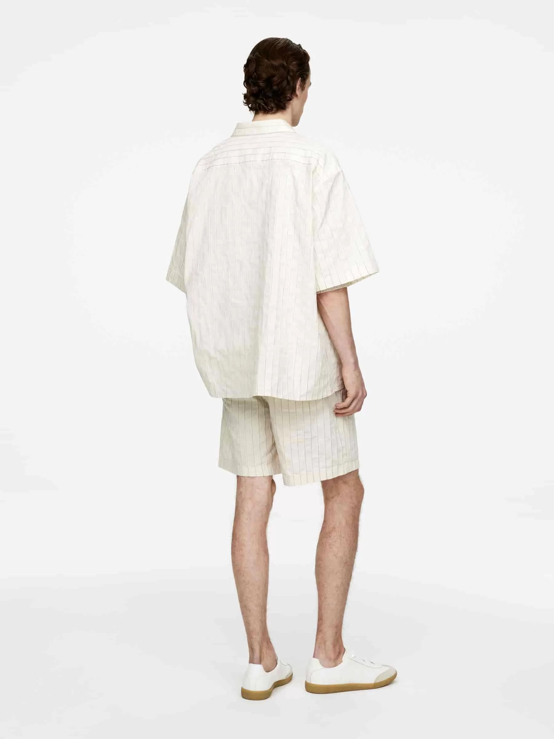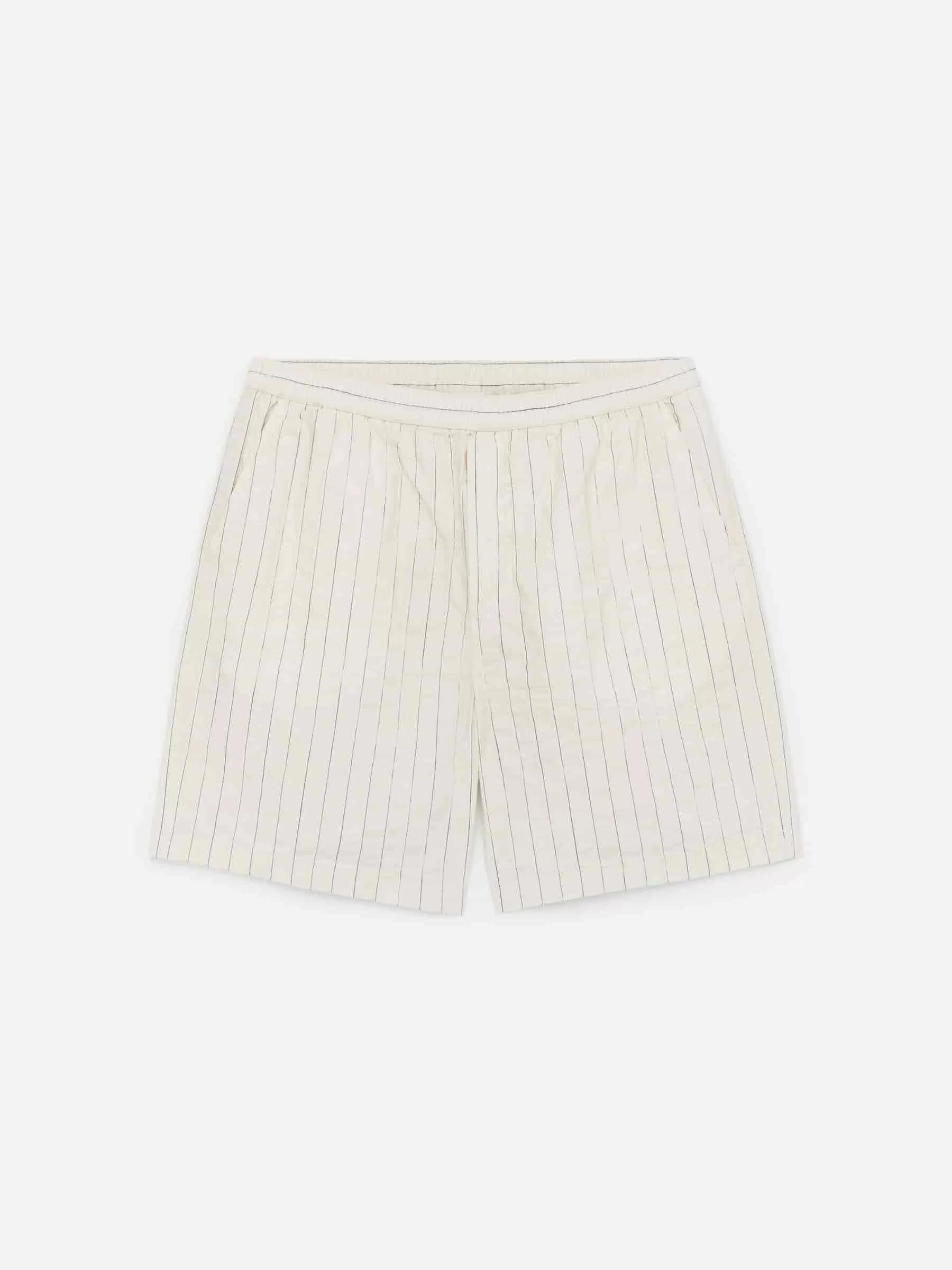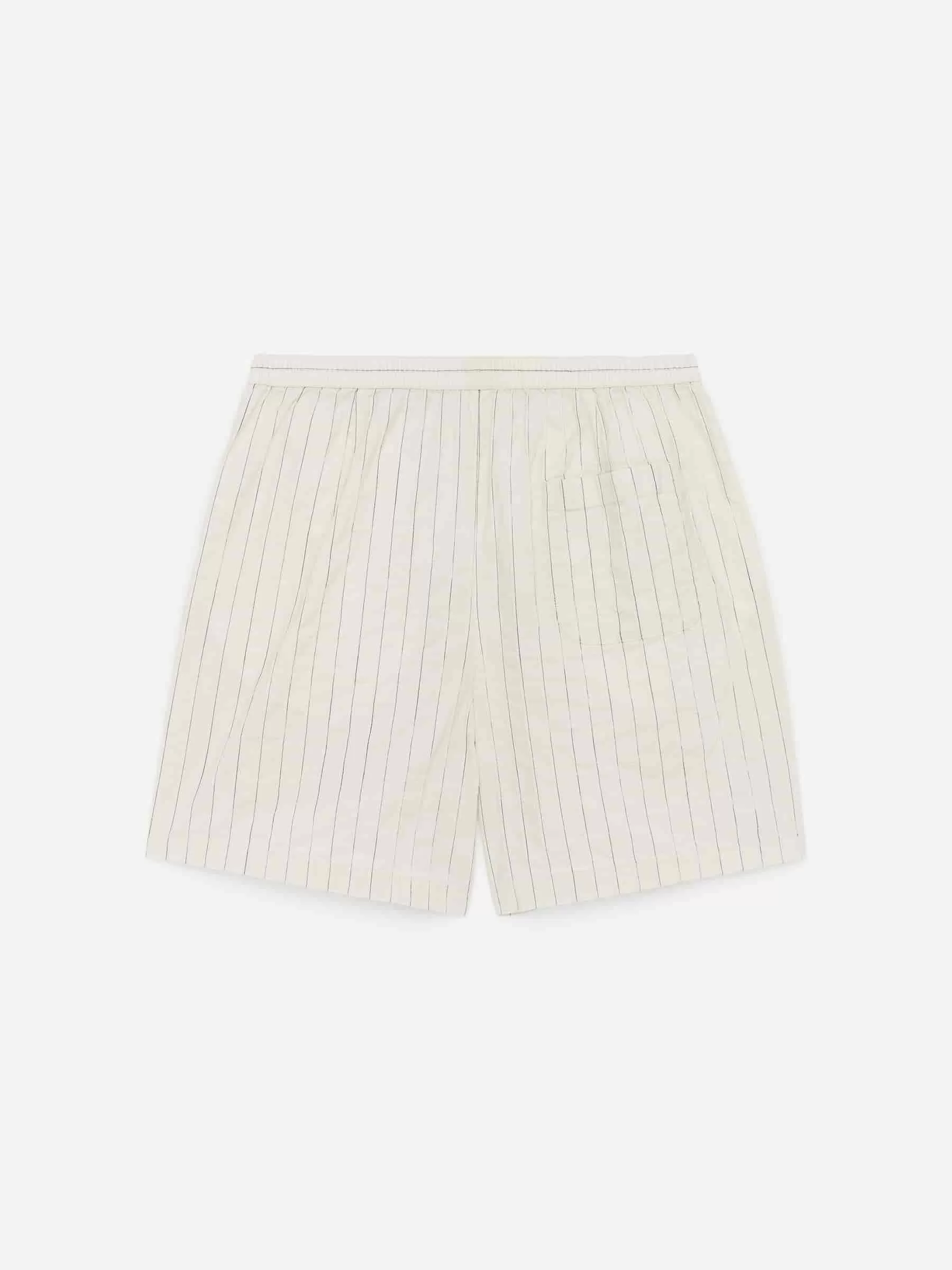 Shorts sewn from a cotton weave. Cut for a regular fit featuring a mid-thigh length. A pull-on style with elastics and drawstring at waist, fake fly, two side pockets and a singular patch pocket at the back. Matching shirt available.