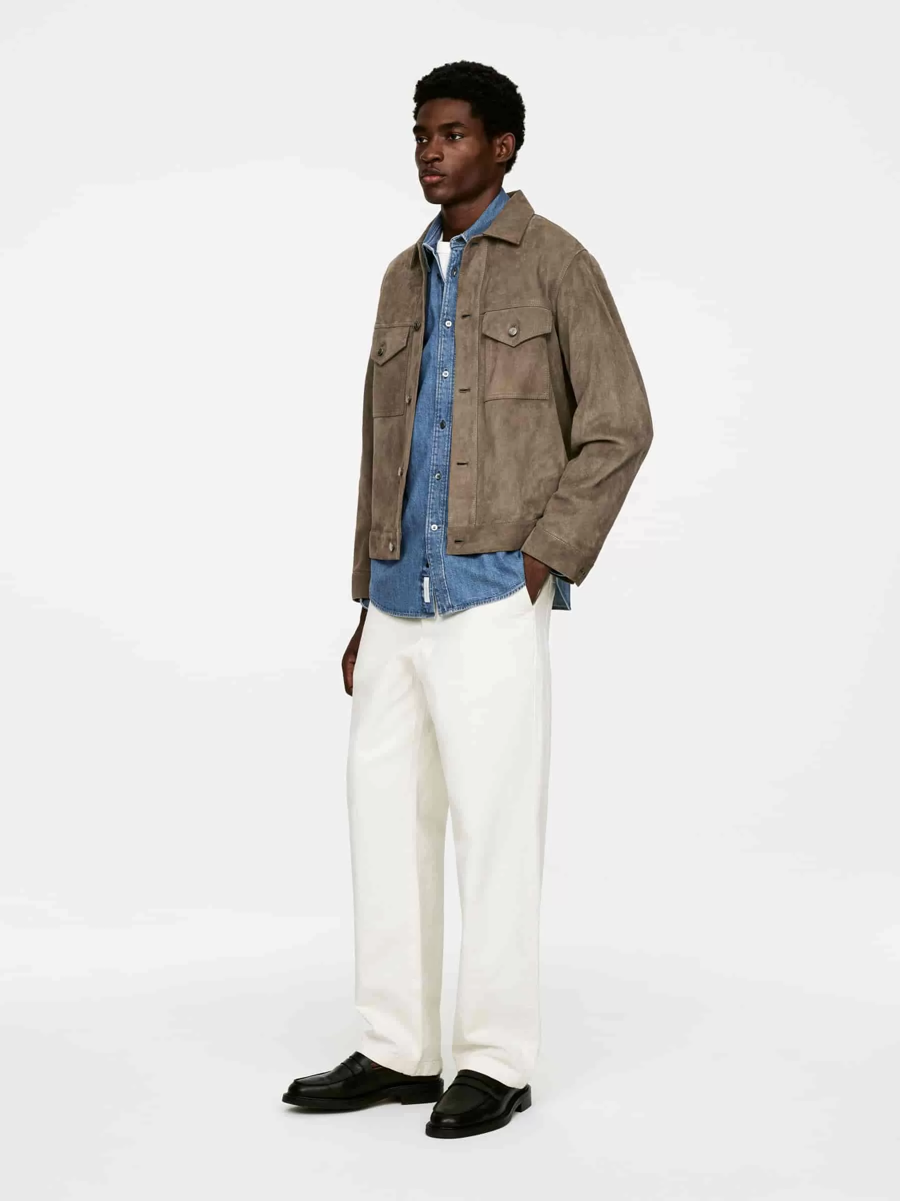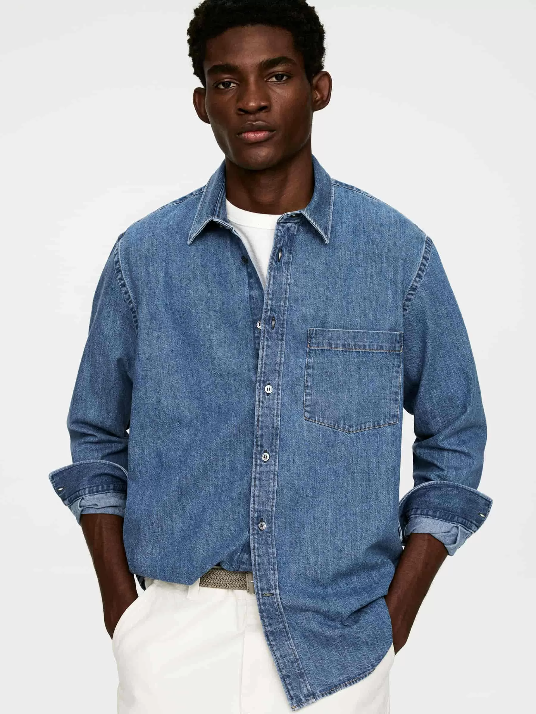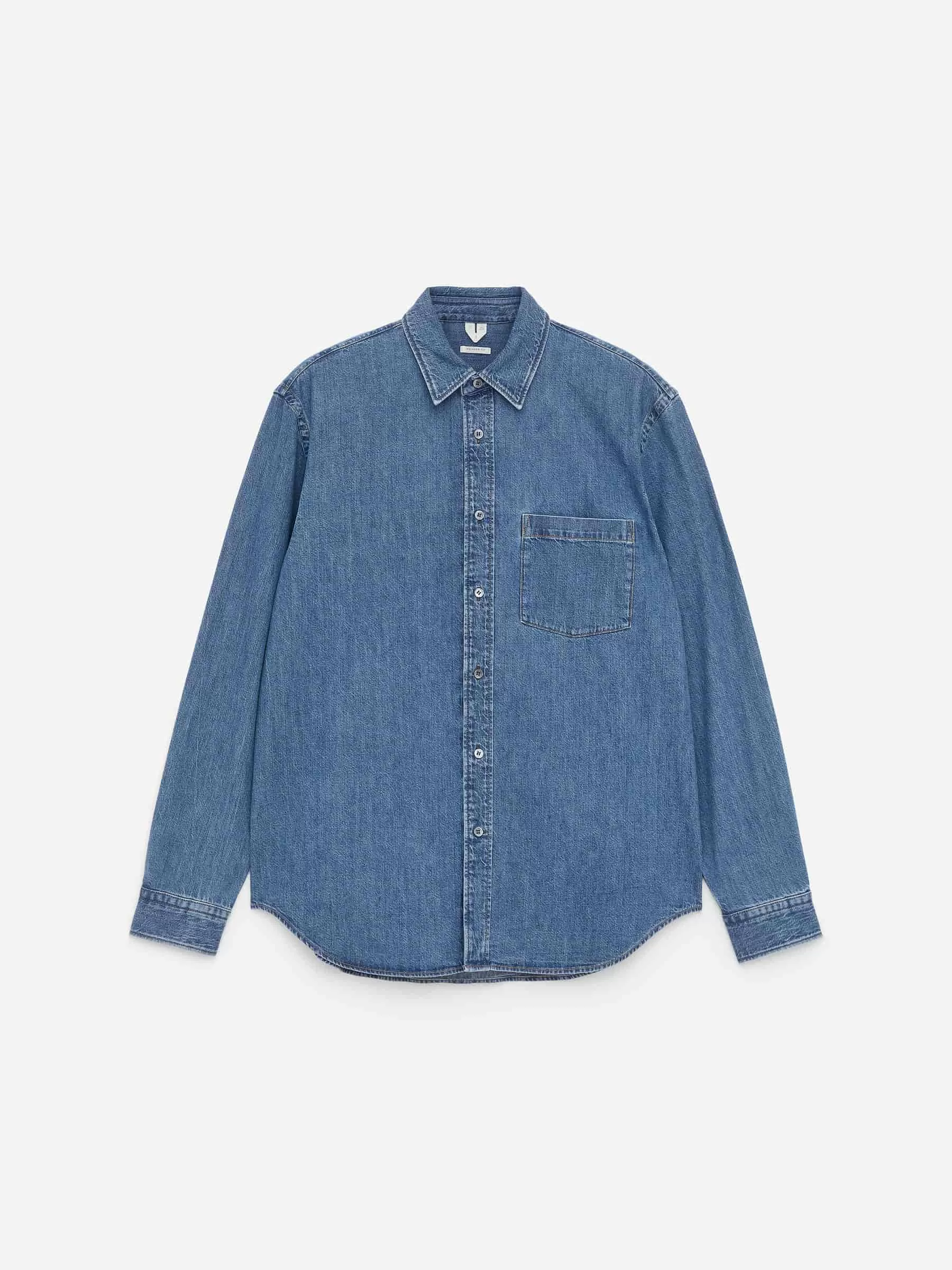 Relaxed-fit denim shirt featuring a chest pocket and buttoned cuffs. Back pleat and mother of pearl buttons.