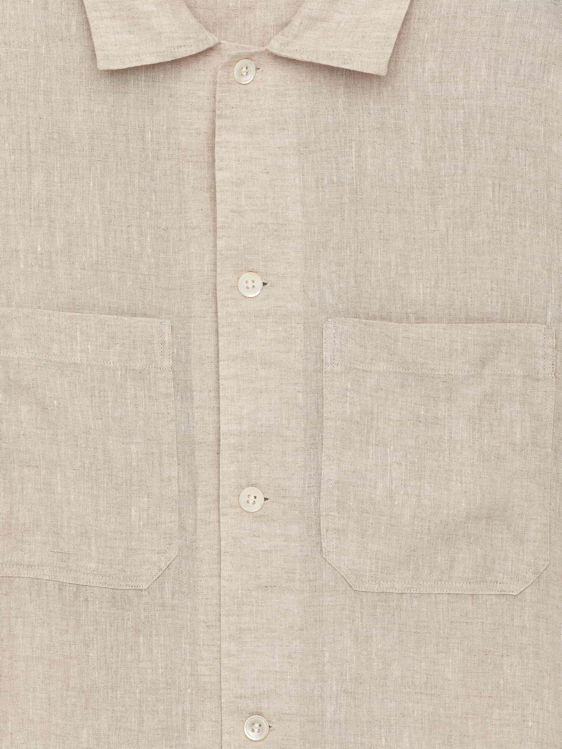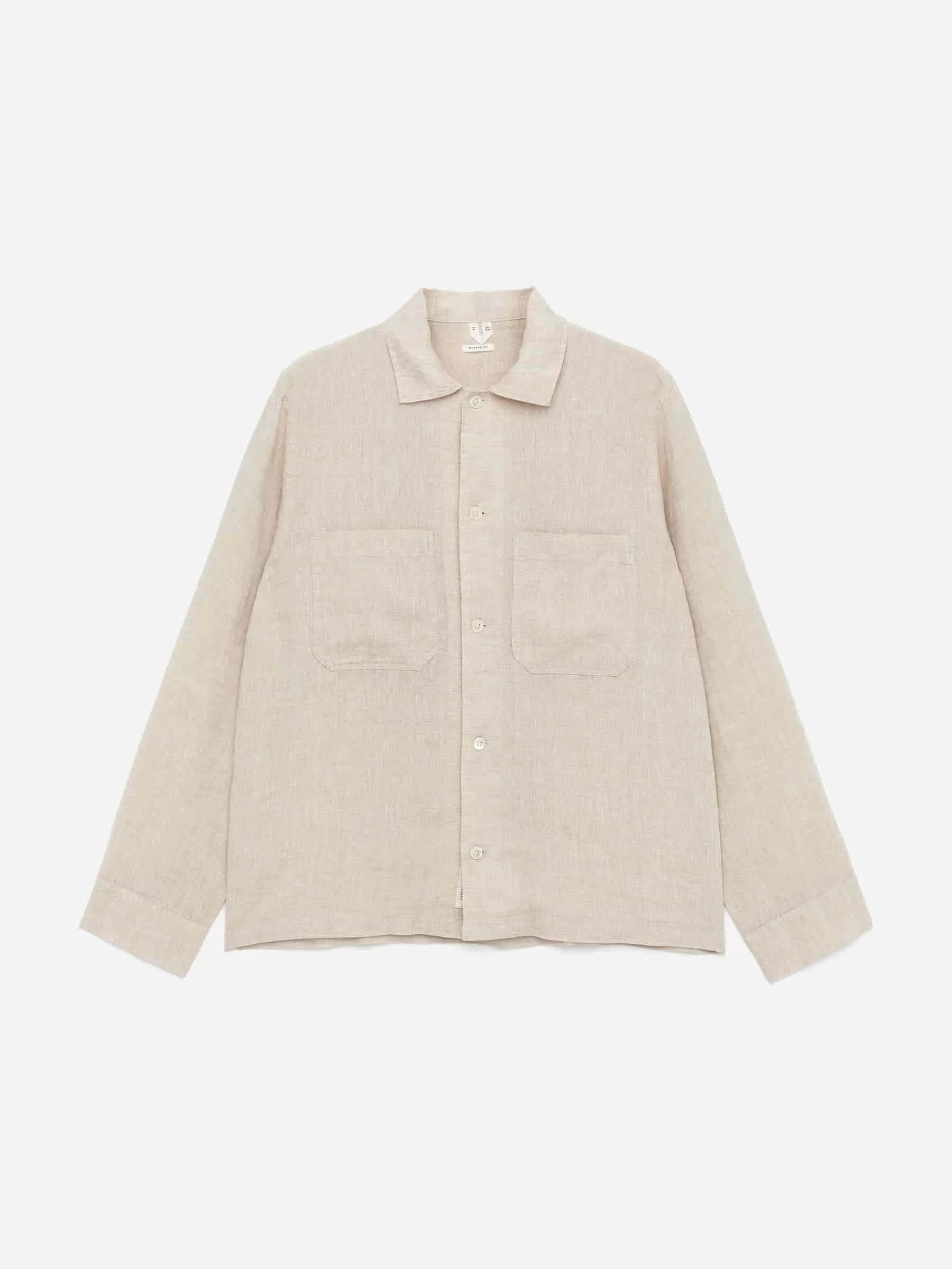 Long-sleeved linen shirt featuring chest pockets and a loose fit.
