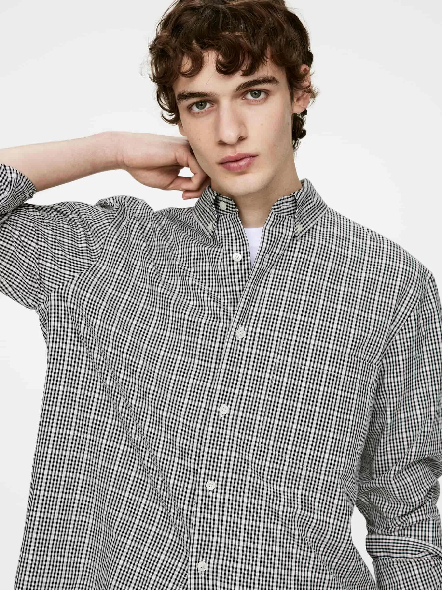 Long-sleeve shirt crafted from a cotton seersucker cloth. Cut for a relaxed fit and styled with a button-down collar, front buttoning and a single chest pocket. Curved hemline.