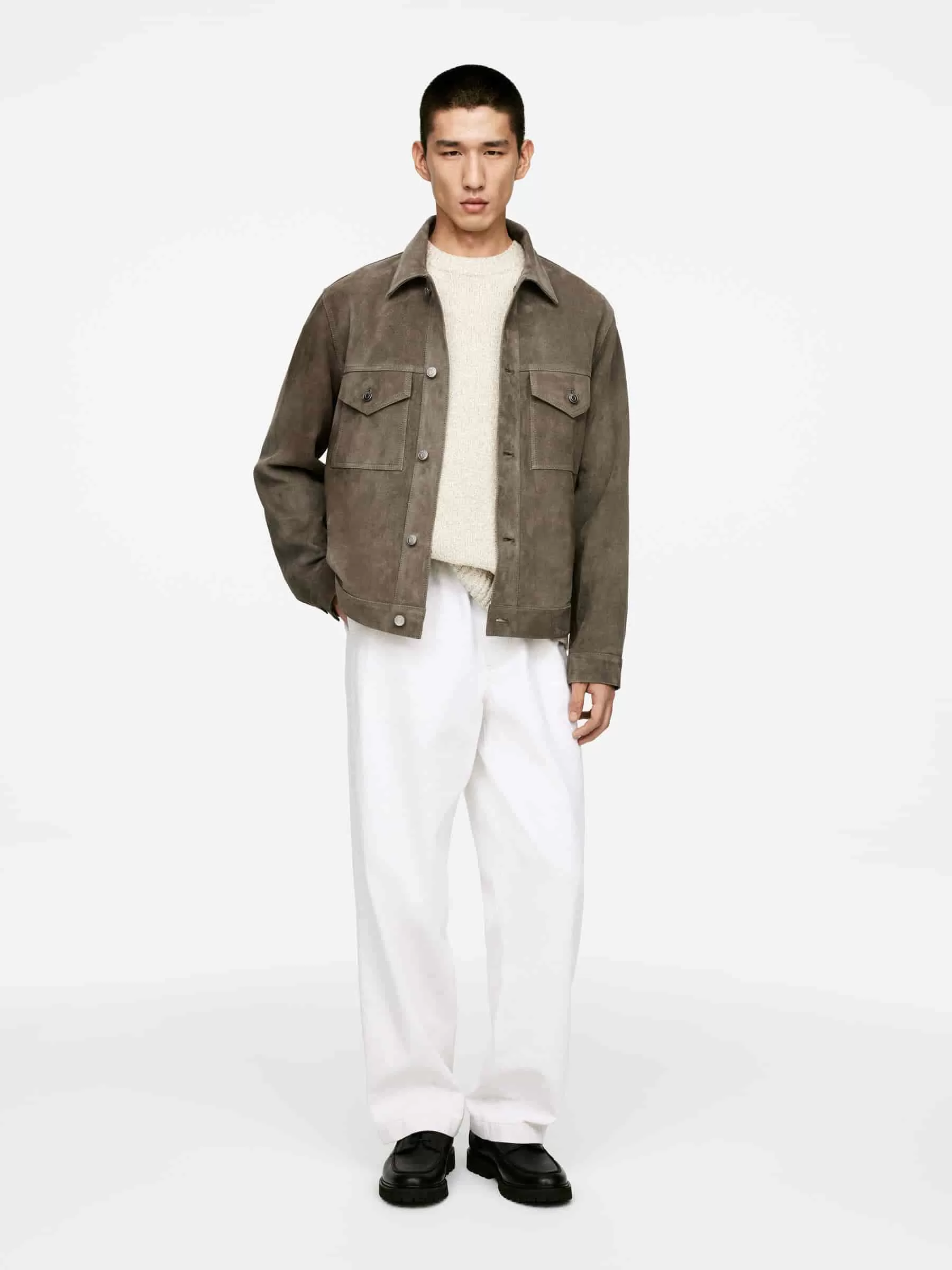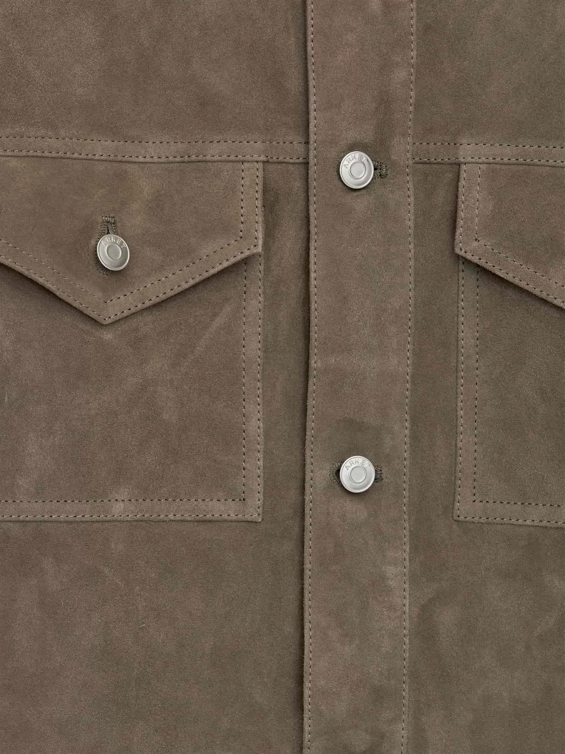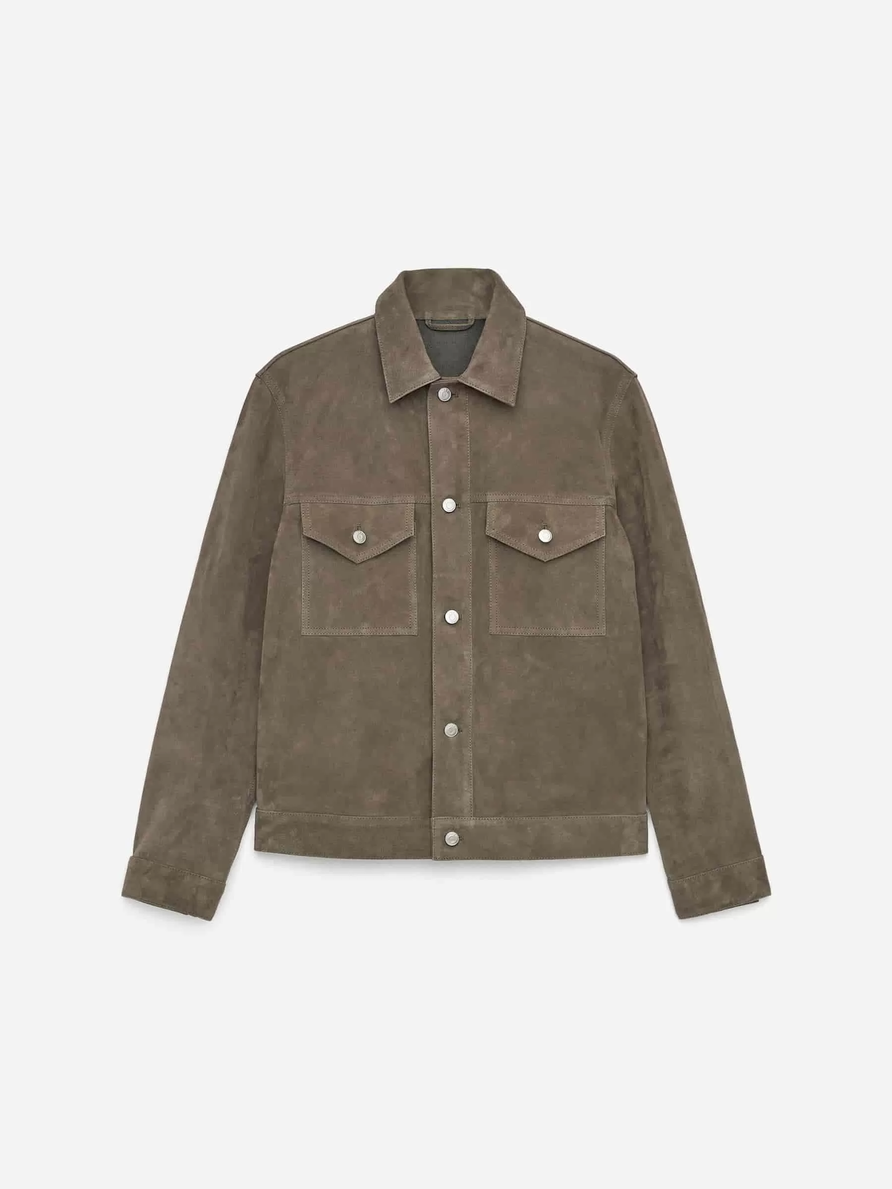 Jacket crafted from chrome-free suede. Styled with shank button closure, chest pockets, and buttoned slits. Regular fit.