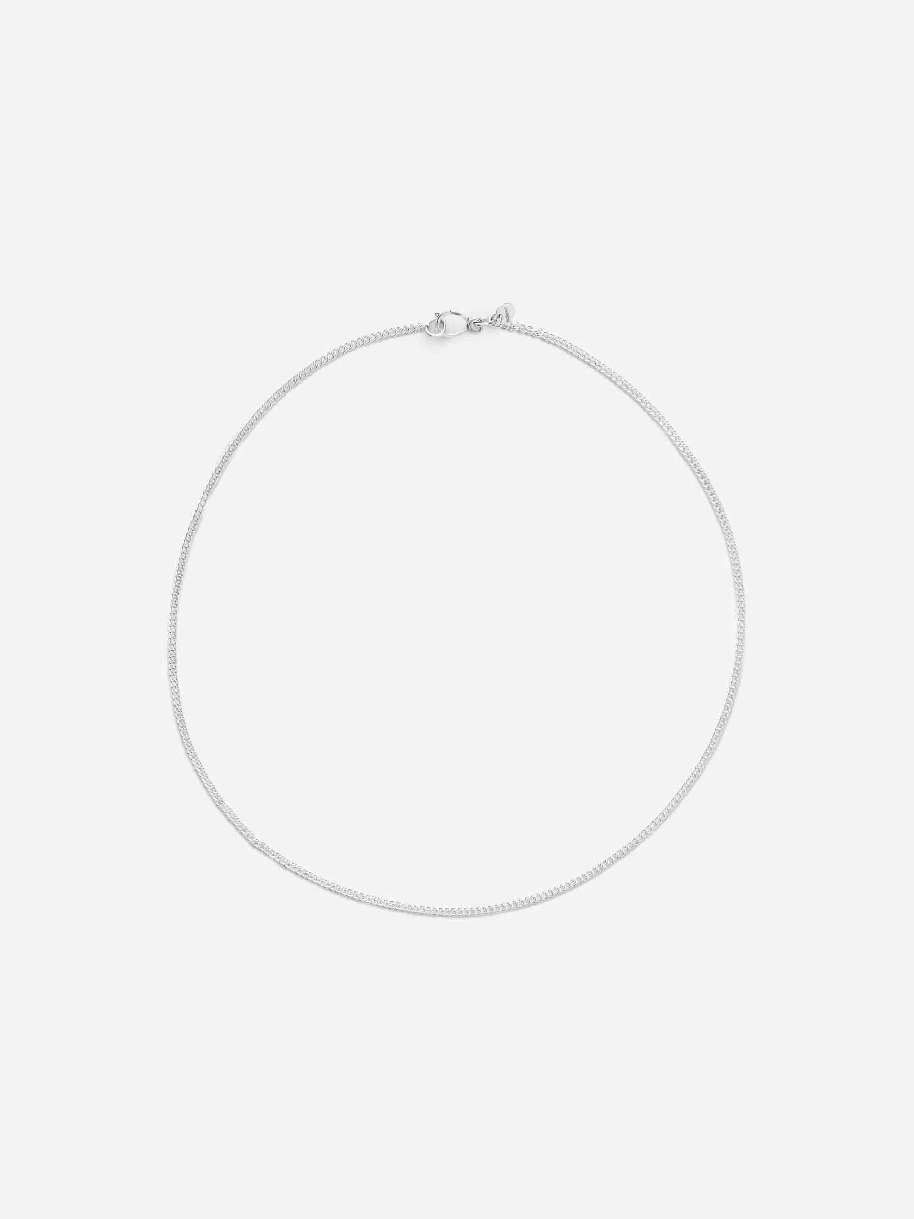 Thin chain necklace in sterling silver. The silver is unplated which makes it easy to polish with any silver polishing cloth. Length 52 cm. Clasp closure.