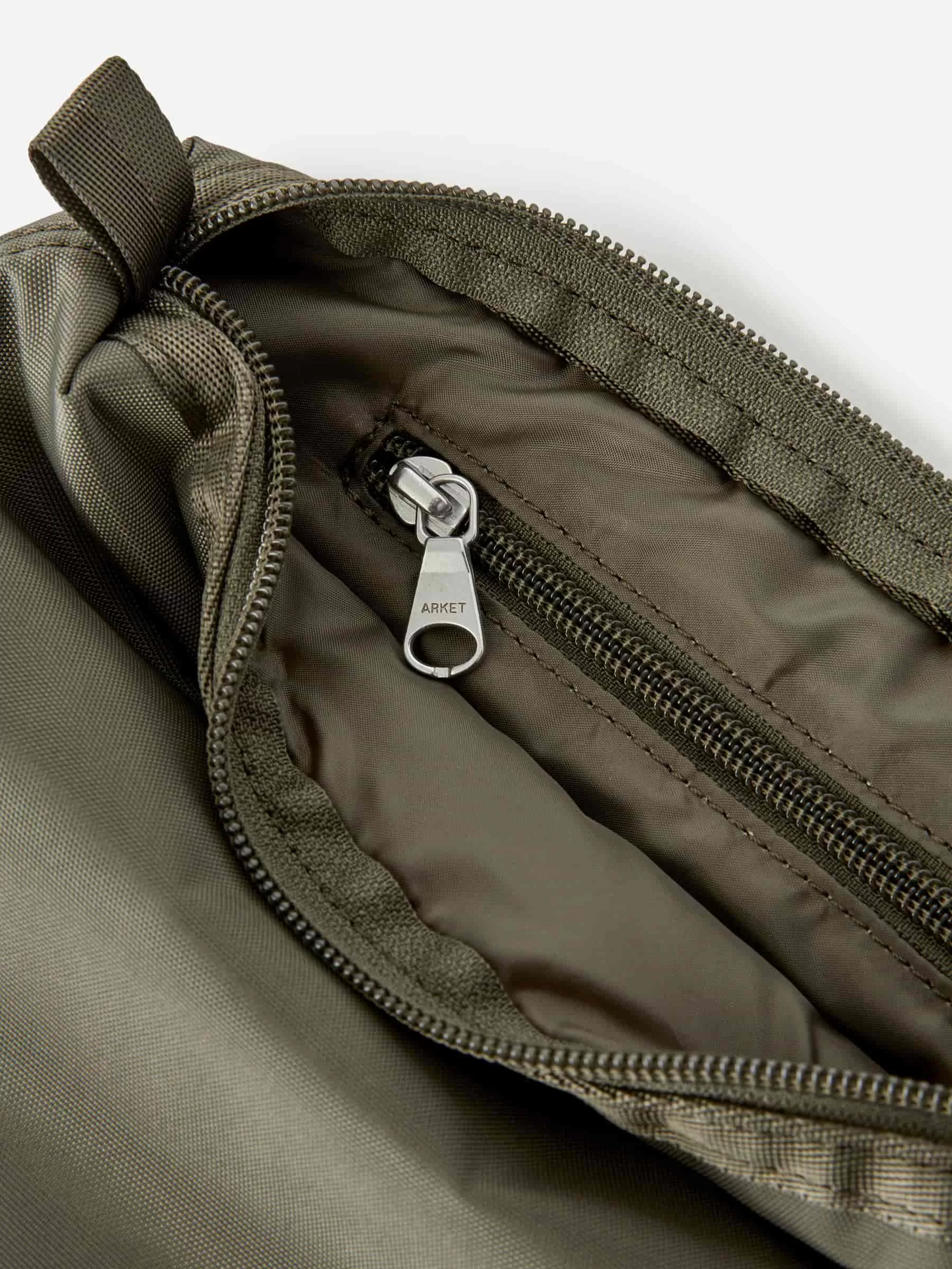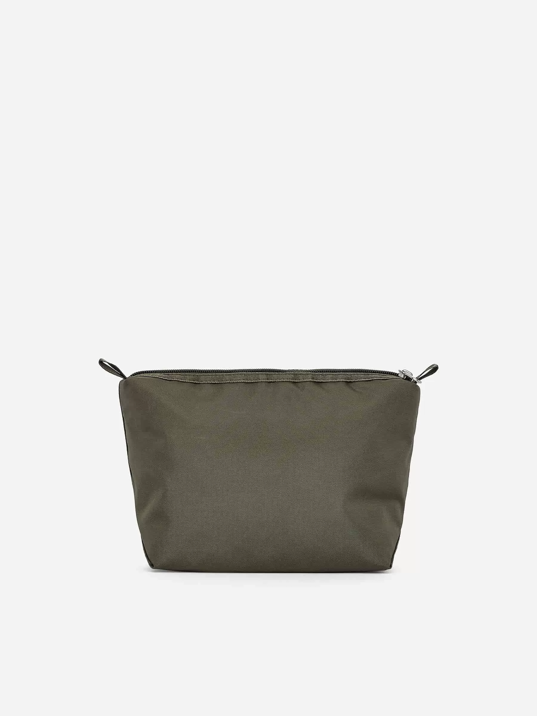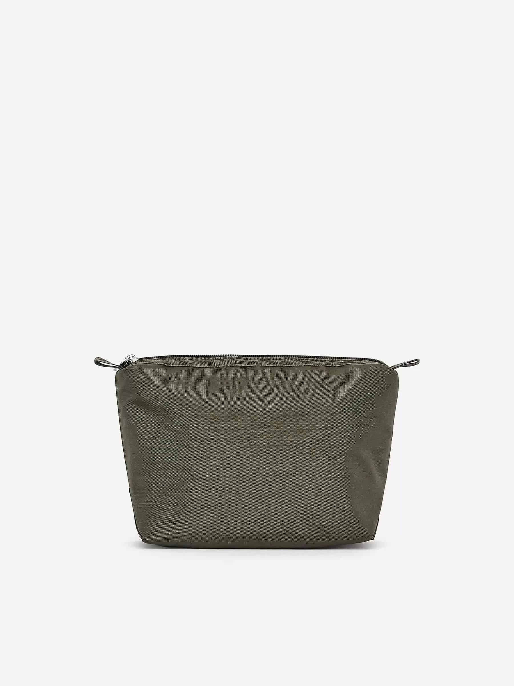 Medium-size toiletry bag, designed for easy storage and inside-out protection. Crafted from a durable fabric made of recycle polyamide, the bag is detailed with a top zip closure. The inner compartment holds a zip pocket for small items. Dimensions 20 cm x 16.5 cm x 10 cm.