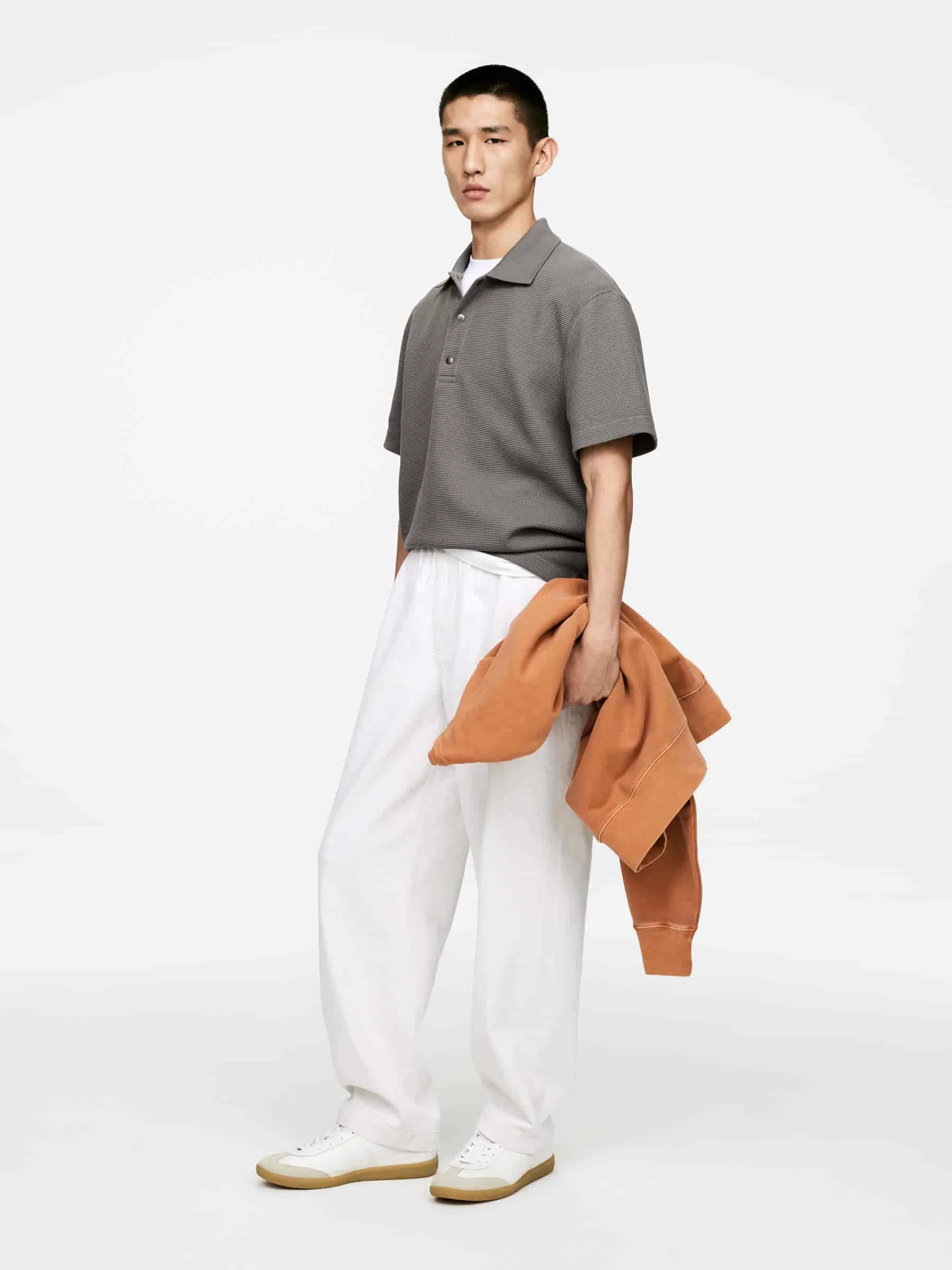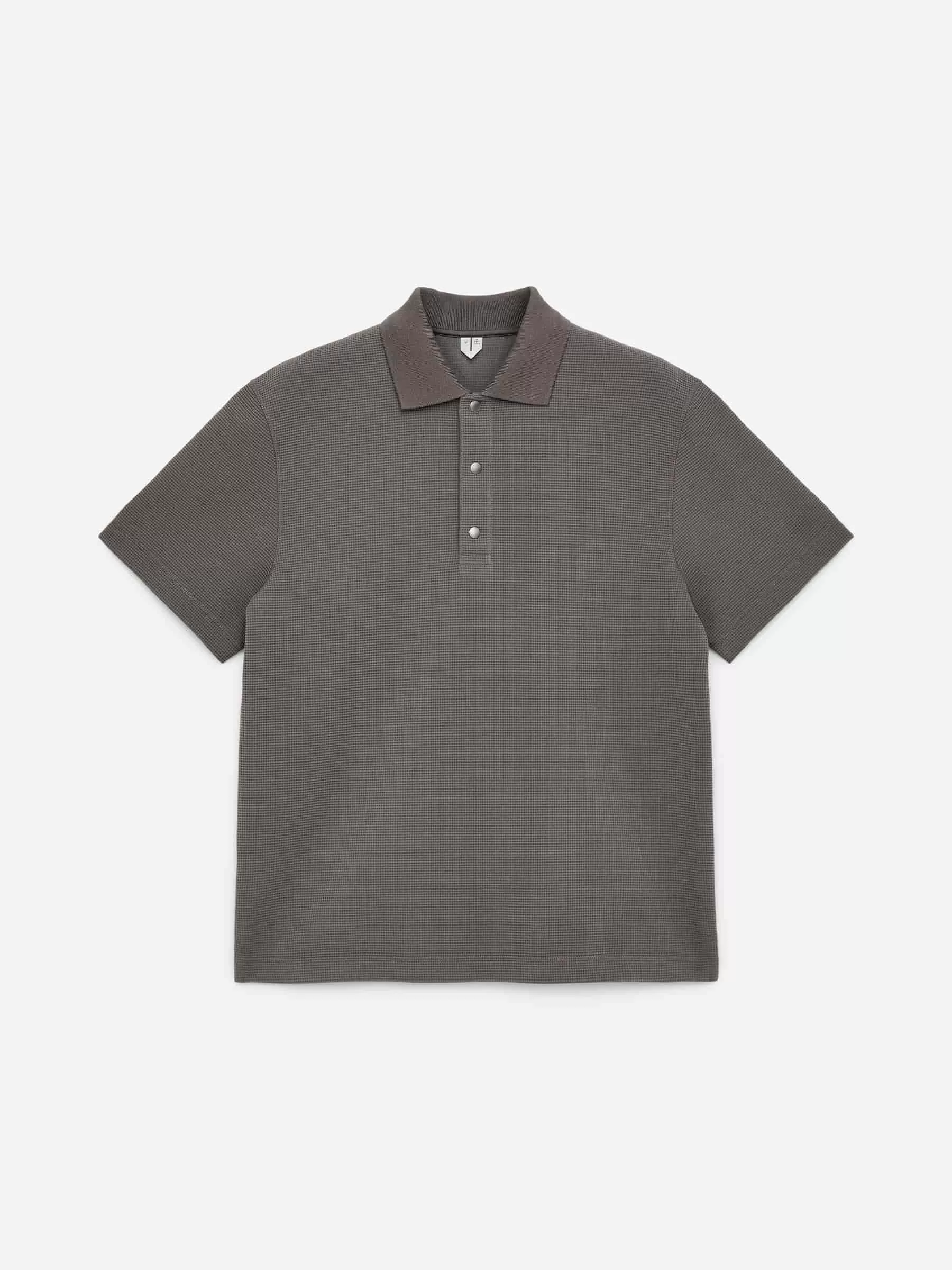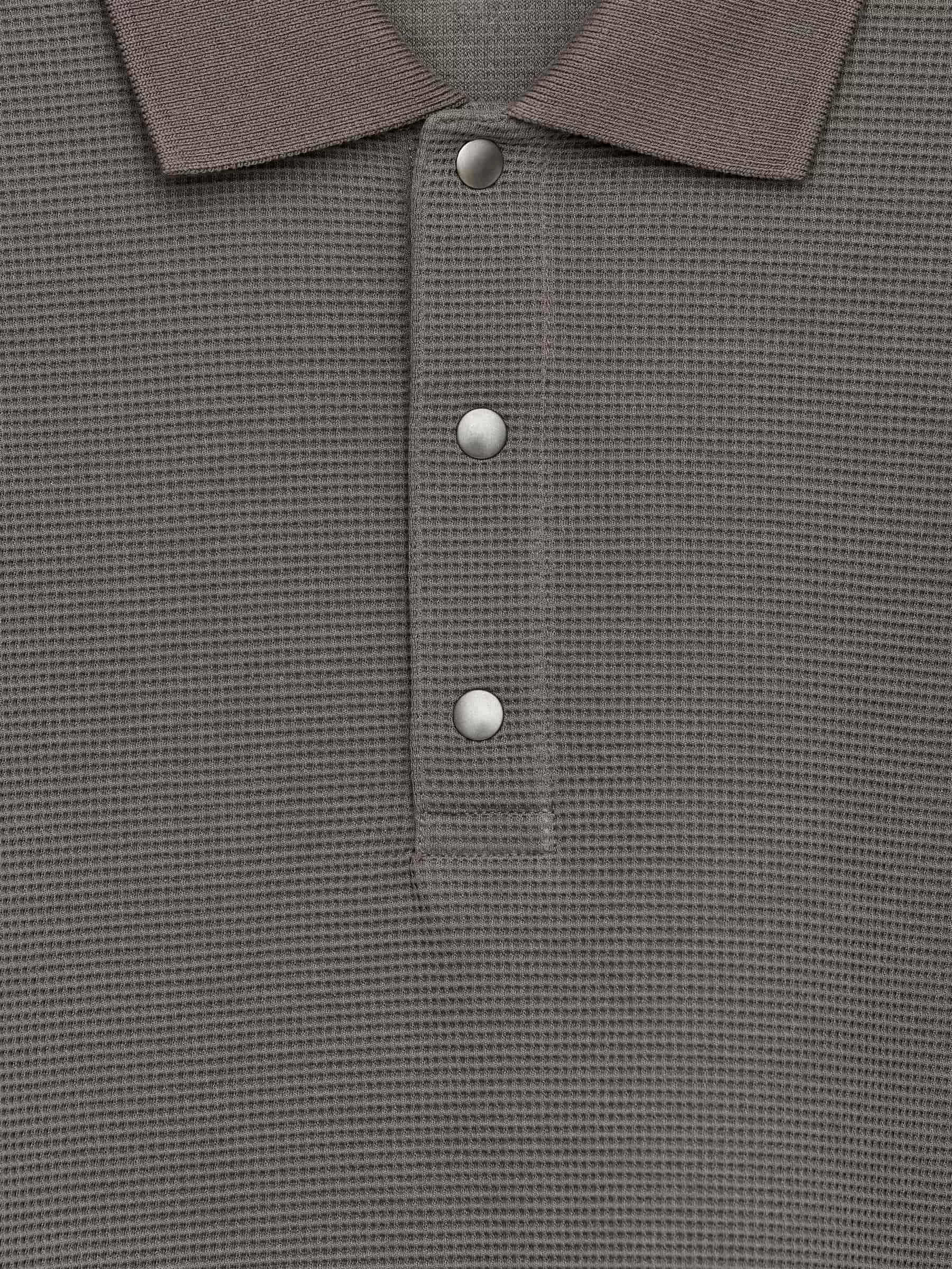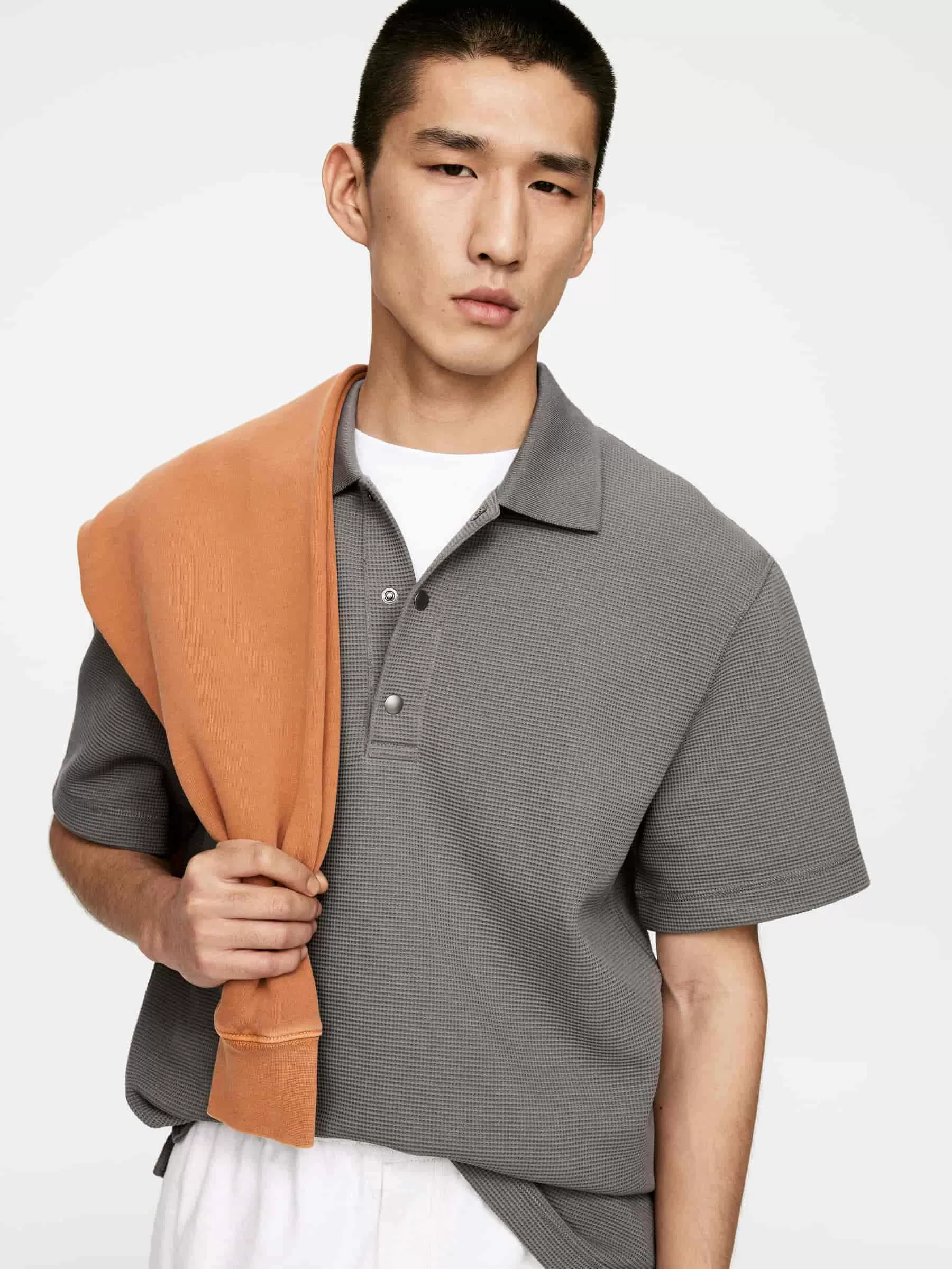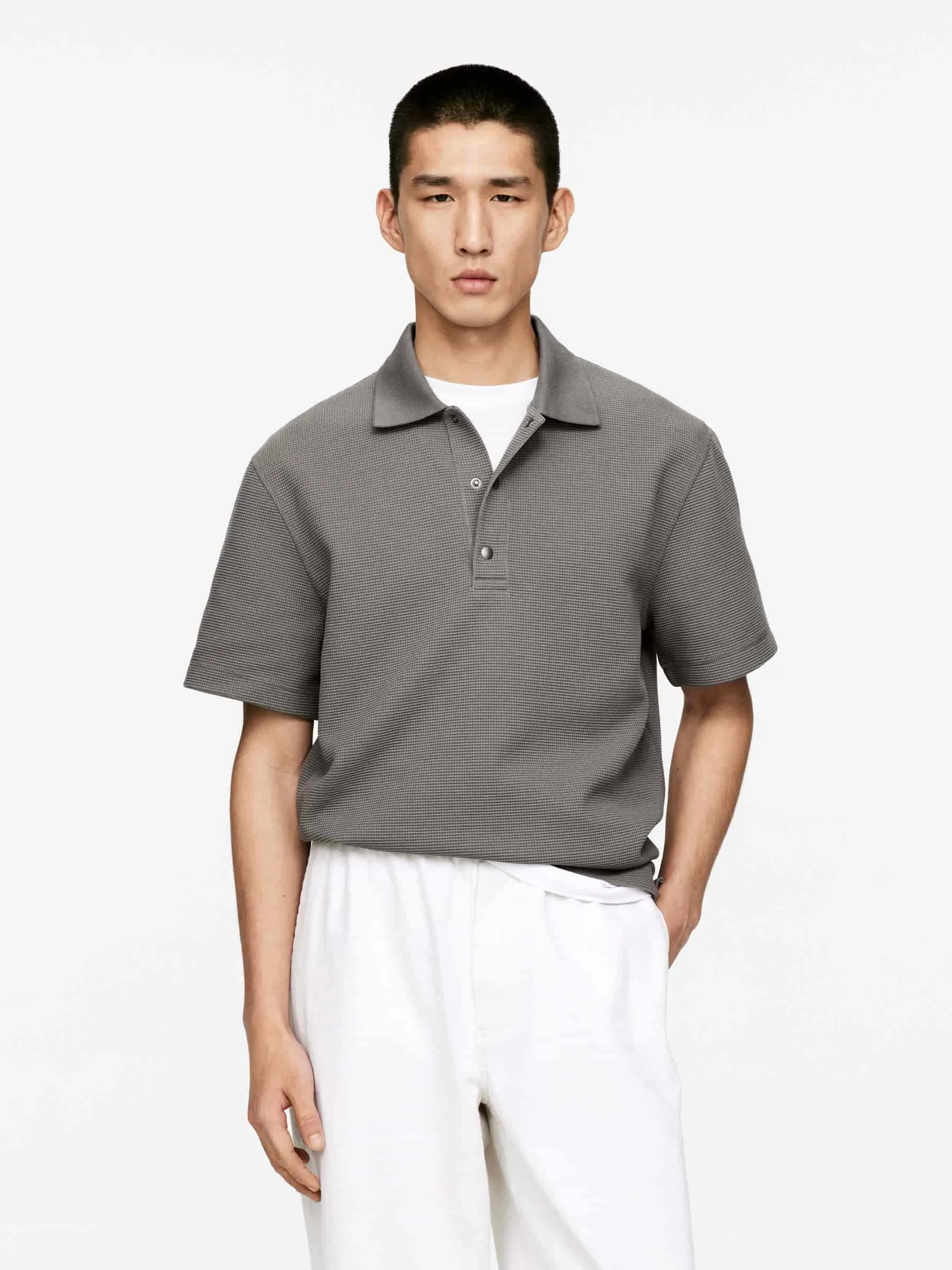Short-sleeve polo shirt crafted from a stretchy jersey cloth featuring a waffle texture. Styled with a ribbed collar and a half placket with snap button closure. Slits at side seams.
