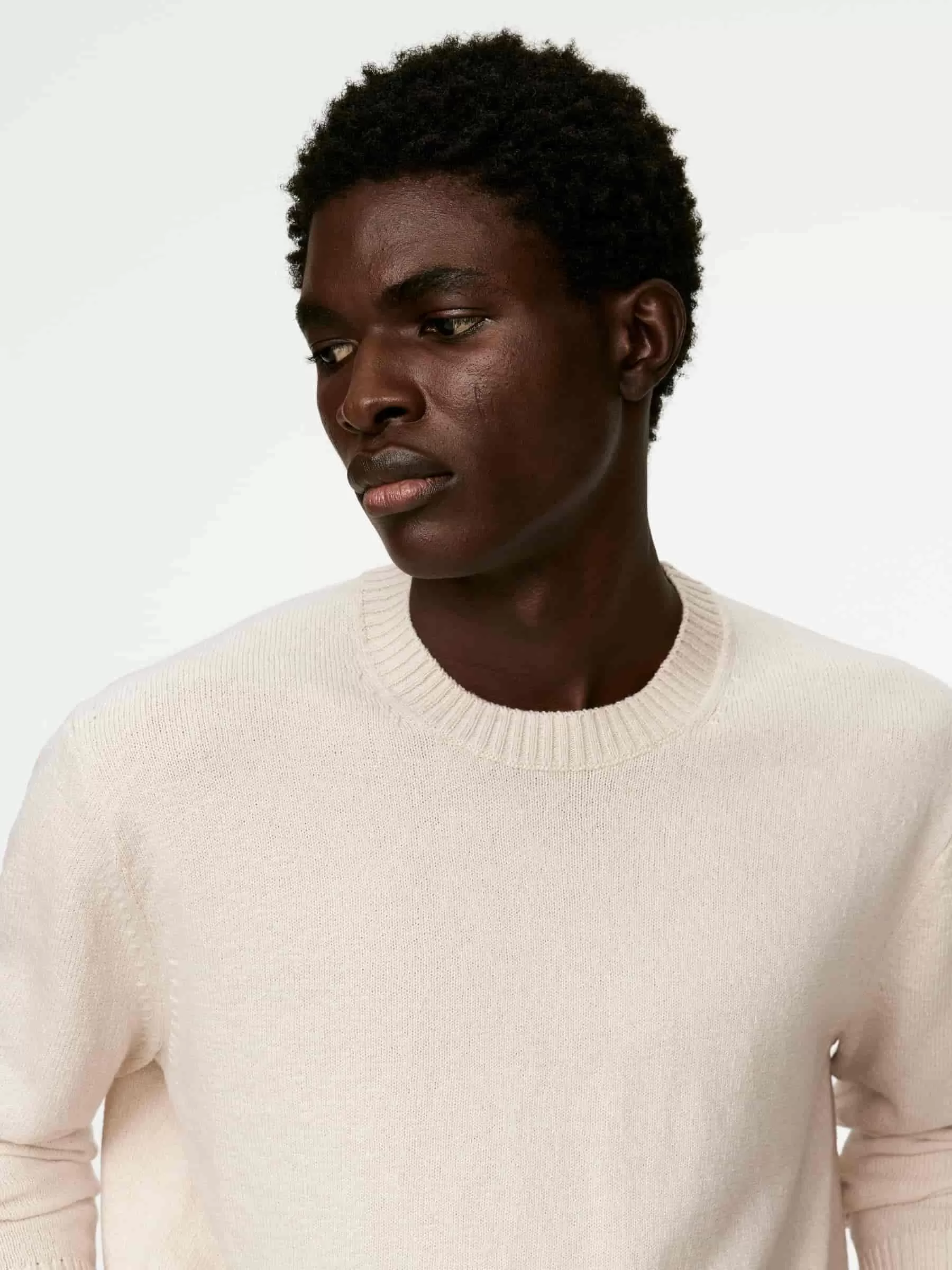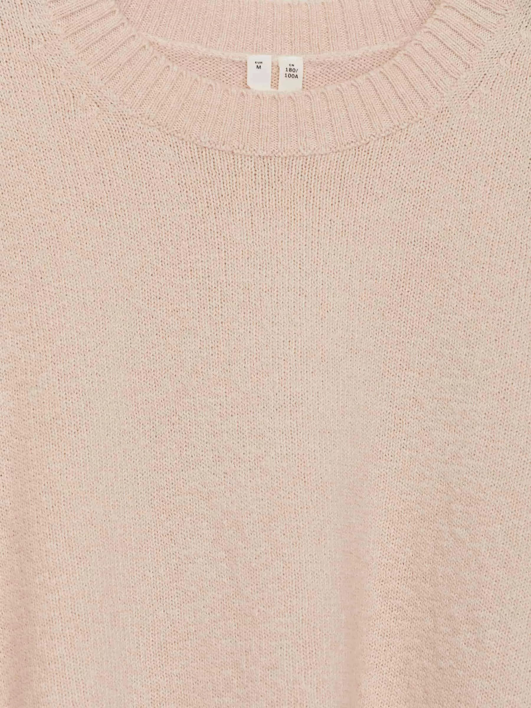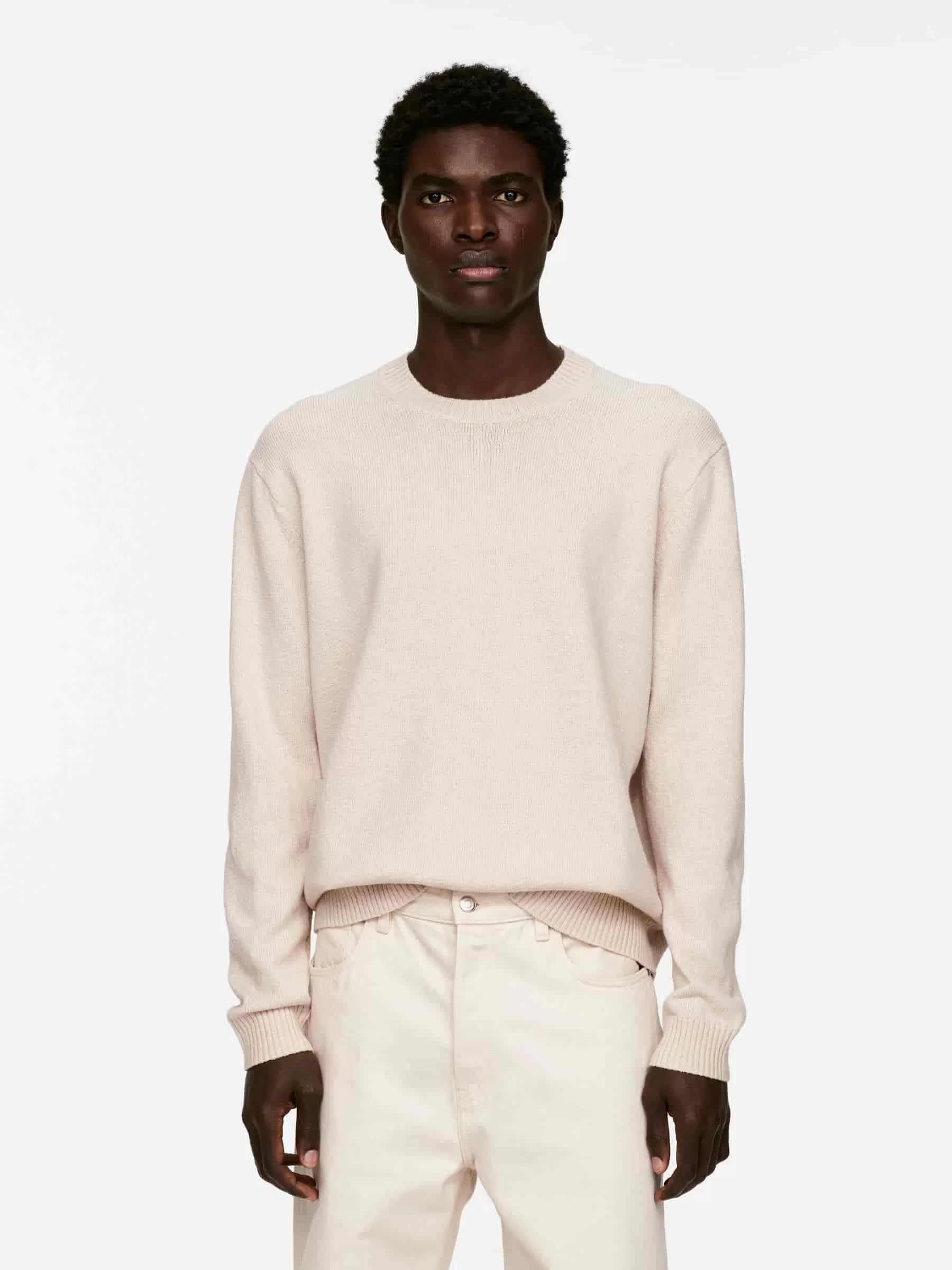 Crew-neck jumper plain-knitted from a wool-cotton yarn with a slightly irregular texture. Ribbed trims. Regular fit. The style contains 60% RWS wool (TE-00047206). Products certified to the Responsible Wool Standard (RWS) contain wool fiber from farms independently certified to animal welfare and land management requirements.