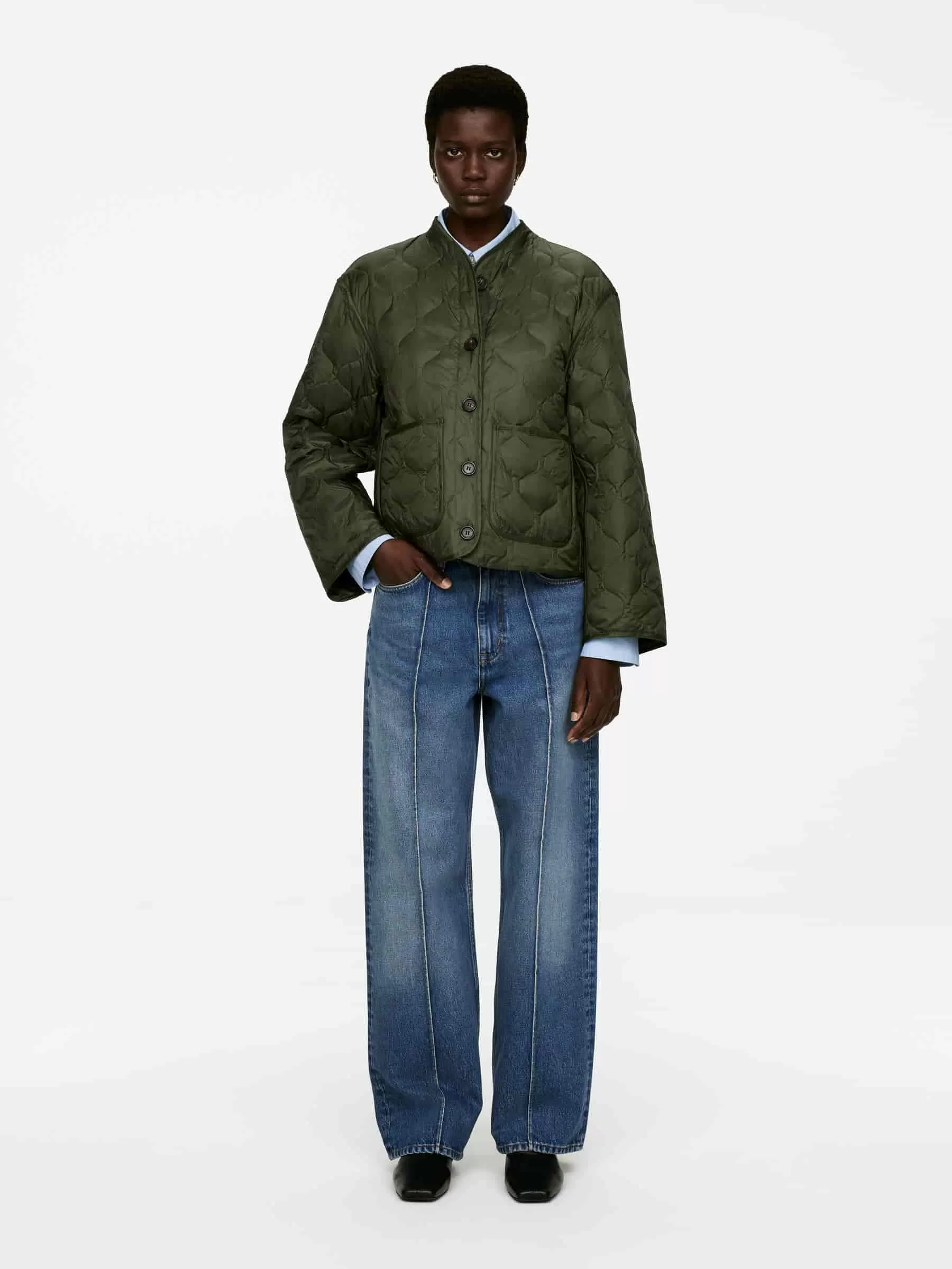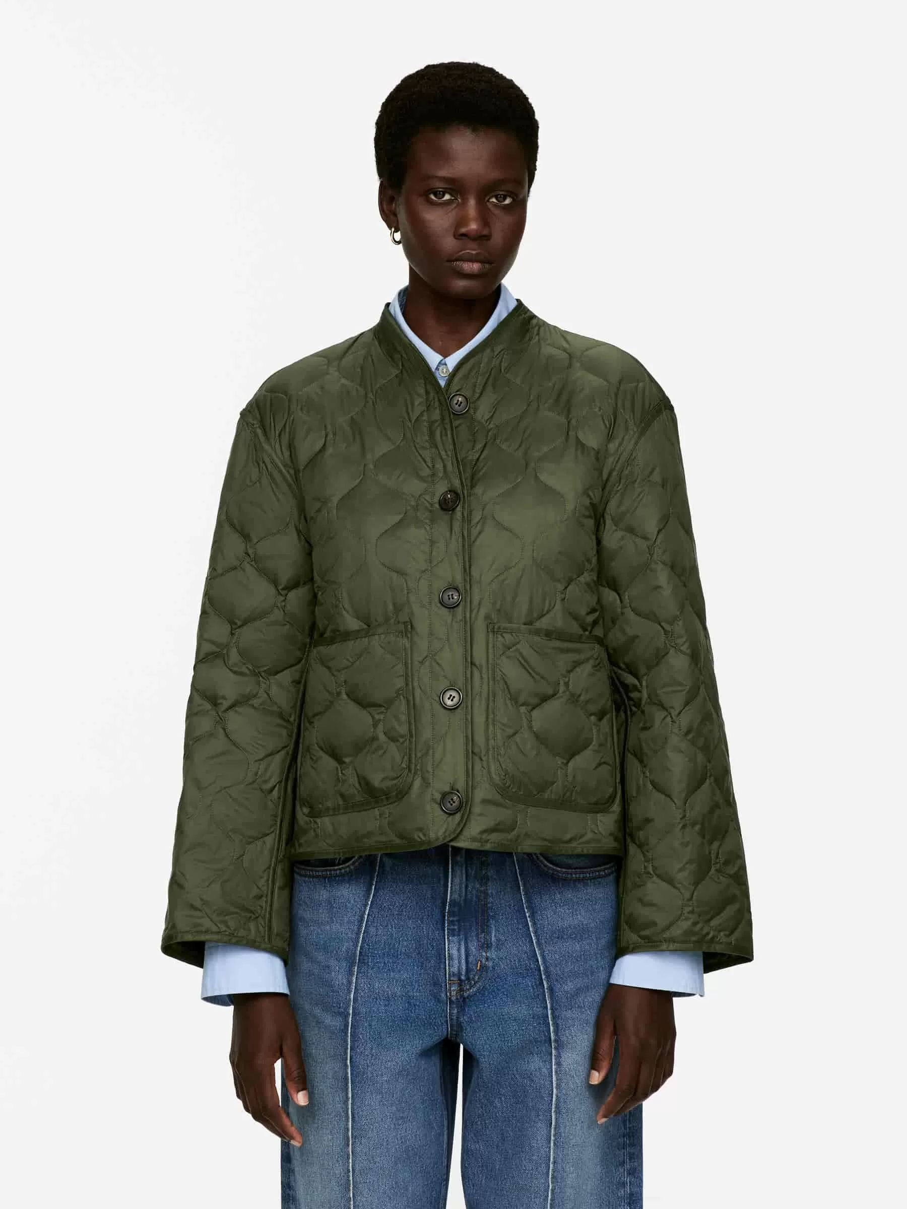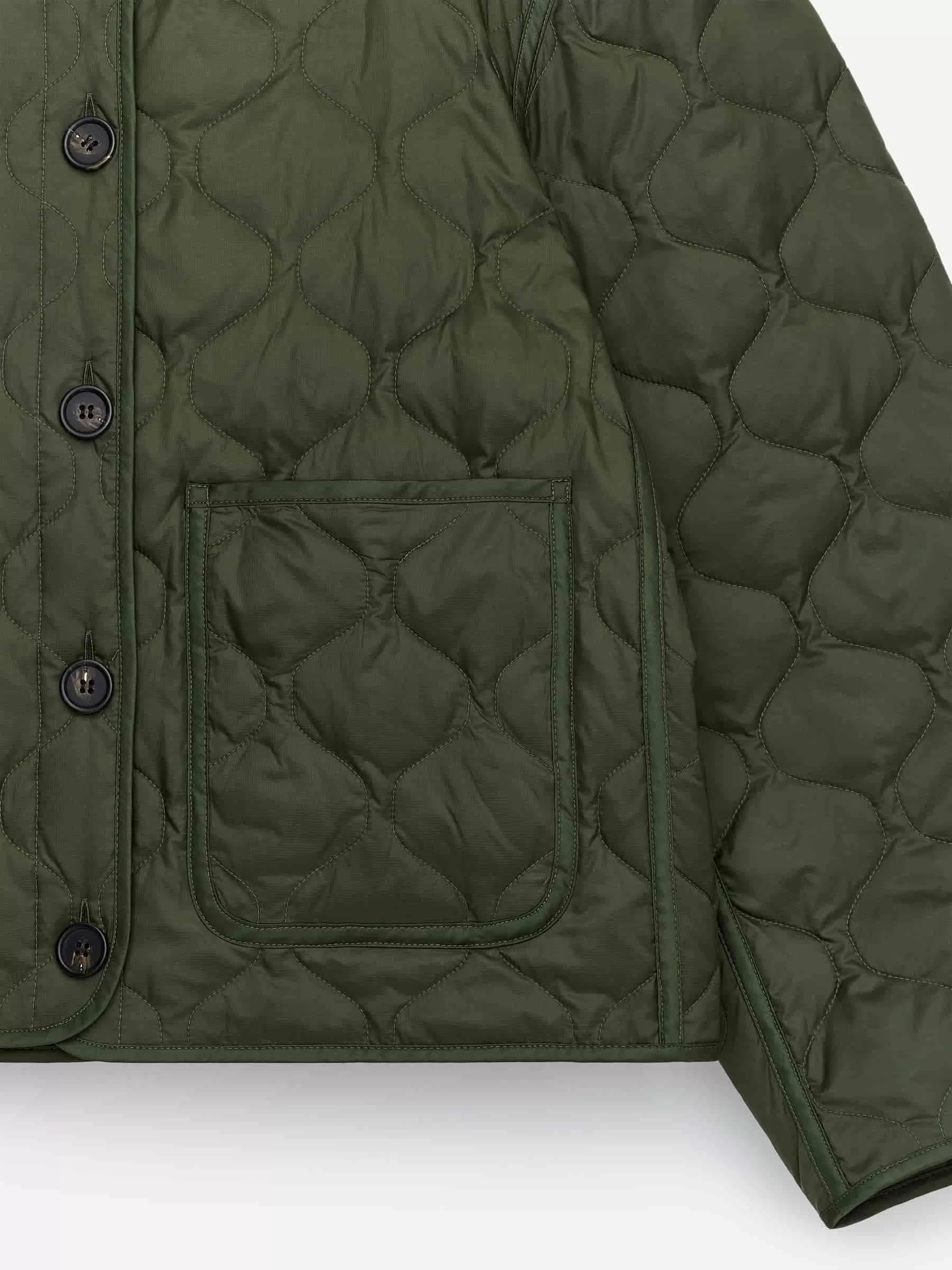 Quilted liner jacket filled with a blend of down and feathers. Patch pockets at front and button closure. Part of the 2-in-1 Series, a modular outerwear system that includes shells and insulating liners specifically designed to be snapped together, forming a fully padded coat. The Upcycled Down products are filled with recycled down and feathers sourced from Re:Down®. These materials, collected from used textiles, are washed and sterilised at high temperatures without the use of chemicals.