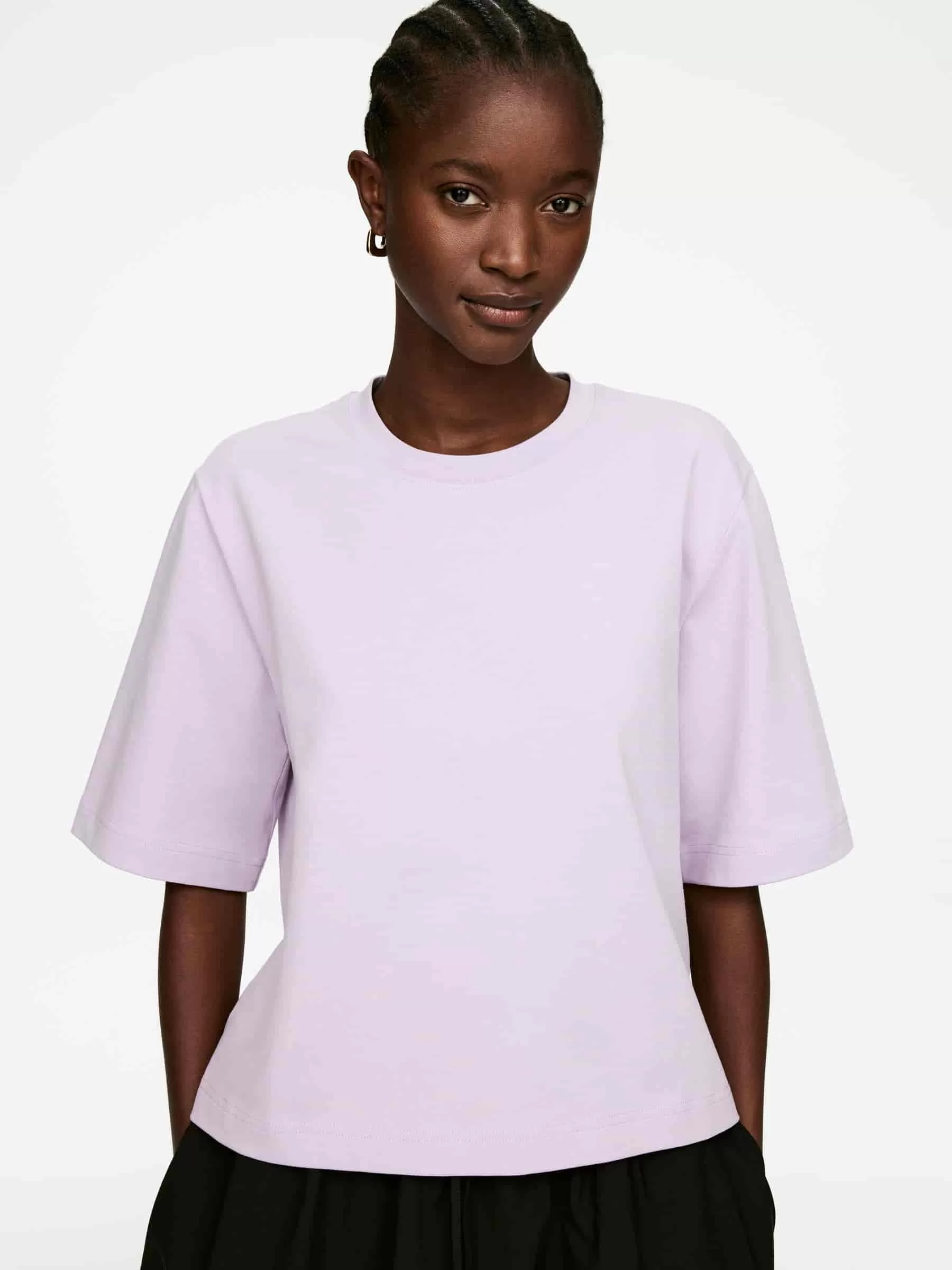 T-shirt crafted from a sturdy cotton single jersey. A short-sleeve style with a boxy fit, slightly cropped in body,
