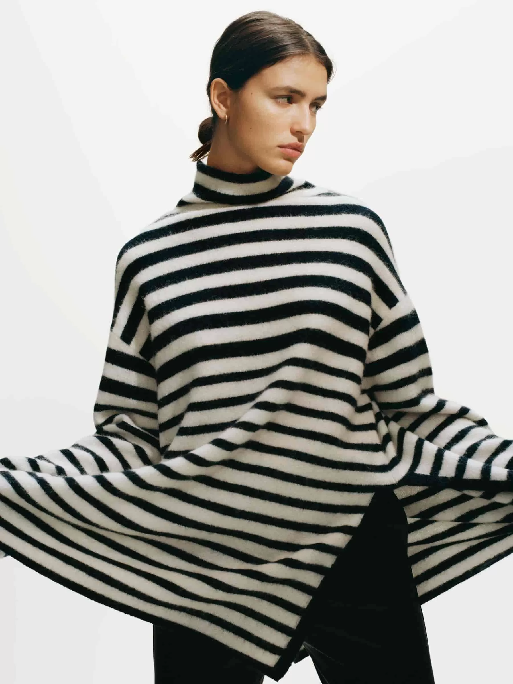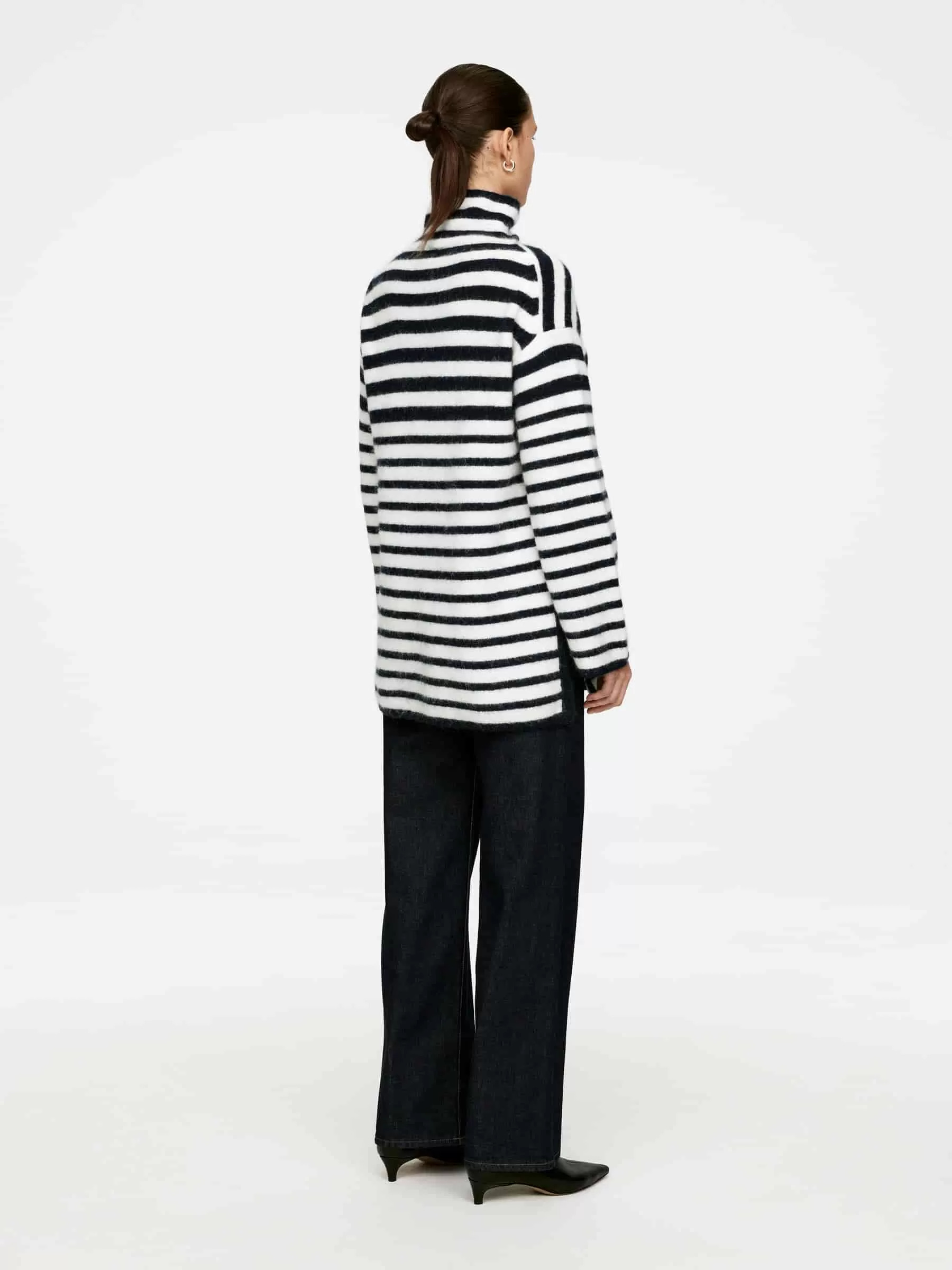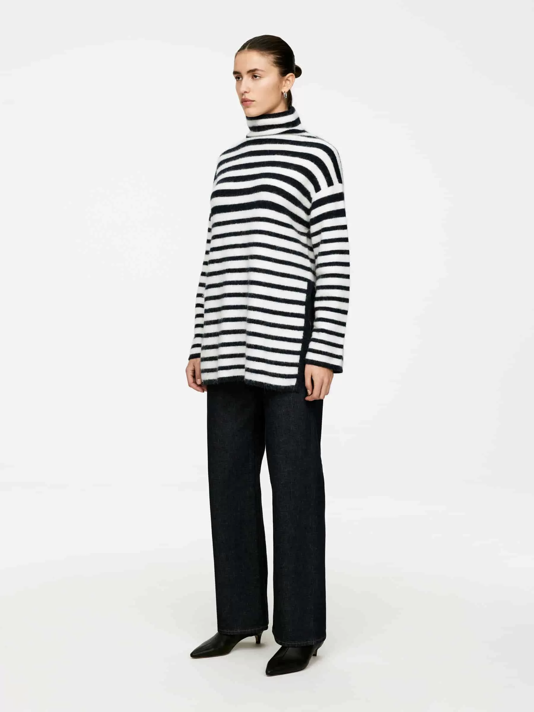 Mock-neck jumper crafted from an alpaca-wool blend. A long style with slit at both sides. Relaxed fit. This style contains 28% RAS Alpaca and 32% RWS wool (TE-00047206). Products certified to the Responsible Wool Standard (RWS) and the Responsible Alpaca Standard (RAS) contain wool and alpaca fiber from farms independently certified to animal welfare and land management requirements.