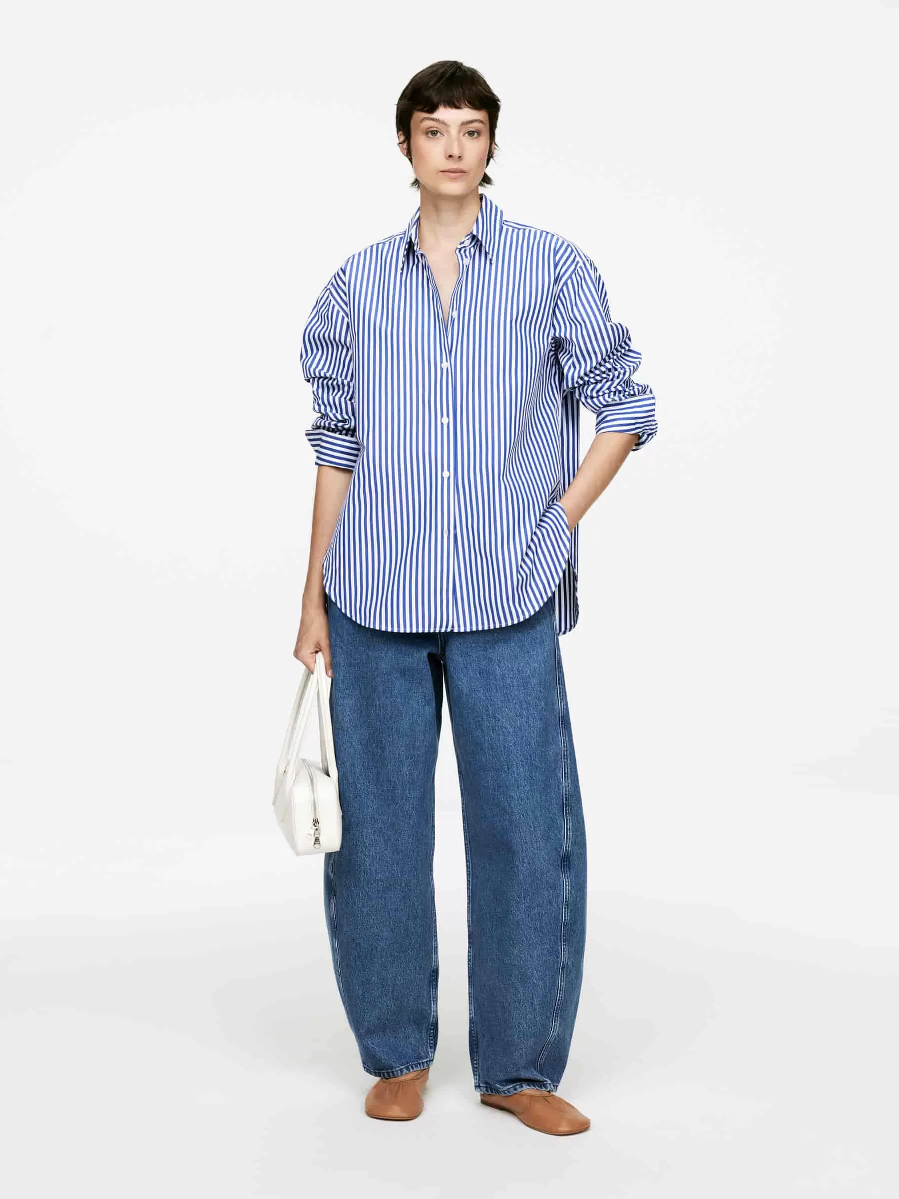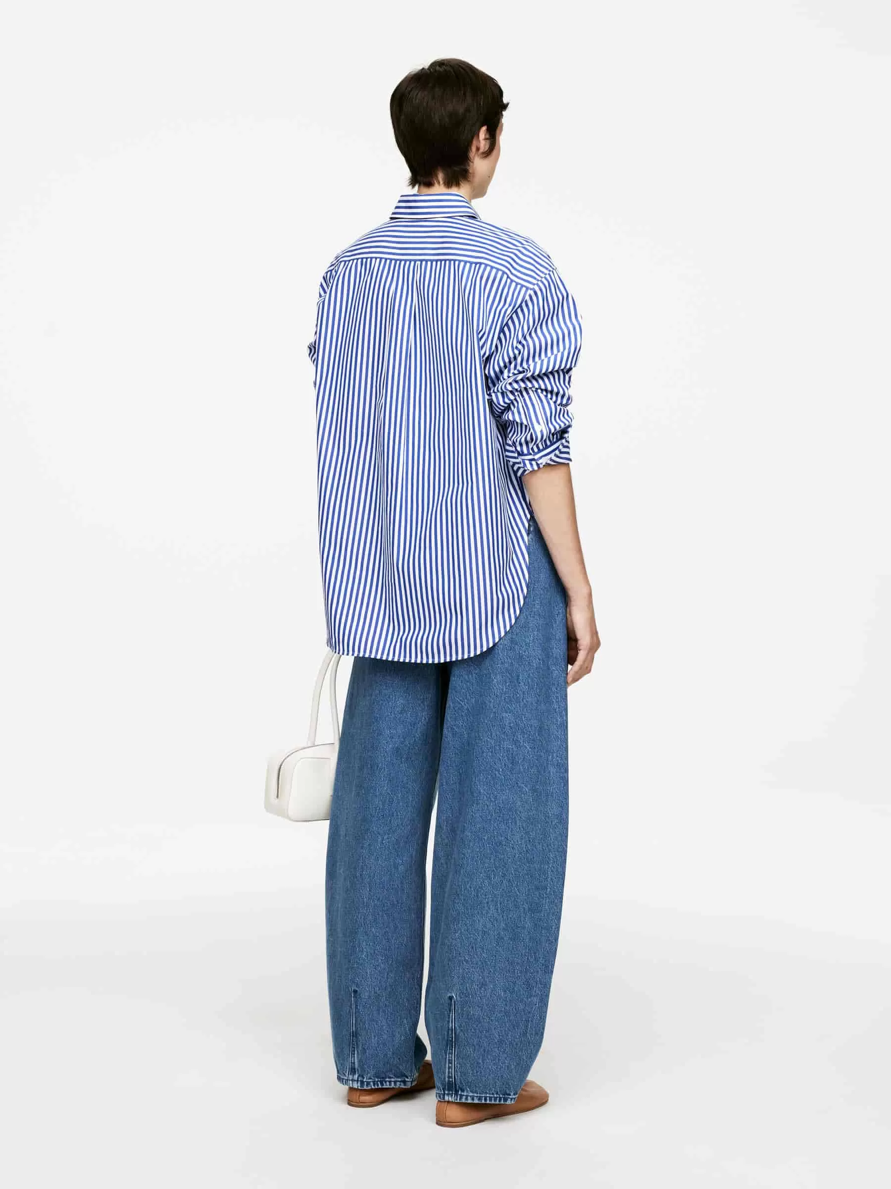 Barrel-shaped denim trousers crafted from cotton. A mid-waist style with slanted side pockets, buttoned welt pockets at the back and zip closure.