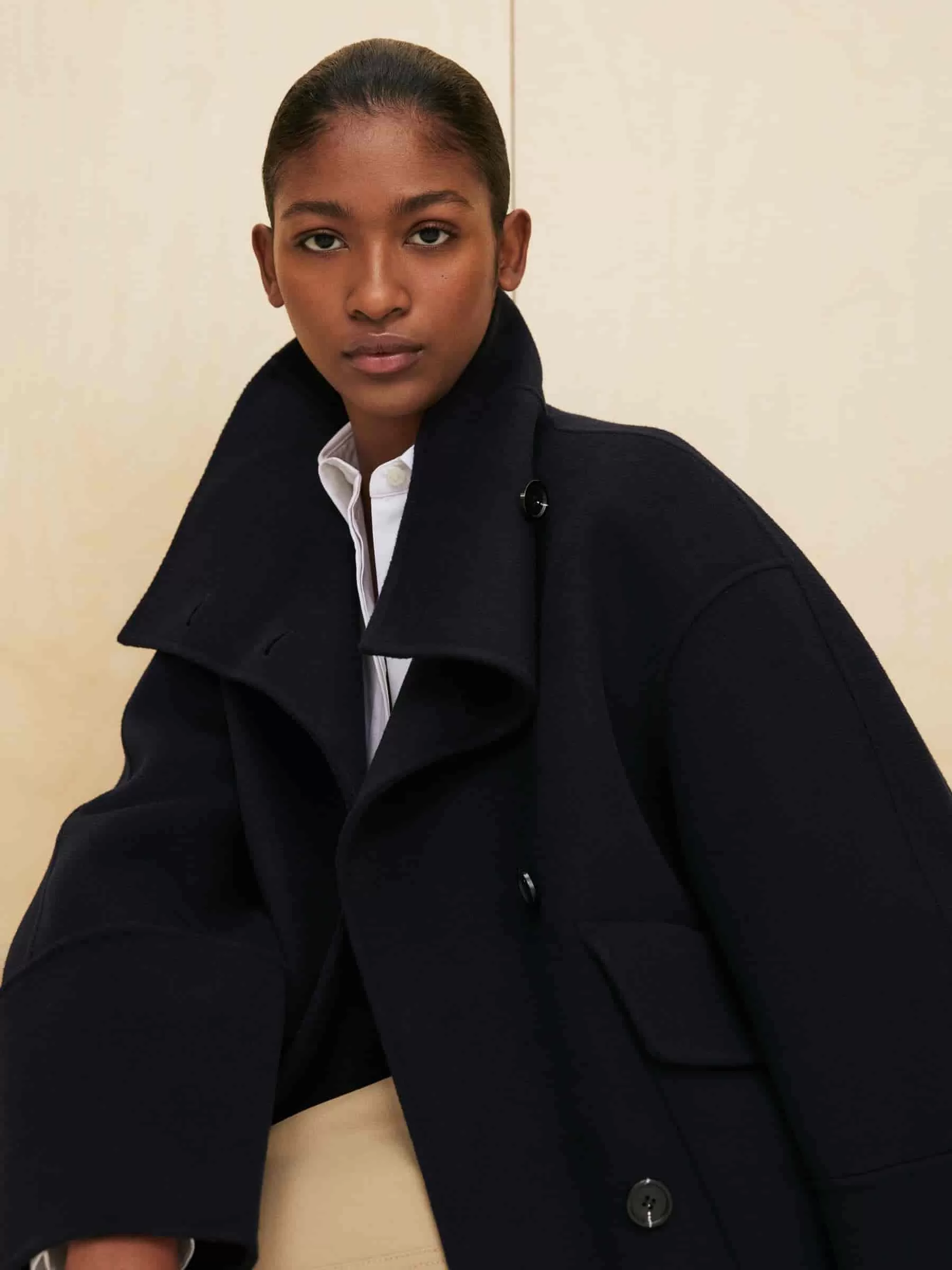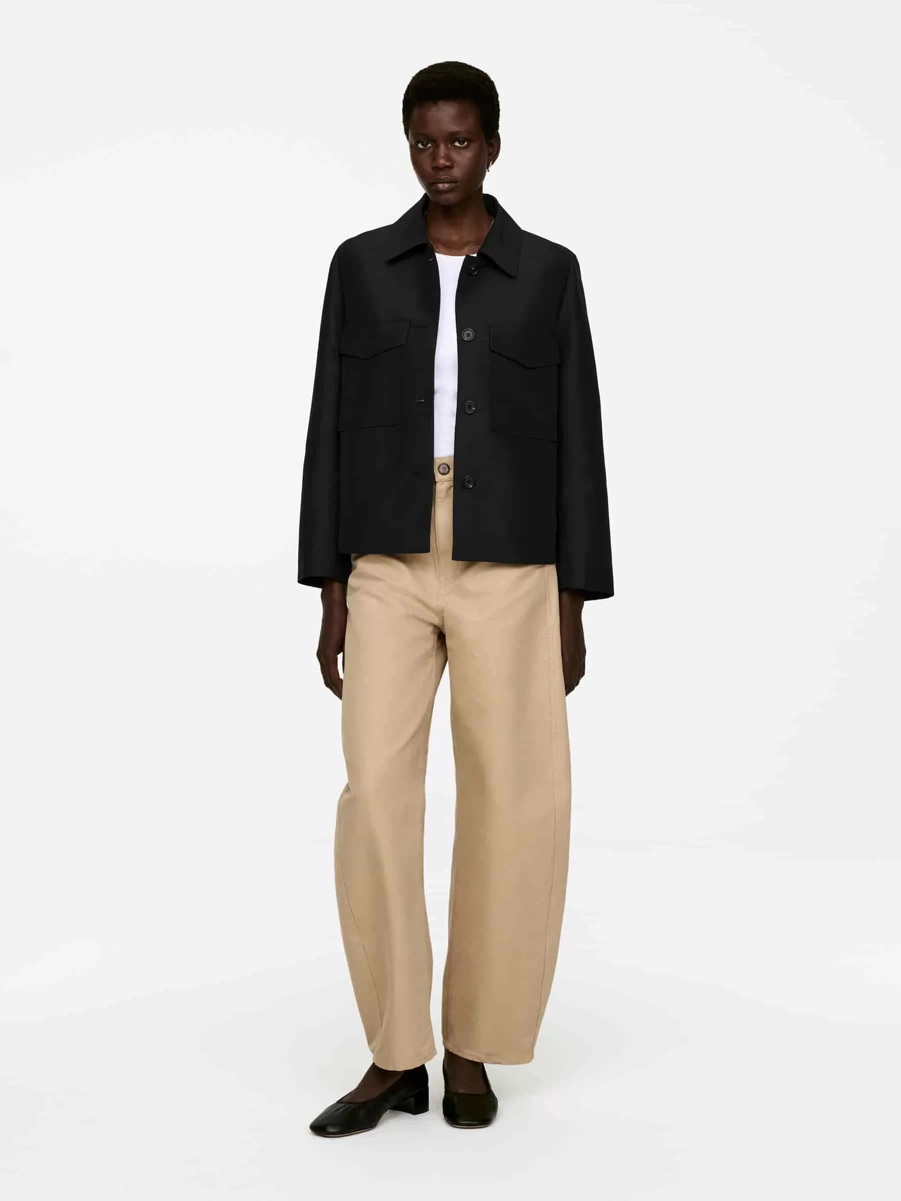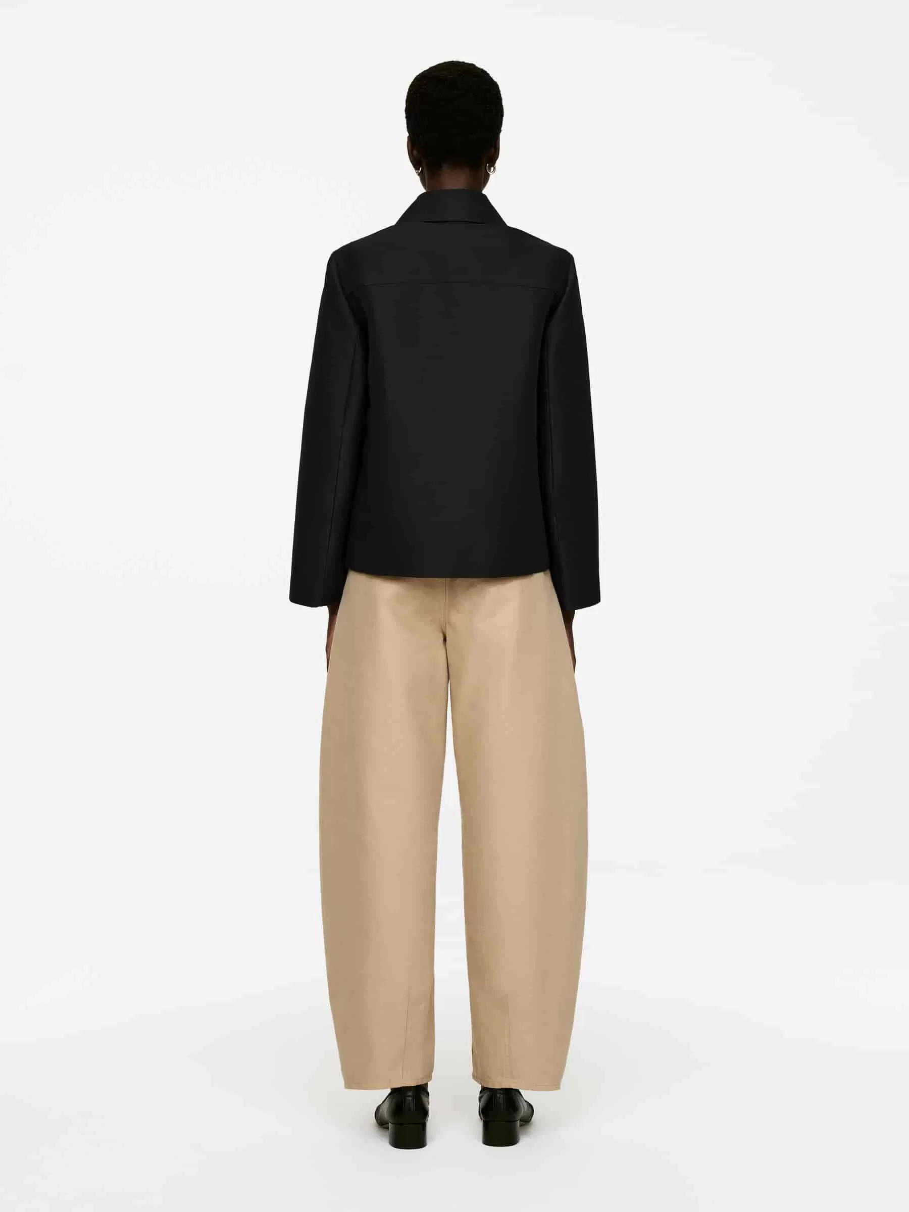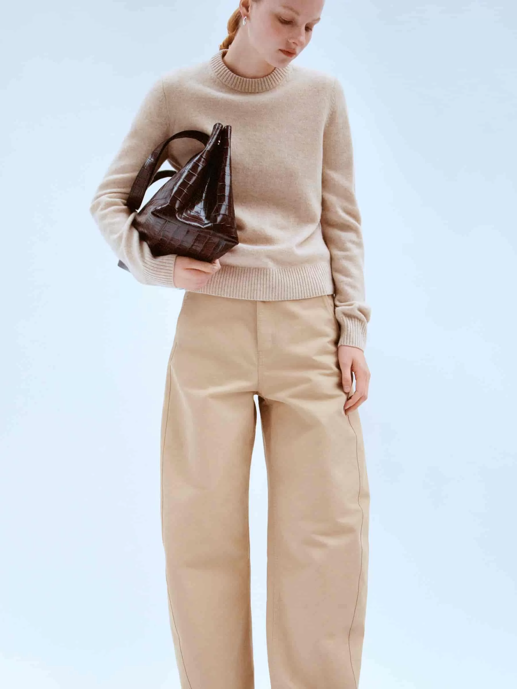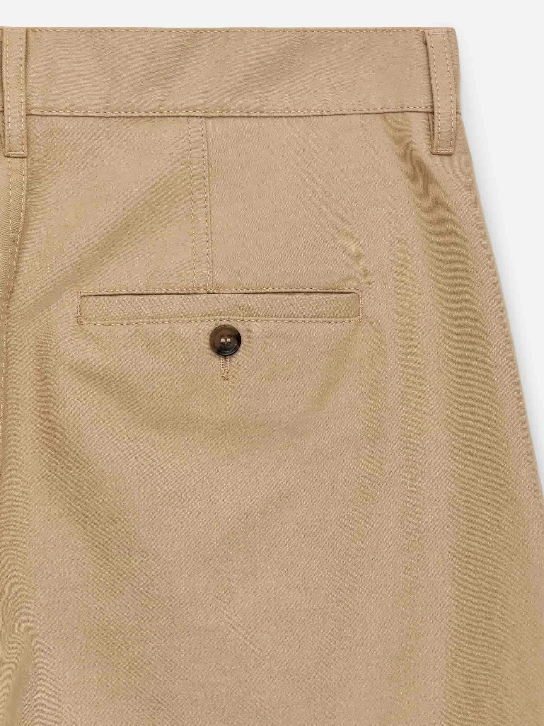 Chino style trousers crafted from cotton. A mid-waist style with barrel legs, slanted side pockets and welt pockets at back.