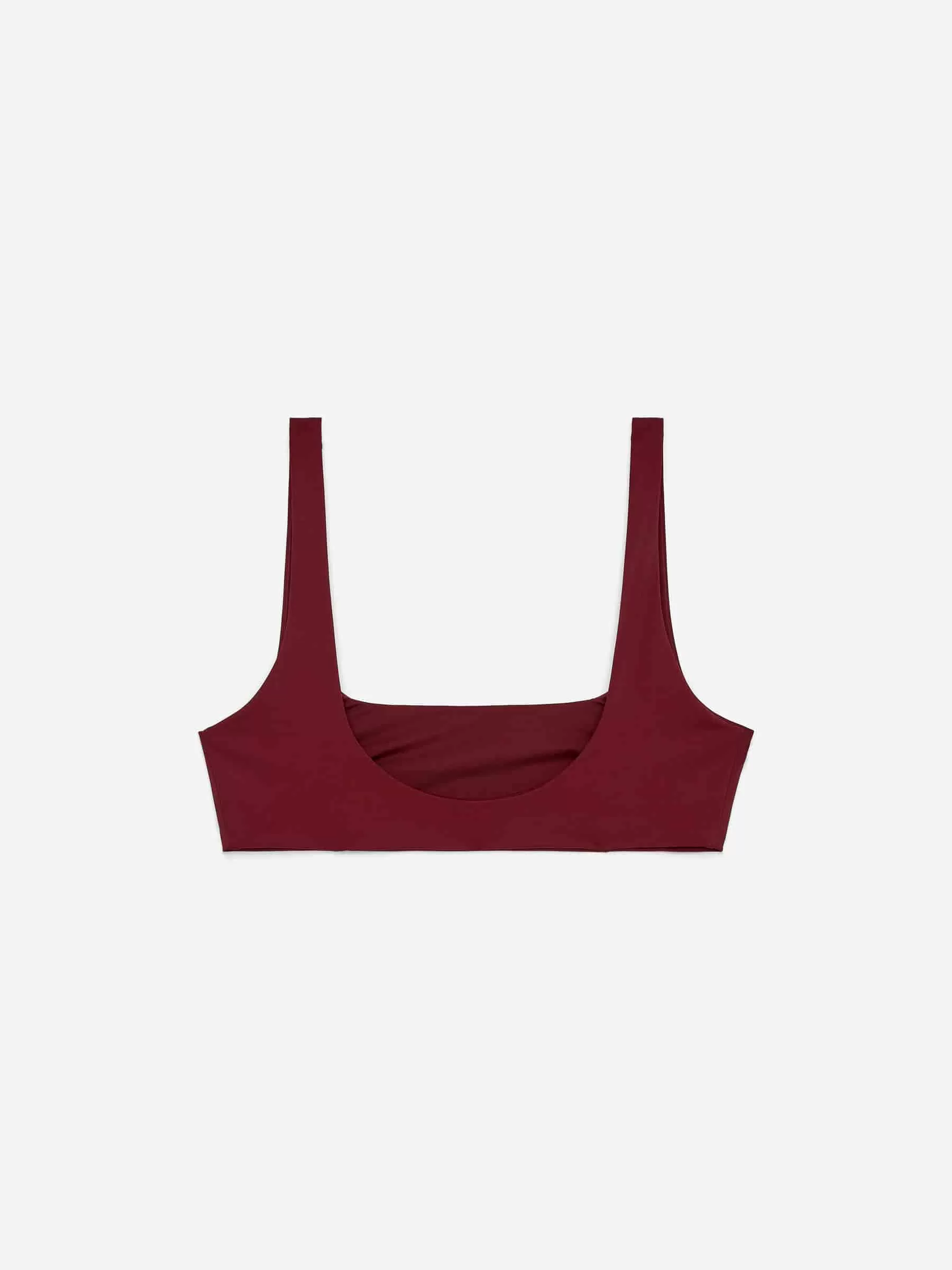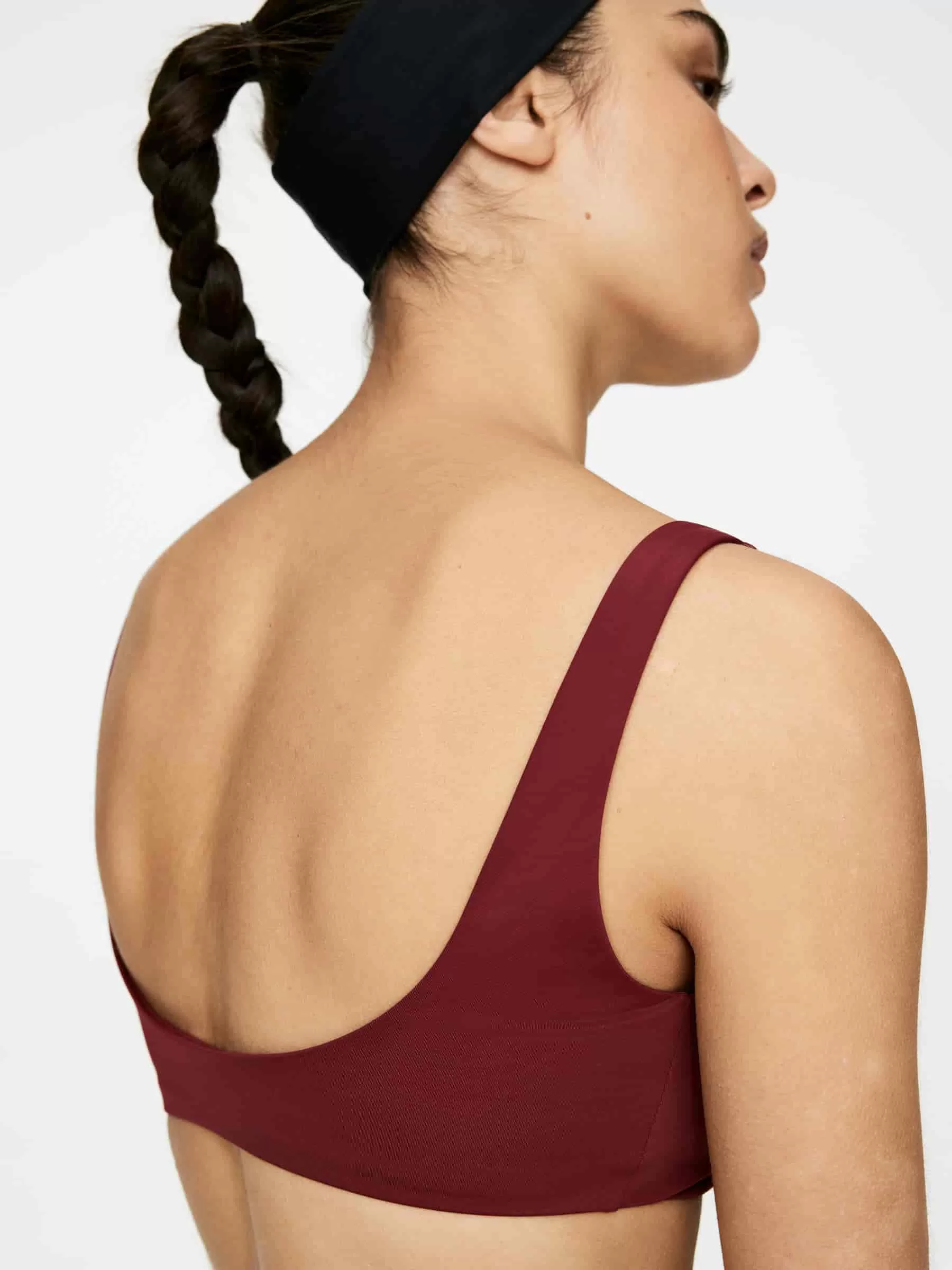 Sporty bikini top crafted from soft, stretchy tricot fabric. Pullover style with a plunging U-shaped back.