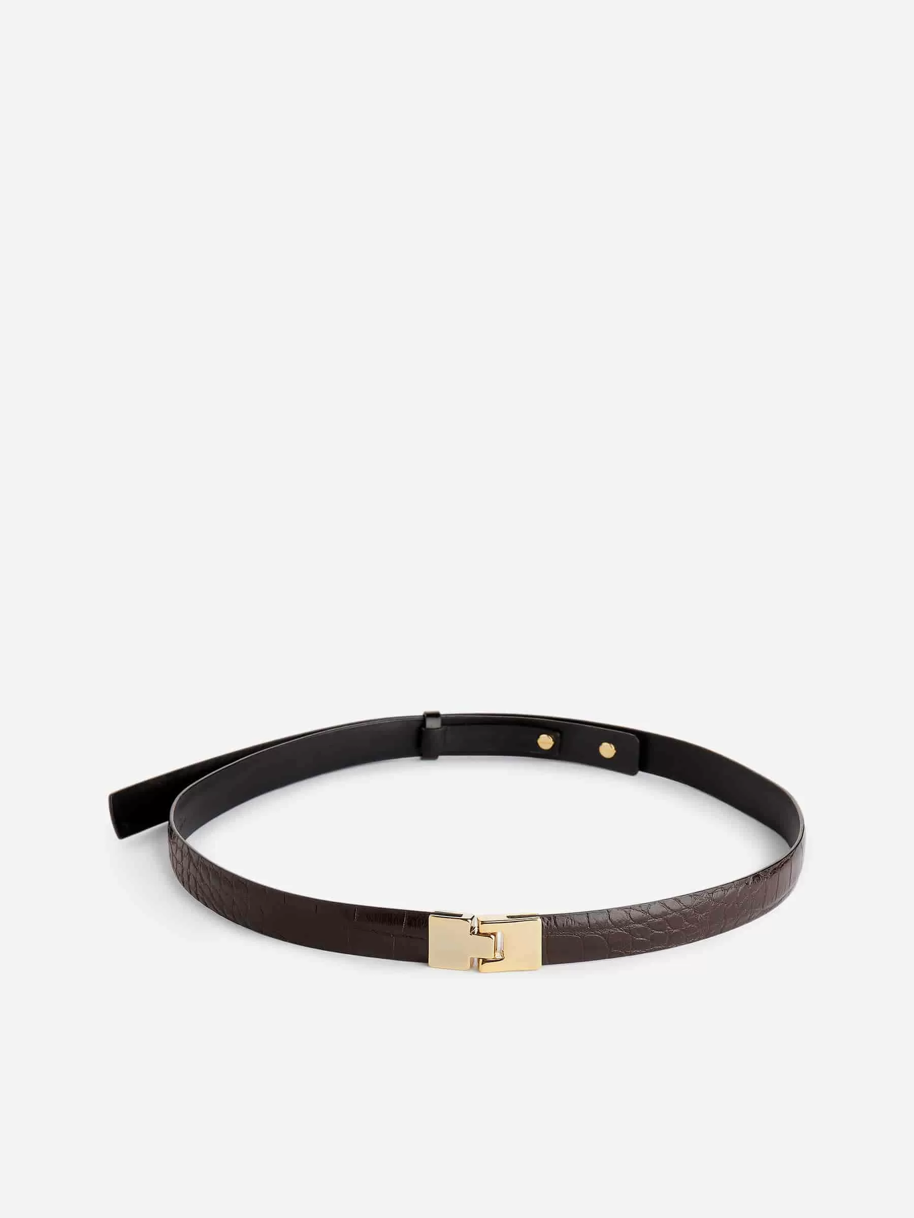 Slim hip belt featuring an embossed croco pattern. Styled with a decorative gold-plated square buckle at front. Adjustable stud closures at the back. XS/S 105.5 cm, M/L 116.5 cm.