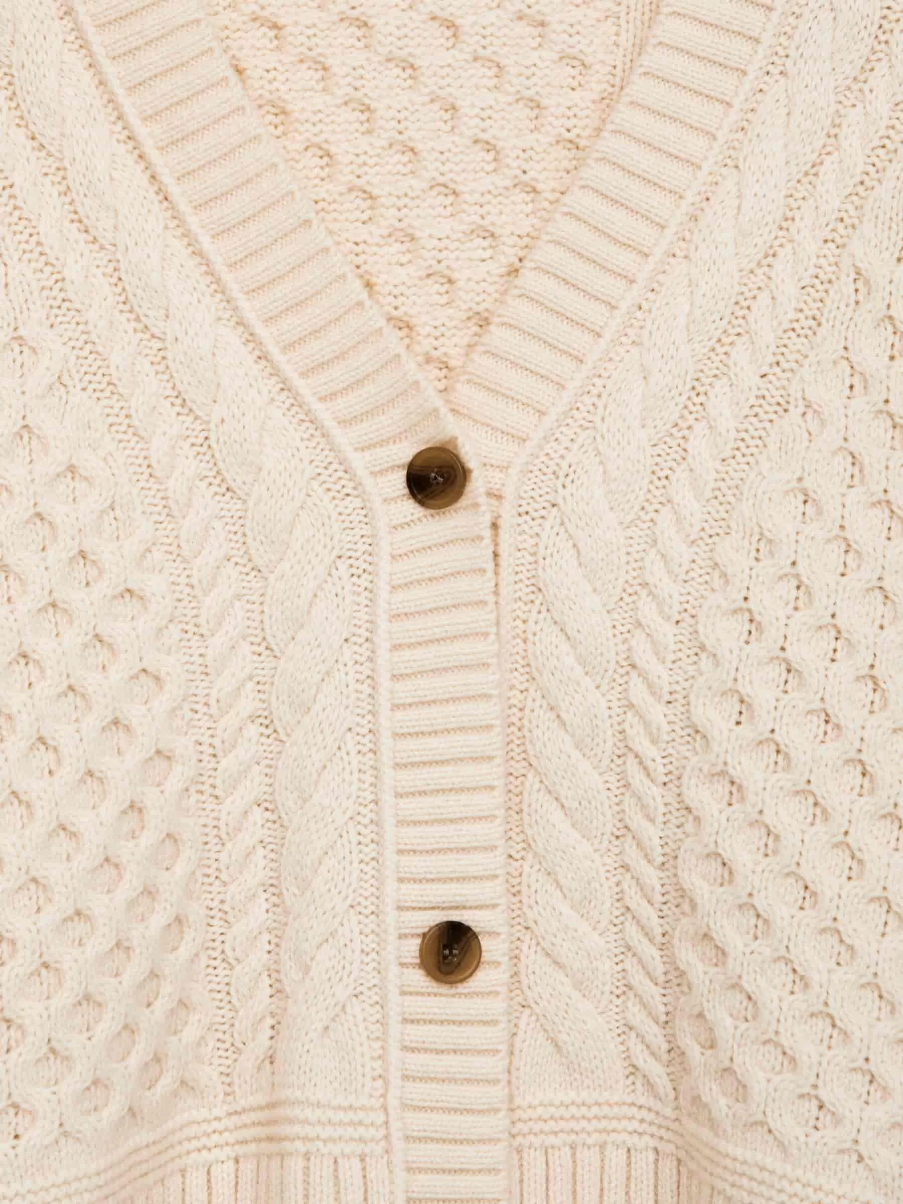 Cardigan with a cable-knit pattern crafted from wool. Styled with a V-neck, three-button closure and ribbed trims. Regular fit. The cardigan contains 100% RWS wool (TE-00047206). Products certified to the Responsible Wool Standard (RWS) contain wool fiber from farms independently certified to animal welfare and land management requirements.
