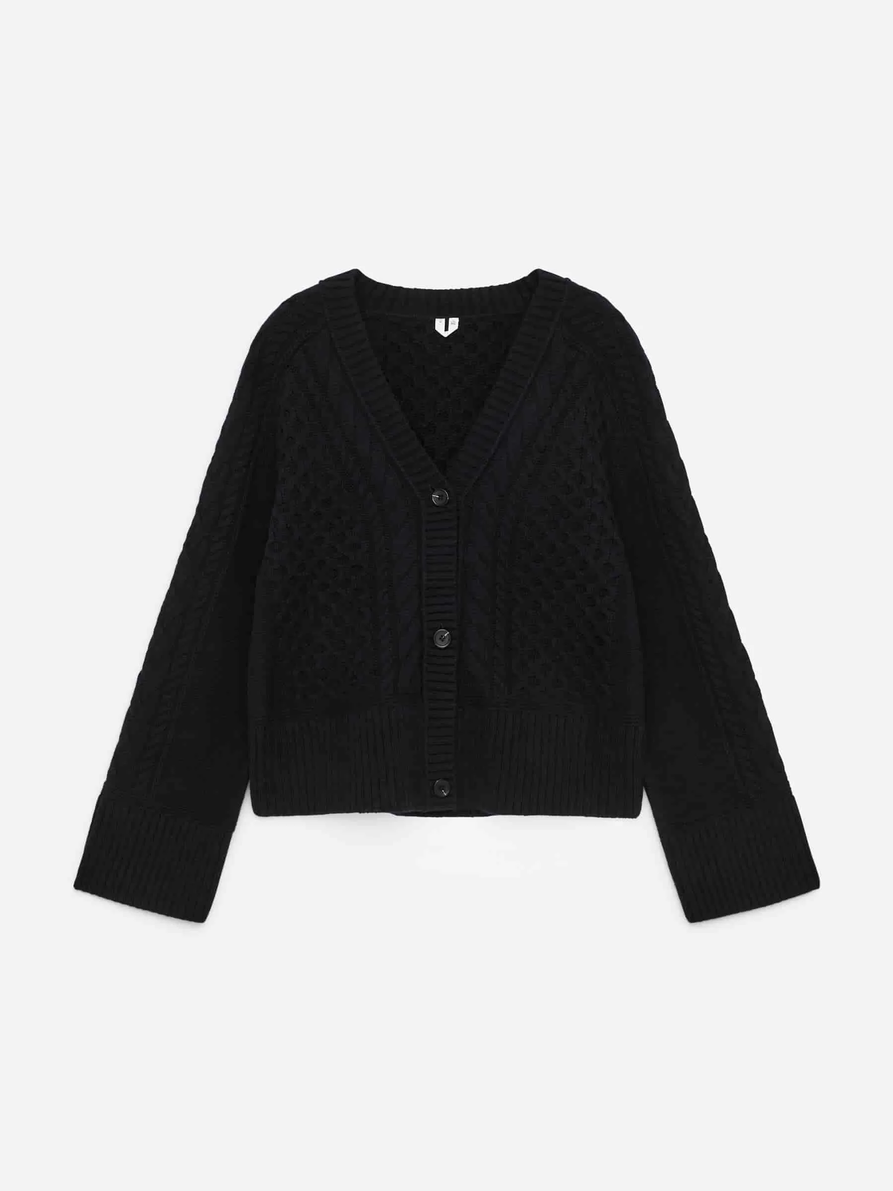 Cardigan with a cable-knit pattern crafted from wool. Styled with a V-neck, three-button closure and ribbed trims. Regular fit. The cardigan contains 100% RWS wool (TE-00047206). Products certified to the Responsible Wool Standard (RWS) contain wool fiber from farms independently certified to animal welfare and land management requirements.