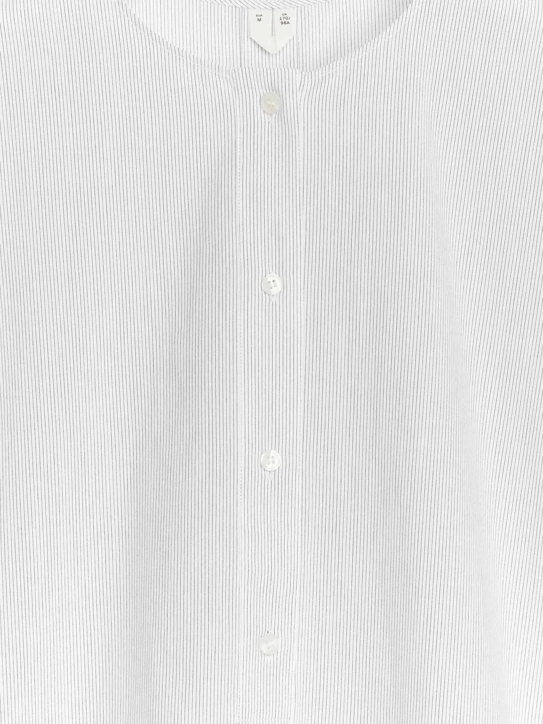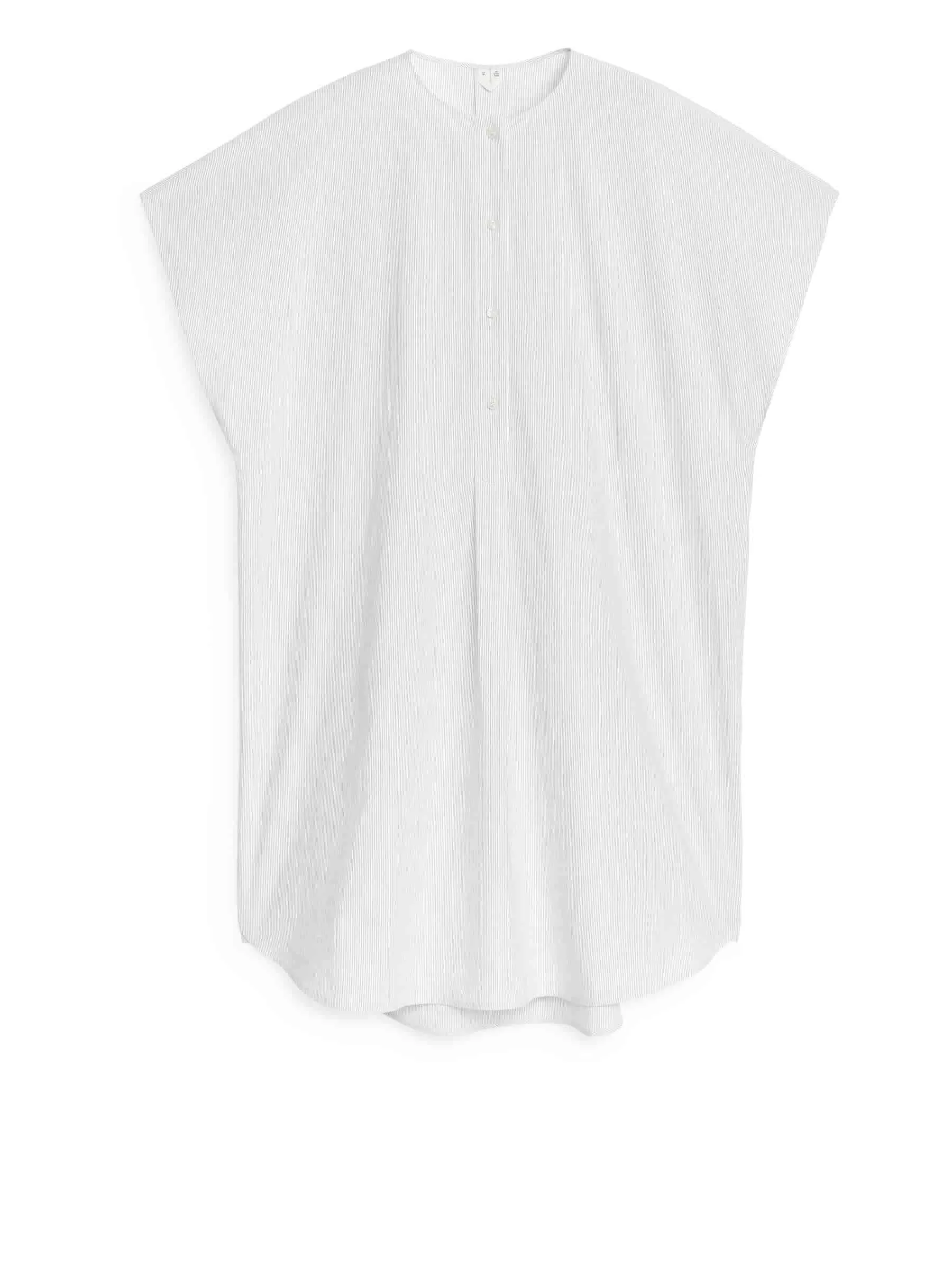 Collarless tunic with cap sleeves crafted from a washed cotton weave. A relaxed-fitted style with a buttoned half placket.