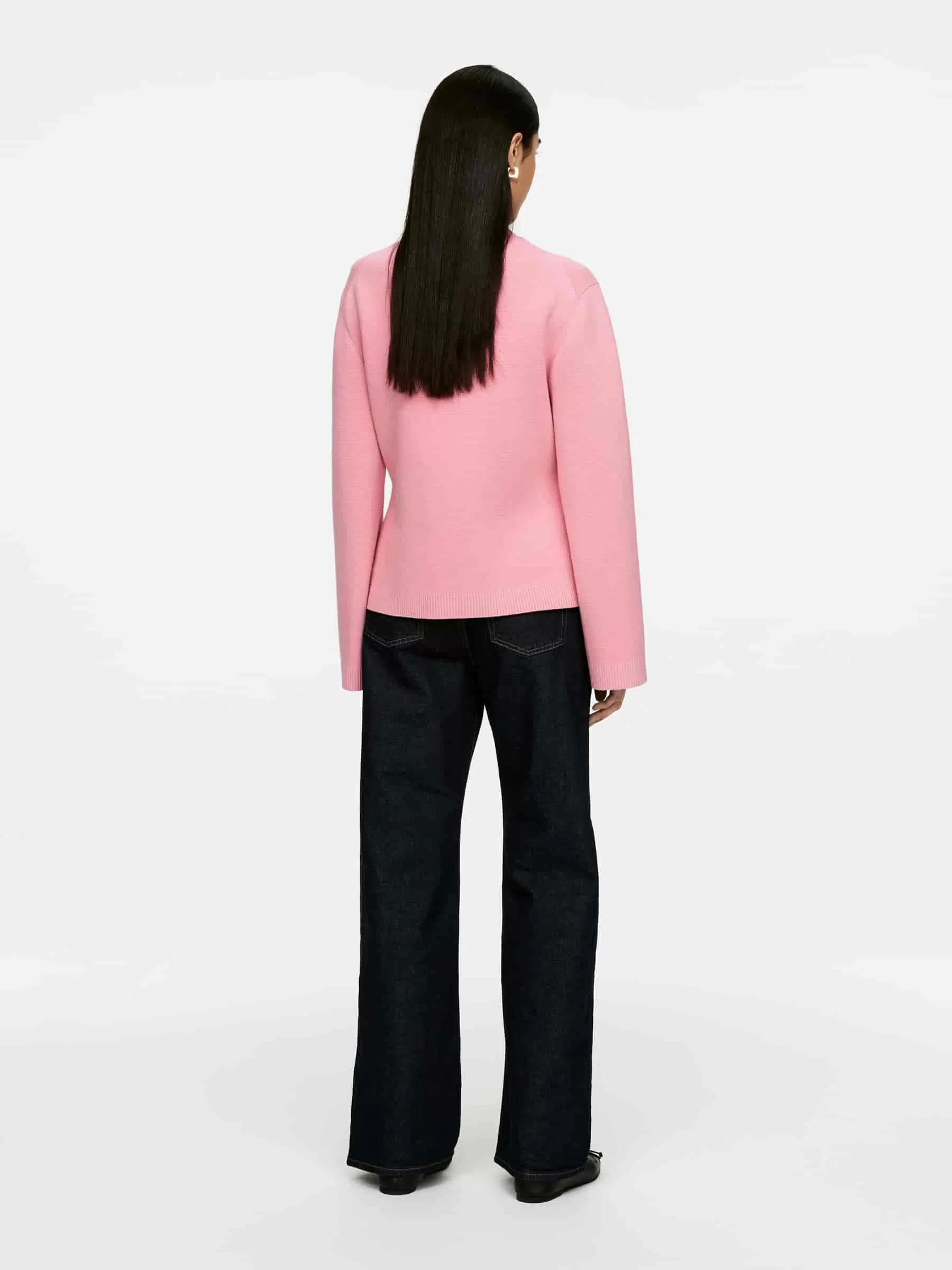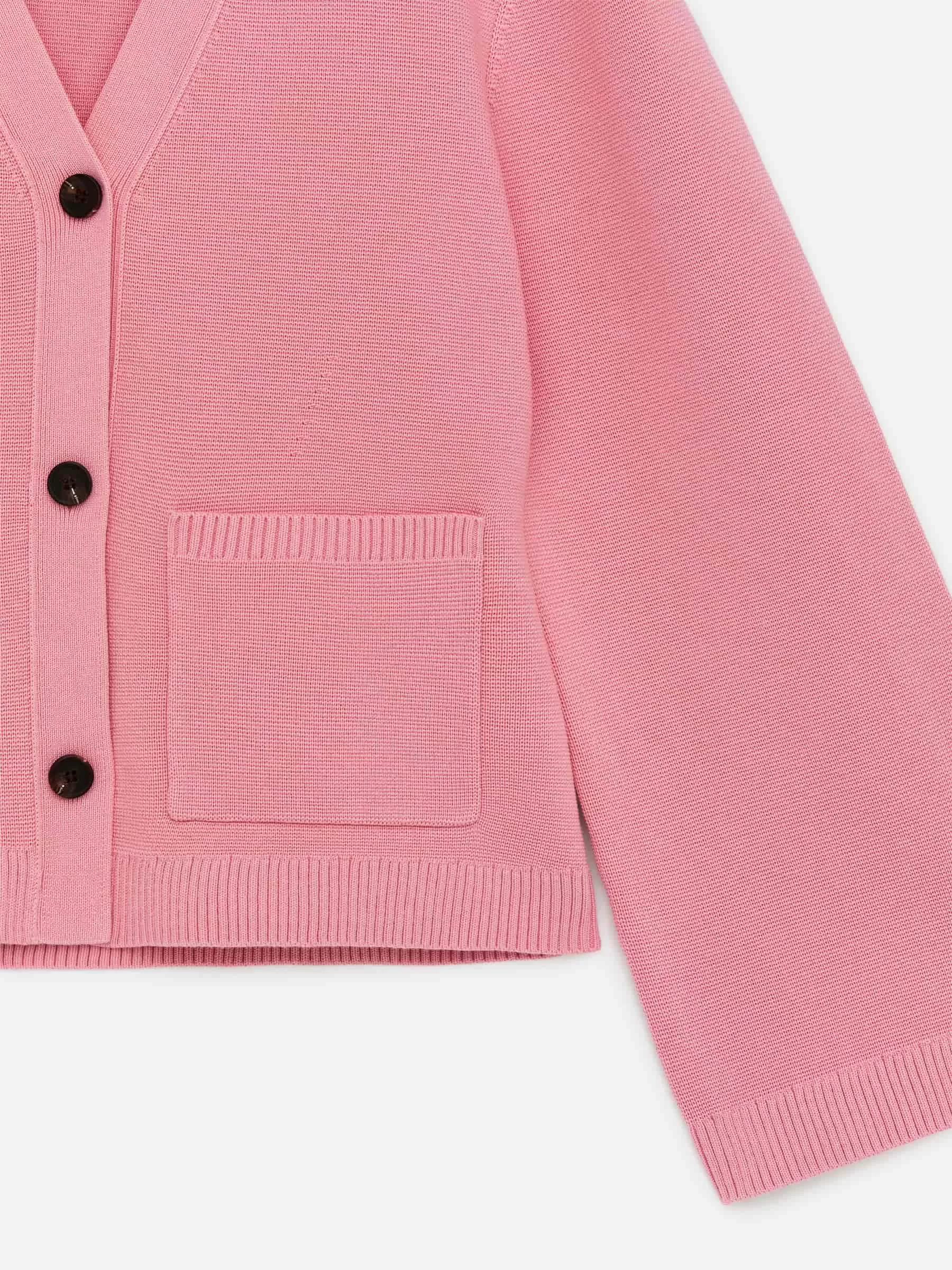 Cotton cardigan knitted in a full Milano stitch. This is a V-neck, three-button style with front pockets and ribbed cuffs and bottom hem. Regular fit.