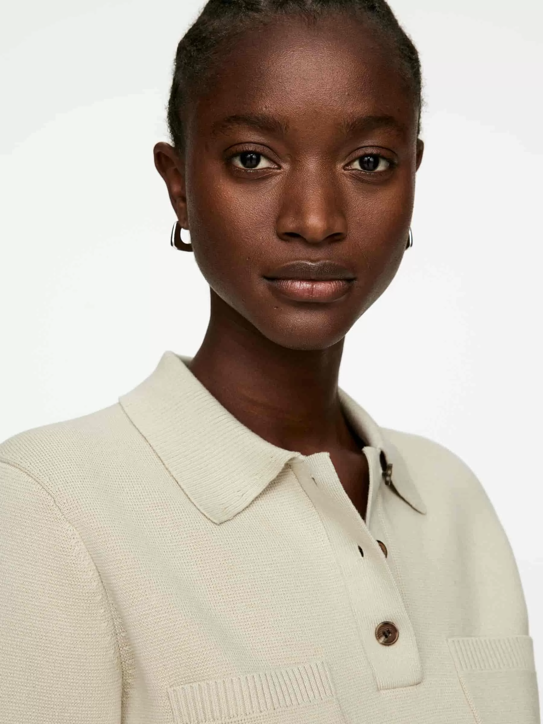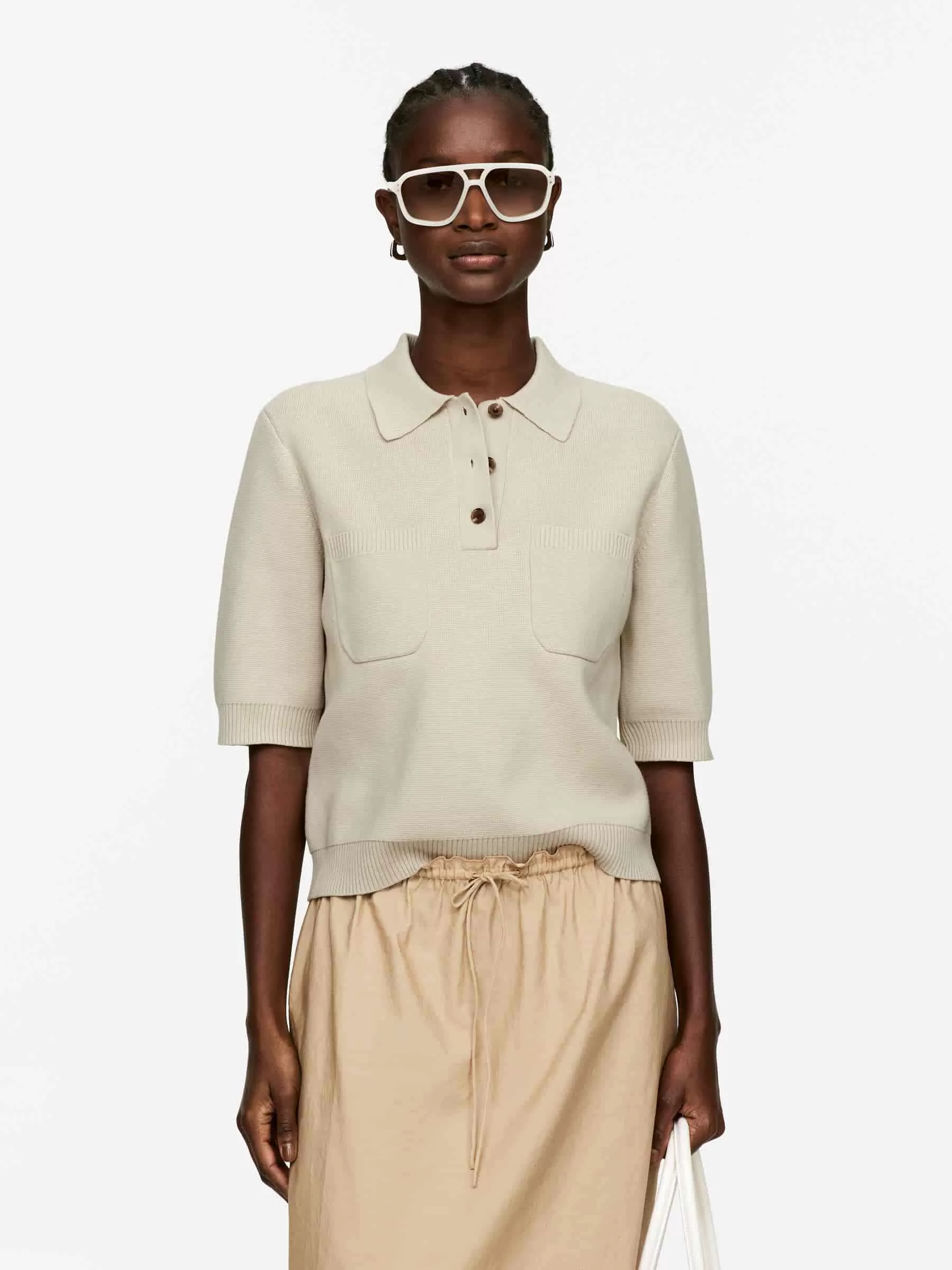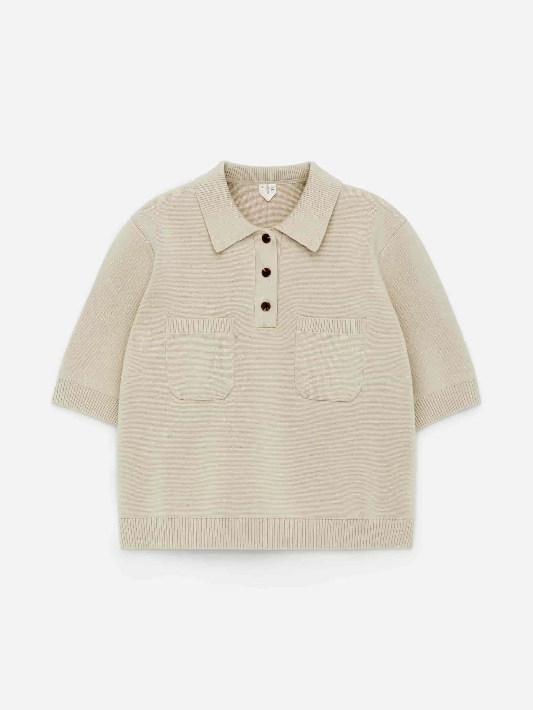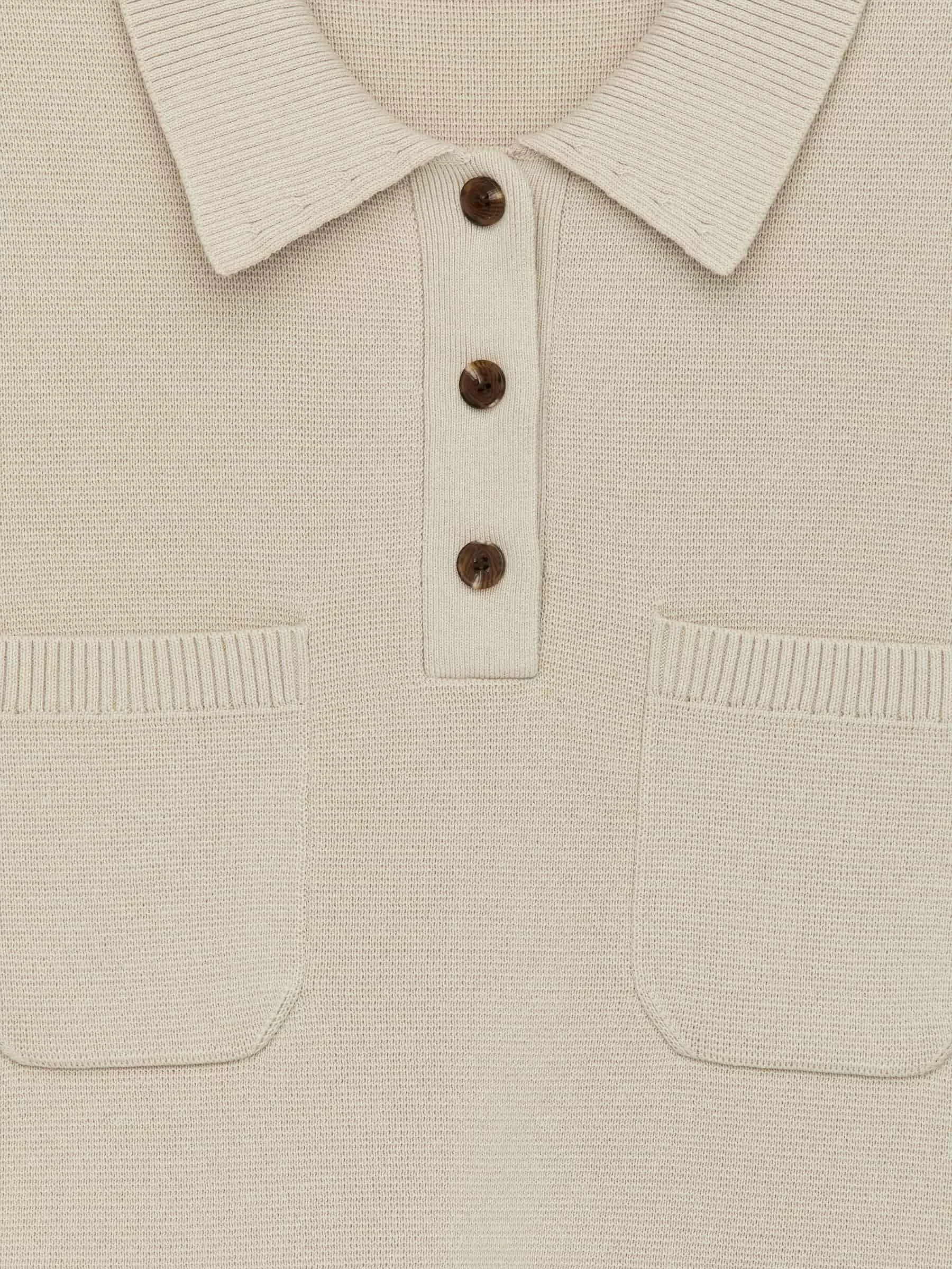 Short-sleeved top knitted from cotton. Styled with a shirt collar, three-button closure and chest pockets. Regular fit.