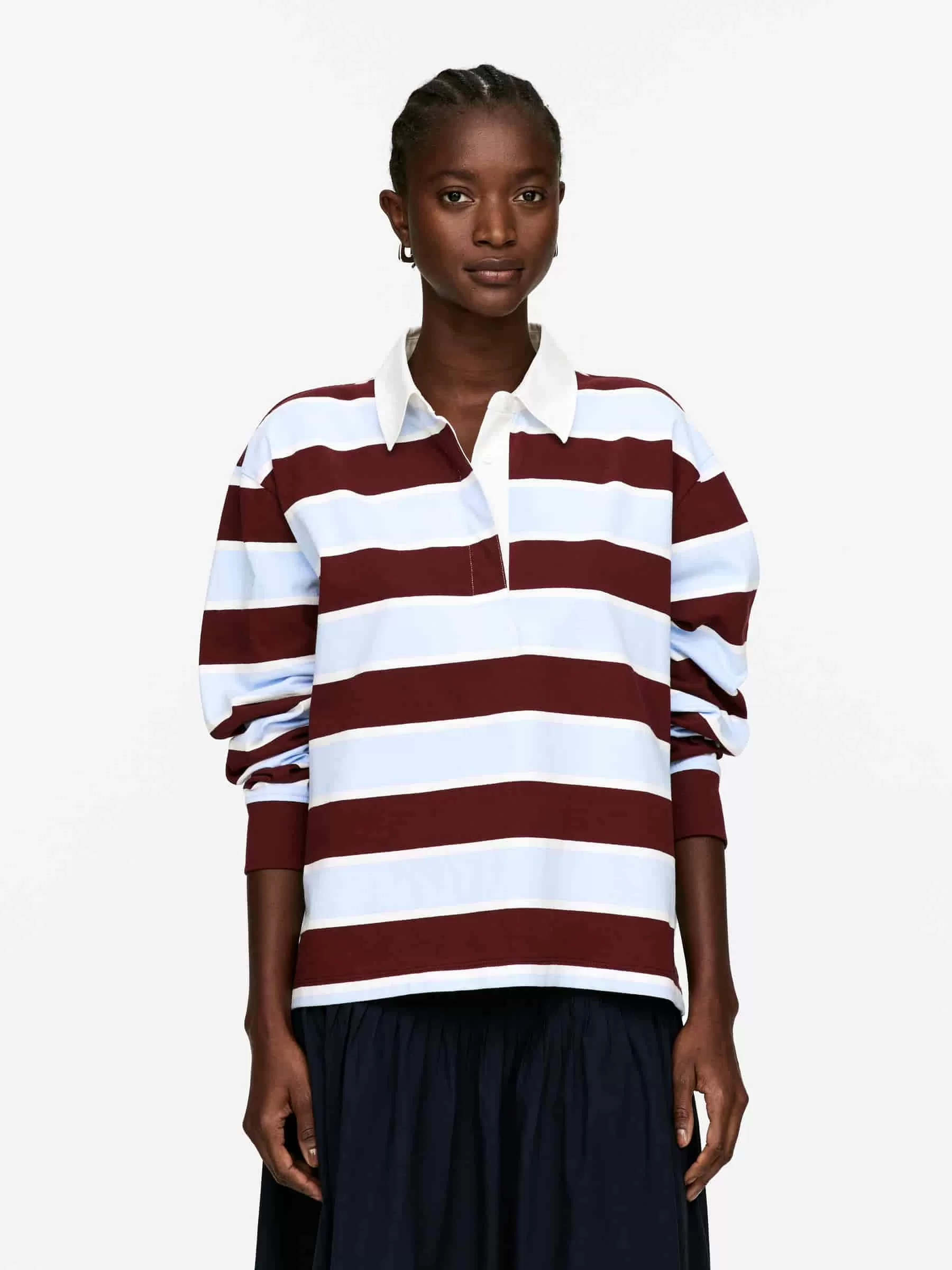 Polo shirt crafted from a twill weave made of cotton. Styled with long-sleeves and a collar in contrasting colour. Hidden placket with five hidden buttons. Split at sides.