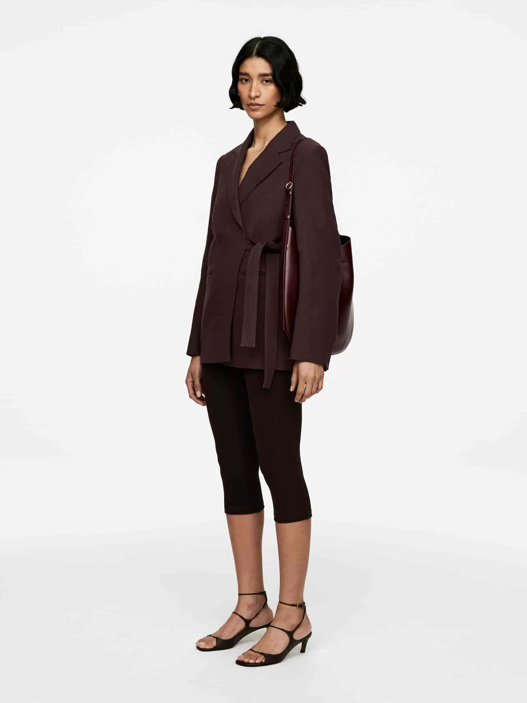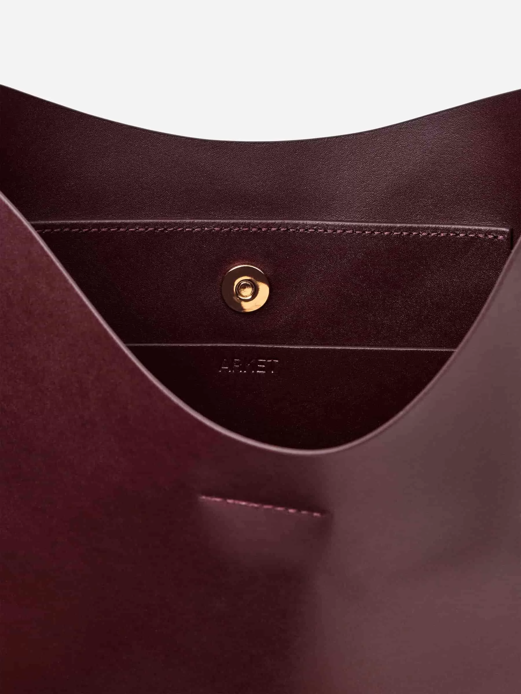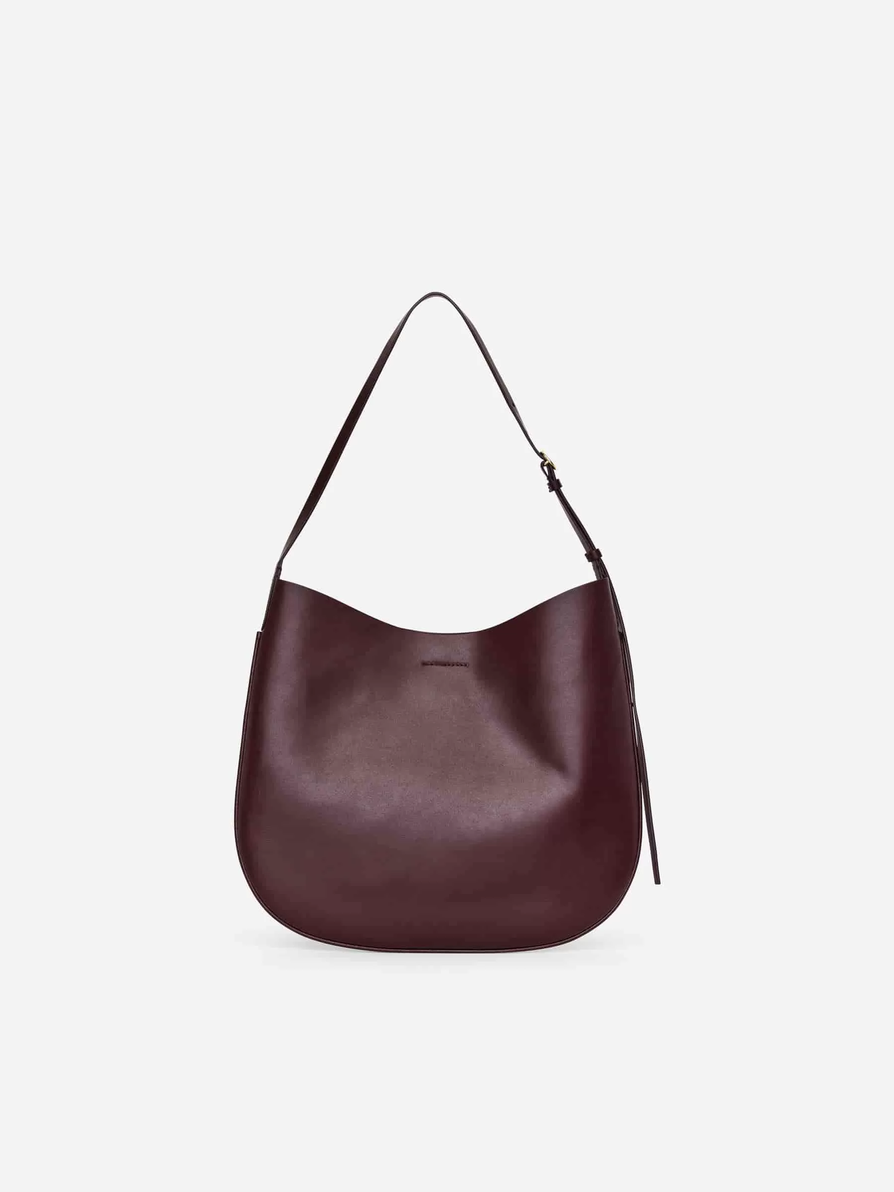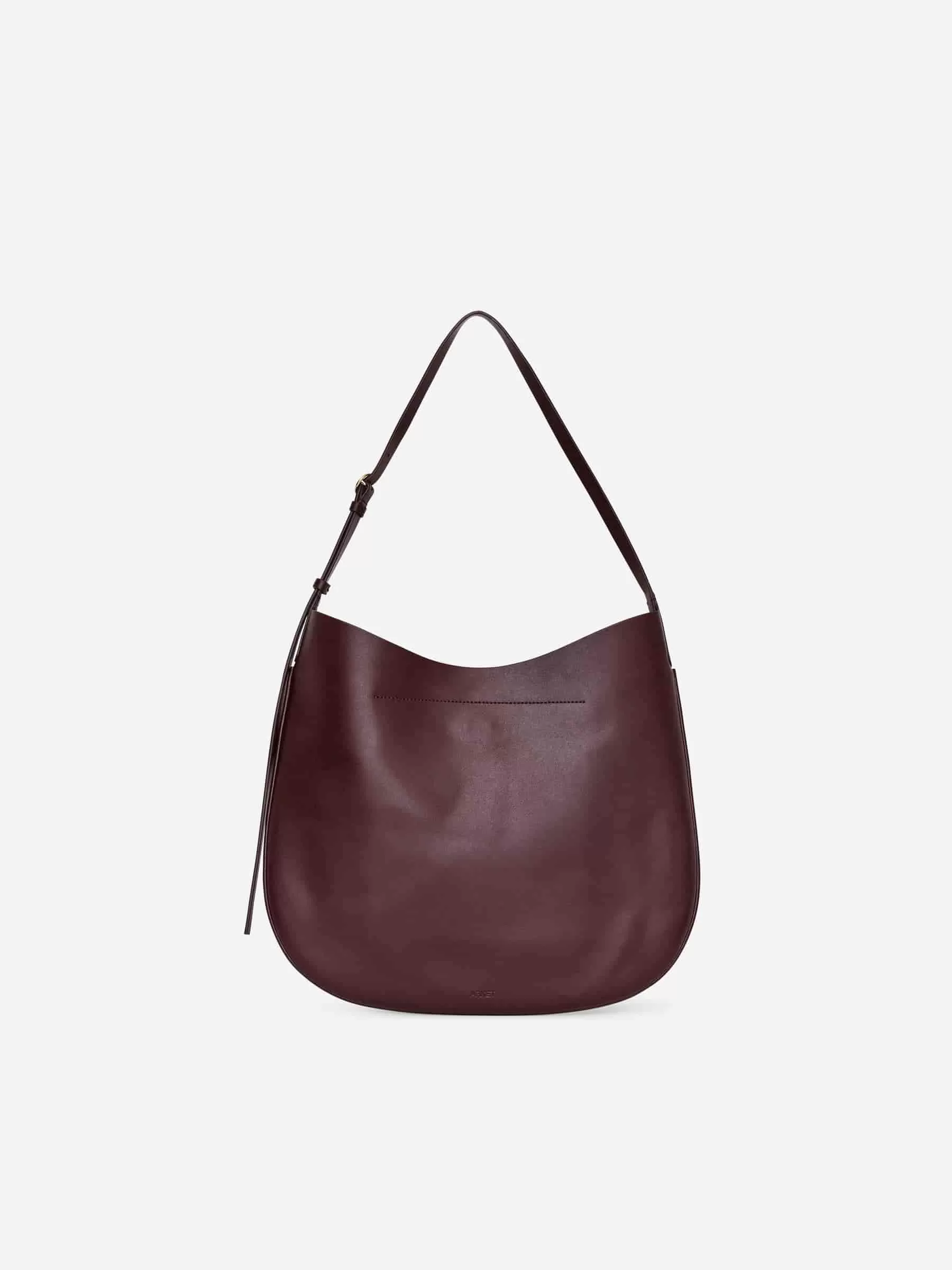 Slim shoulder bag with a rounded shape crafted from chrome-free leather. A clean-lined style with magnetic closure and an adjustable shoulder strap with a round buckle. Inner pocket. Width 40 cm, height 36.5 cm.