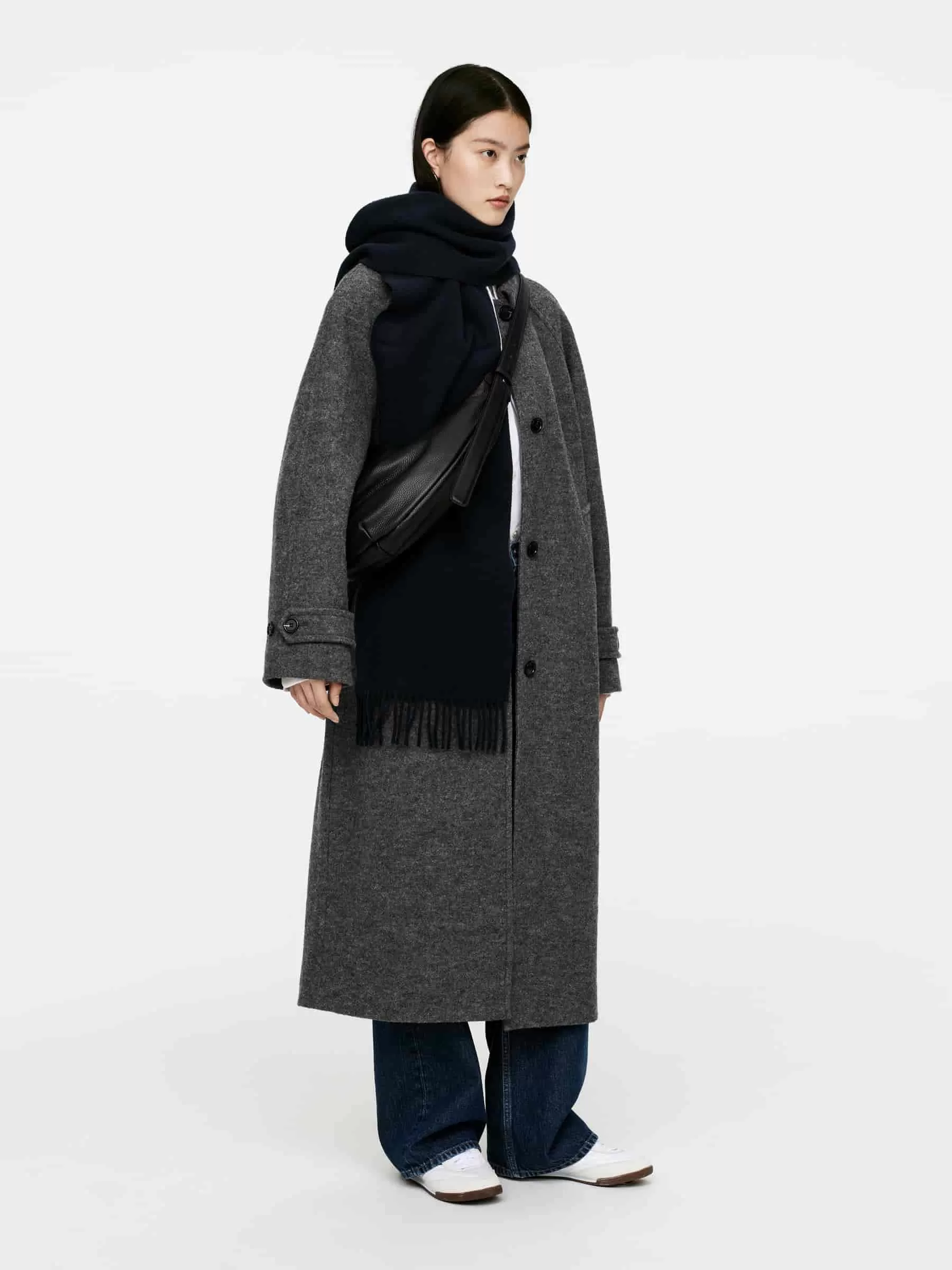 Curved bag. A versatile style that can be worn on the shoulder or as a cross-body. Made from soft leather that has undergone a chrome-free tanning process. Adjustable shoulder strap. Dimensions 45cm x 28cm.