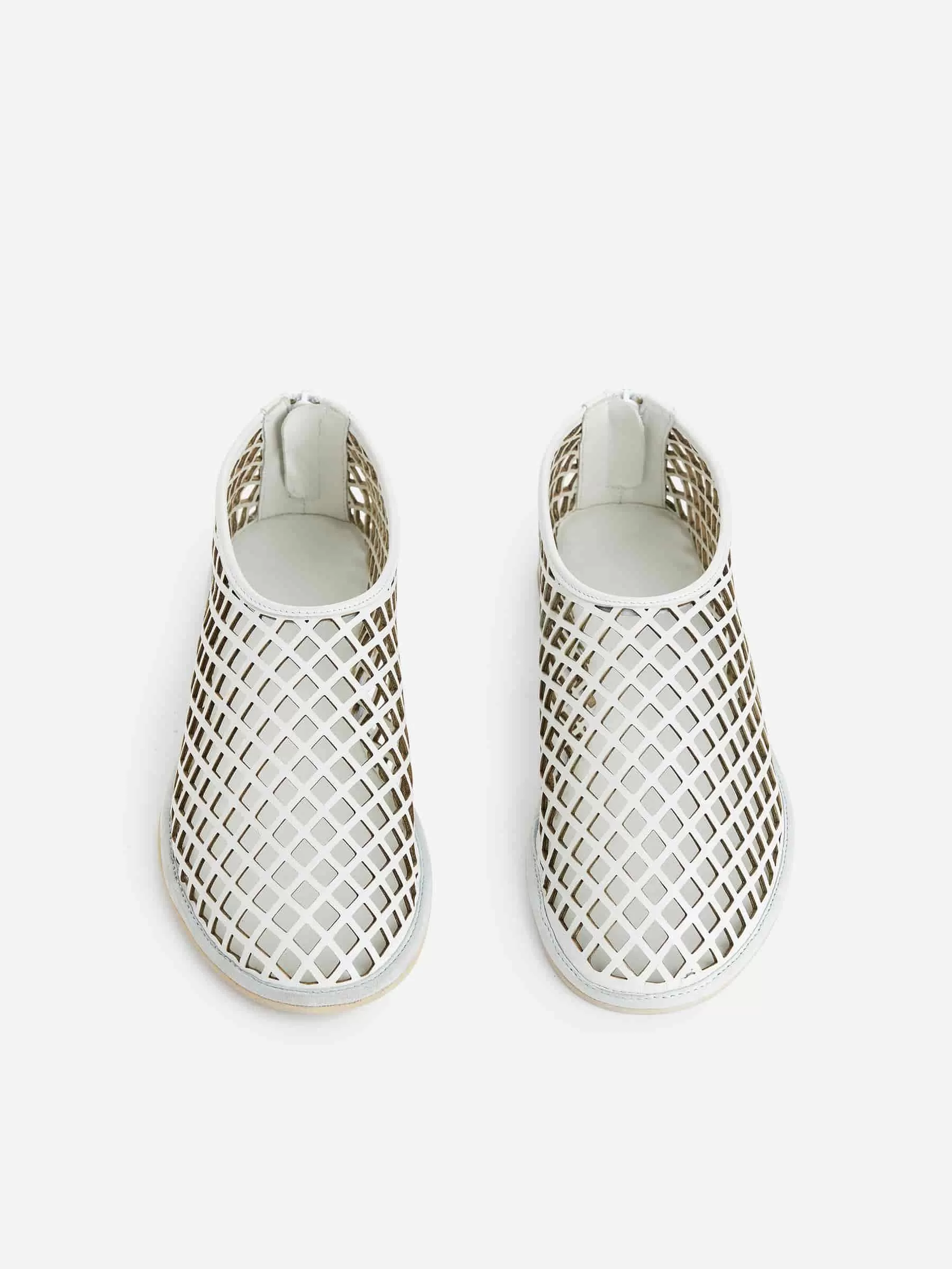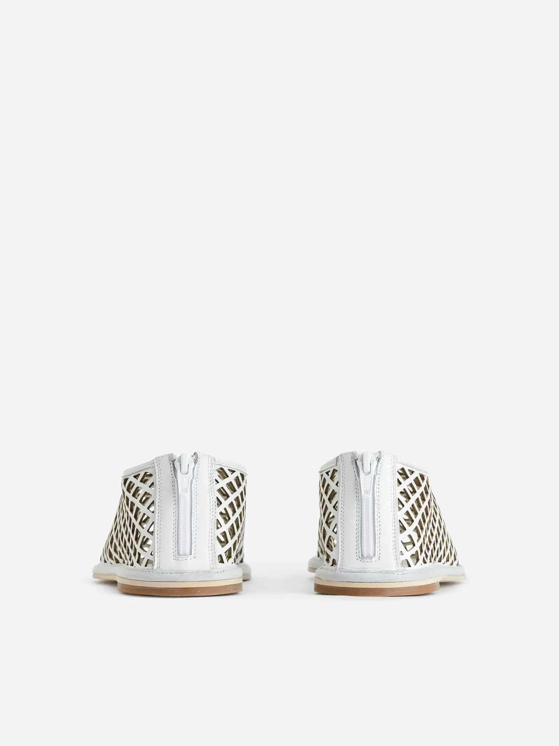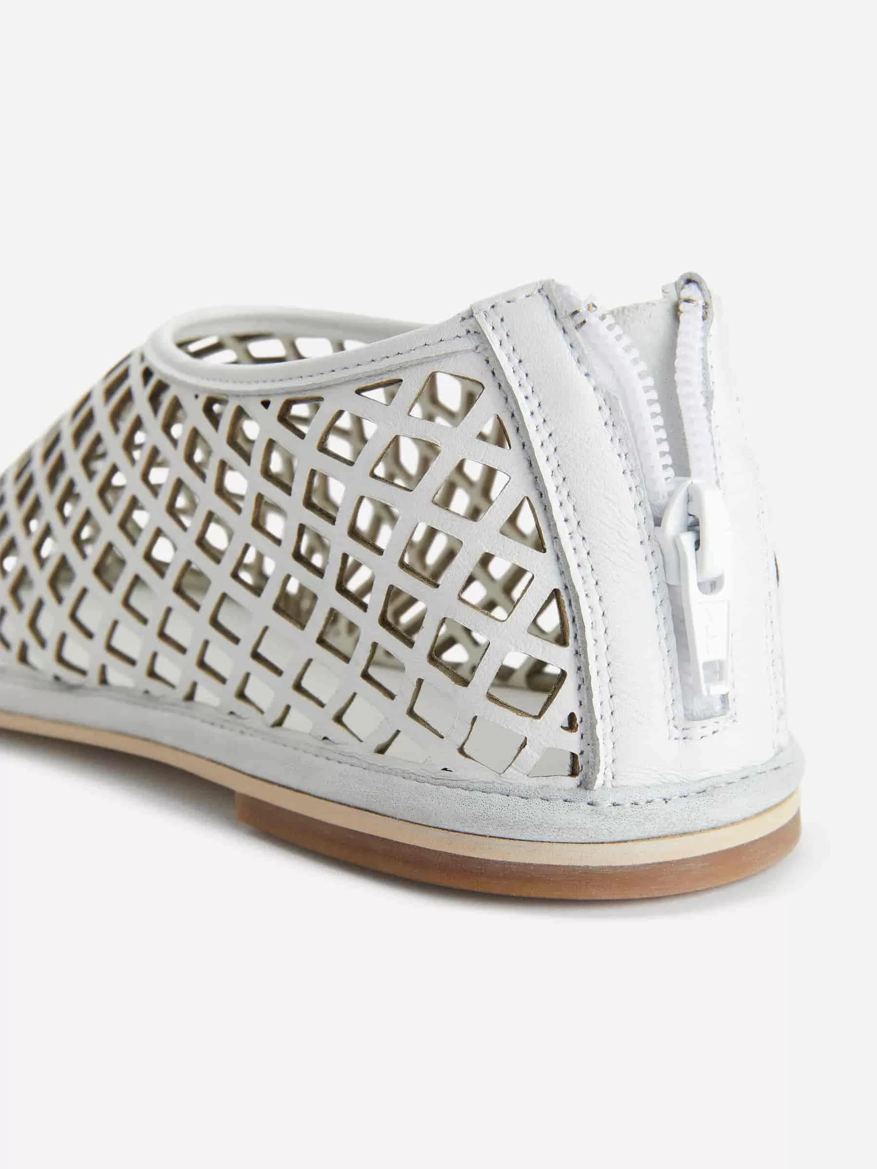 Slip-on flats in leather with a cage-designed upper. Styled with a thin sole and zip at centre back.