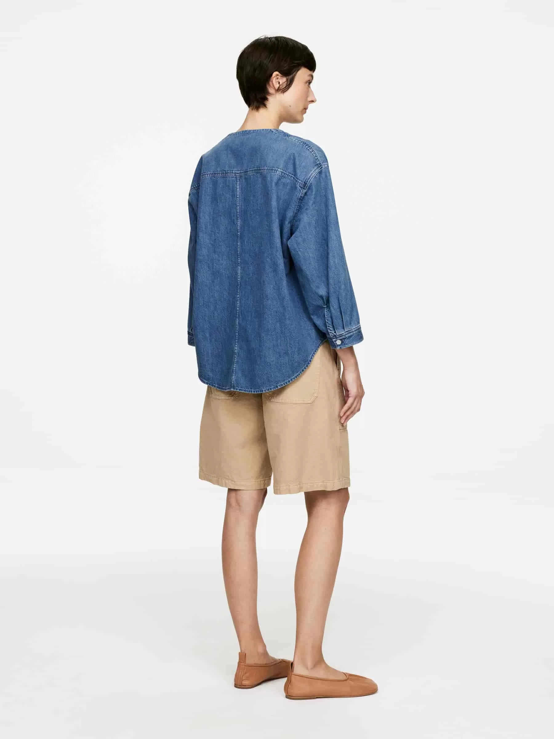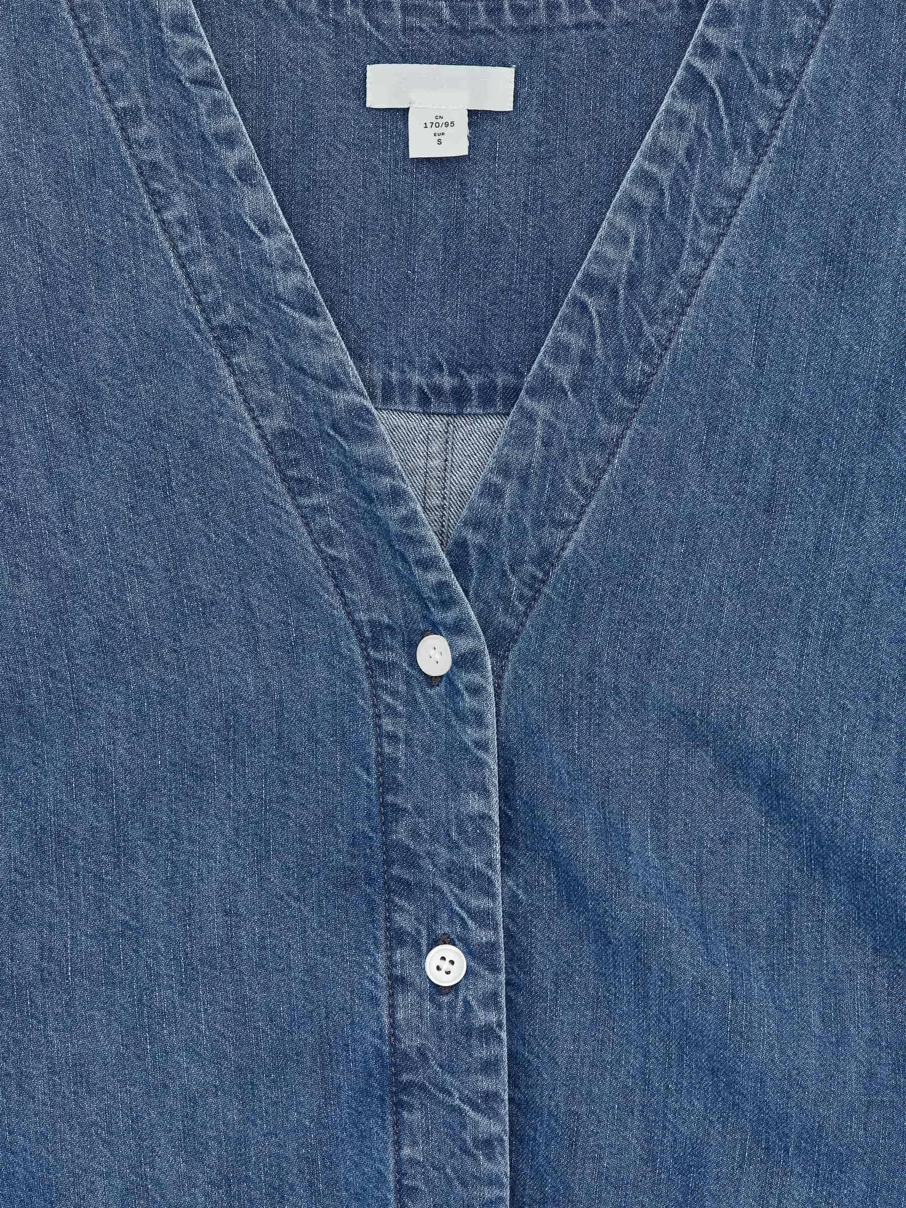 Denim blouse crafted from cotton. Styled with a V-neck, button closure and 3/4 length sleeves. Loose fit.