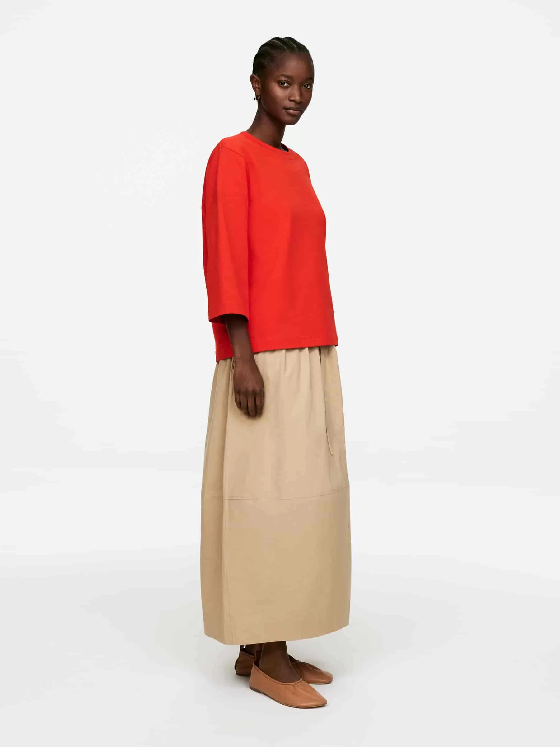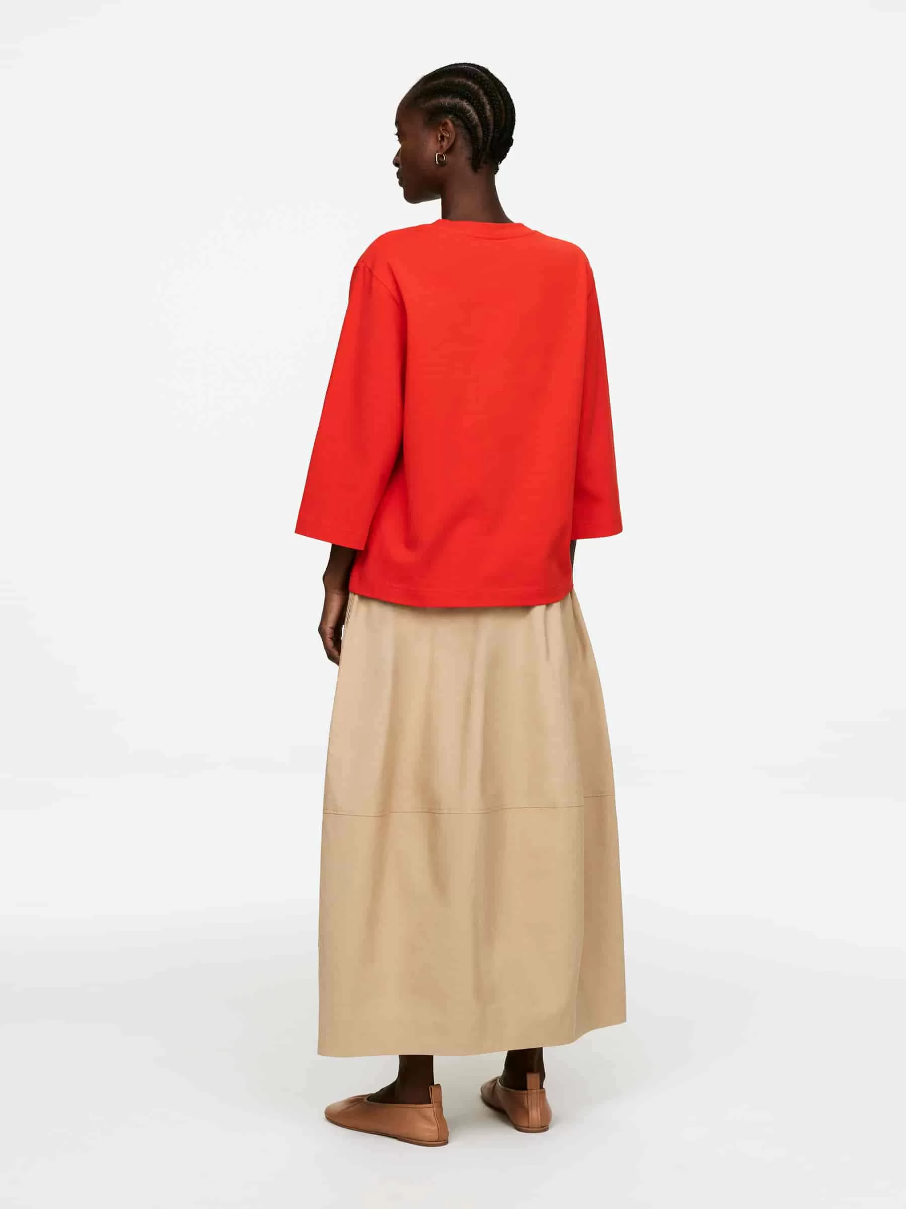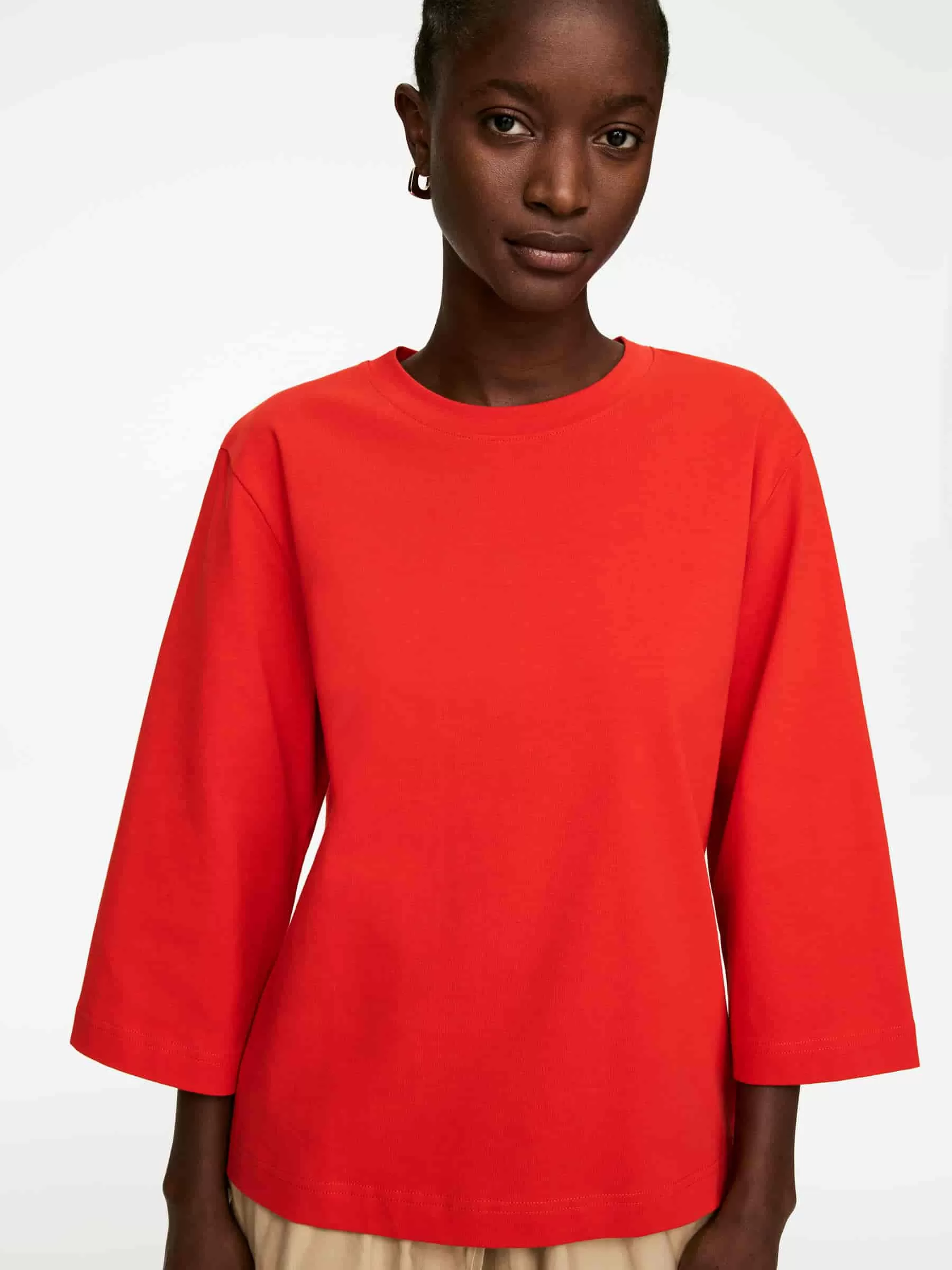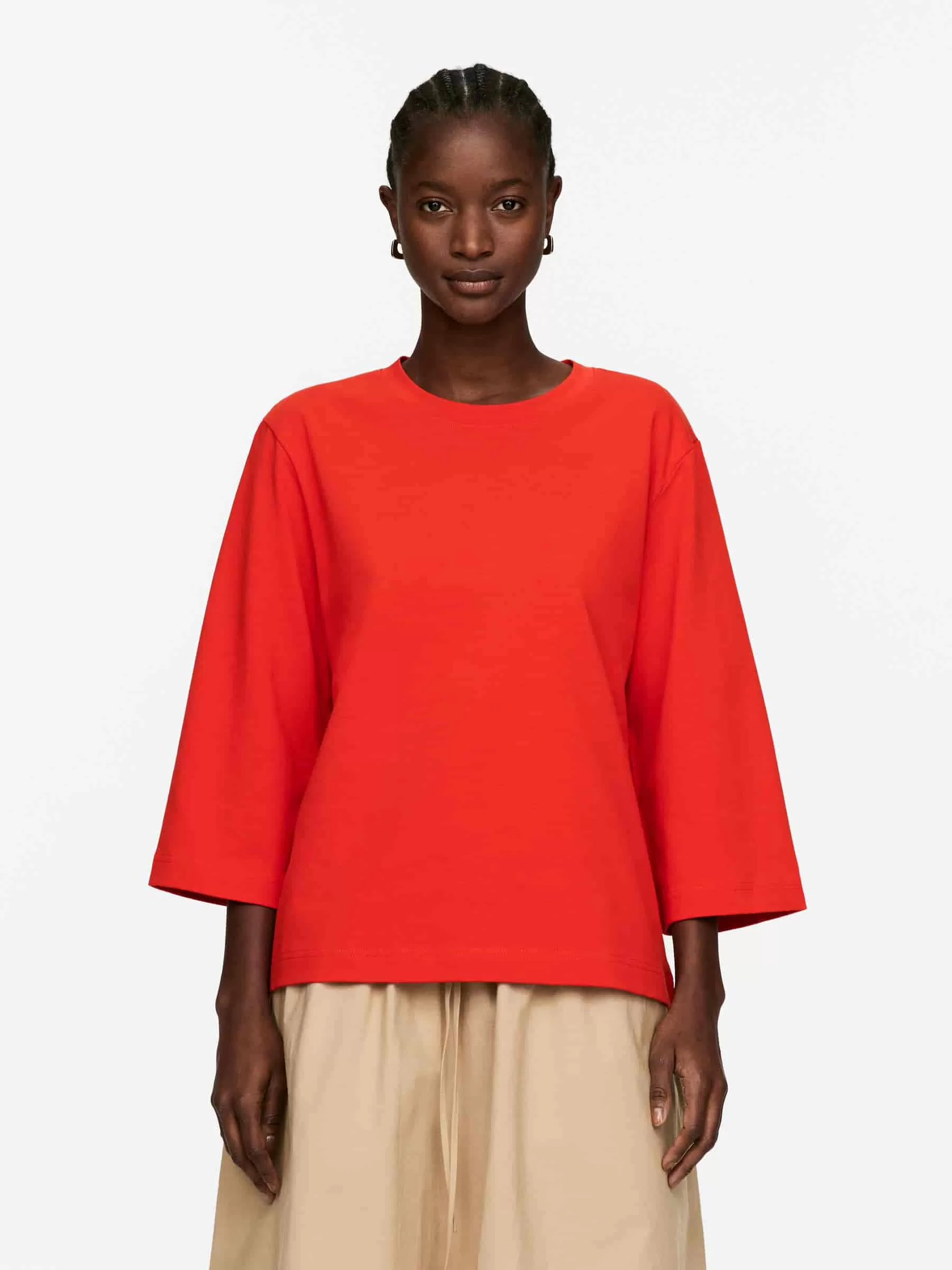 Crew-neck T-shirt crafted from a crisp heavyweight cotton jersey. Styled with 3/4 length sleeves.