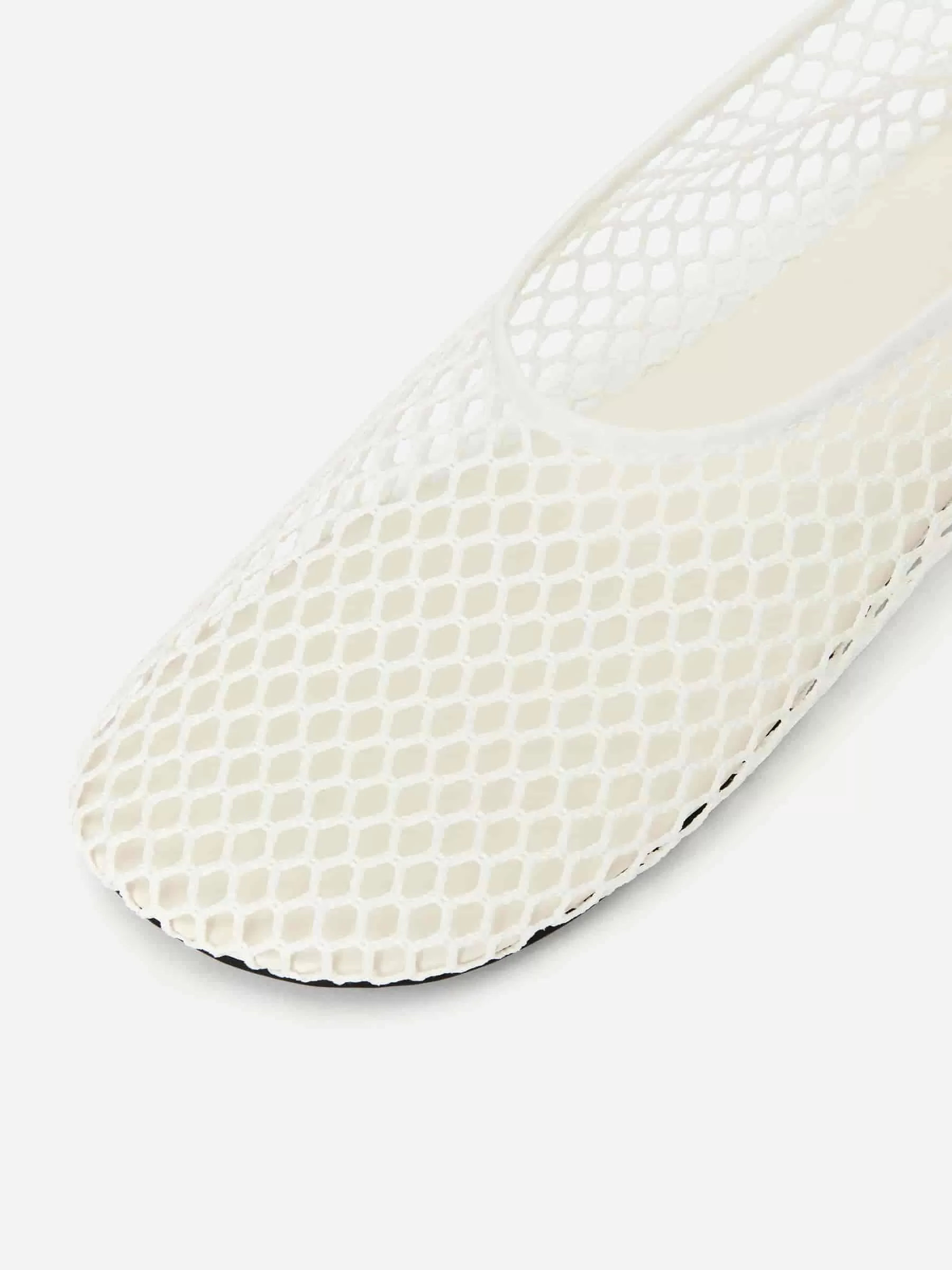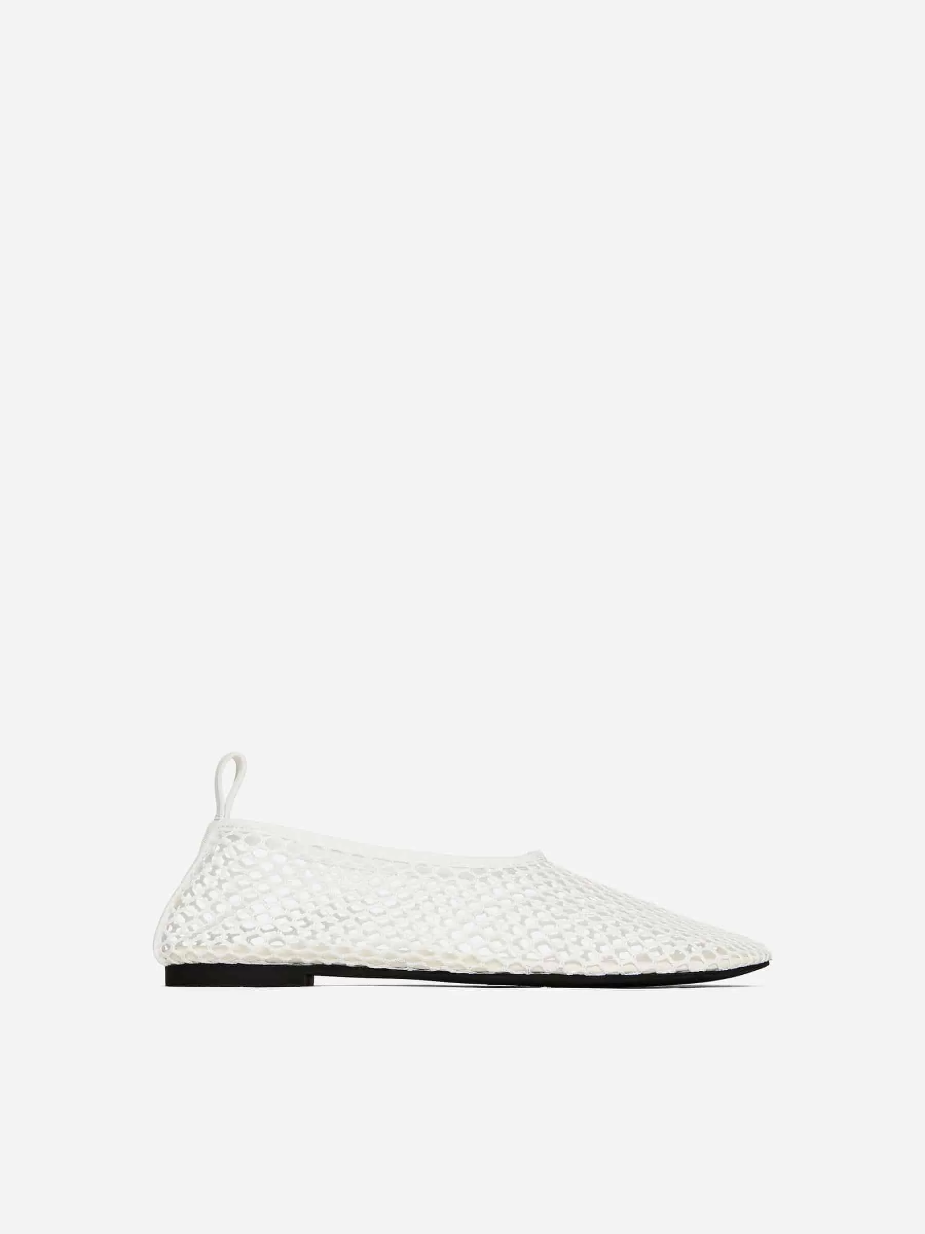 Mesh flat with elastic binding on top edge and back strap puller for easy dressing. Rubber sole.