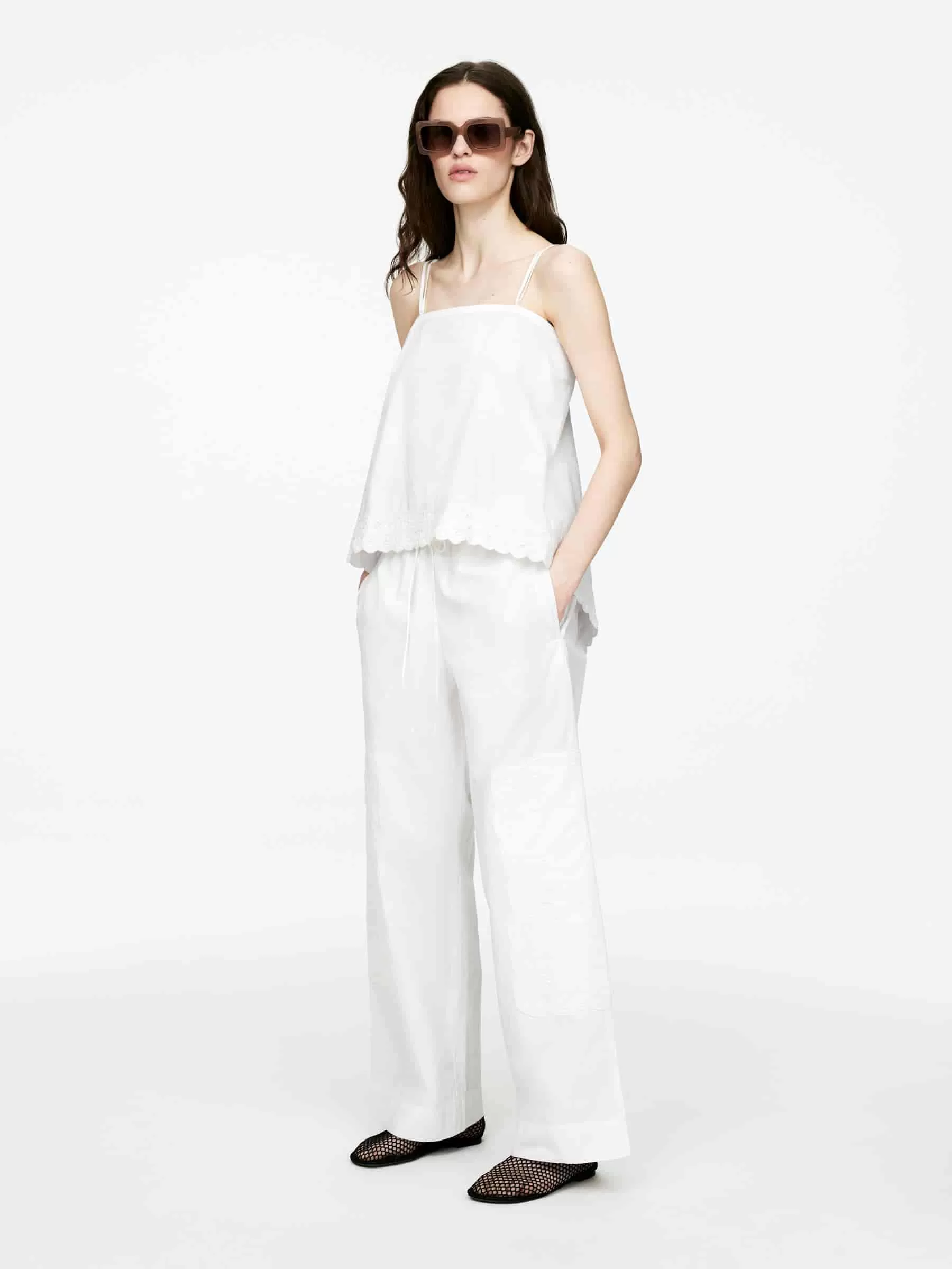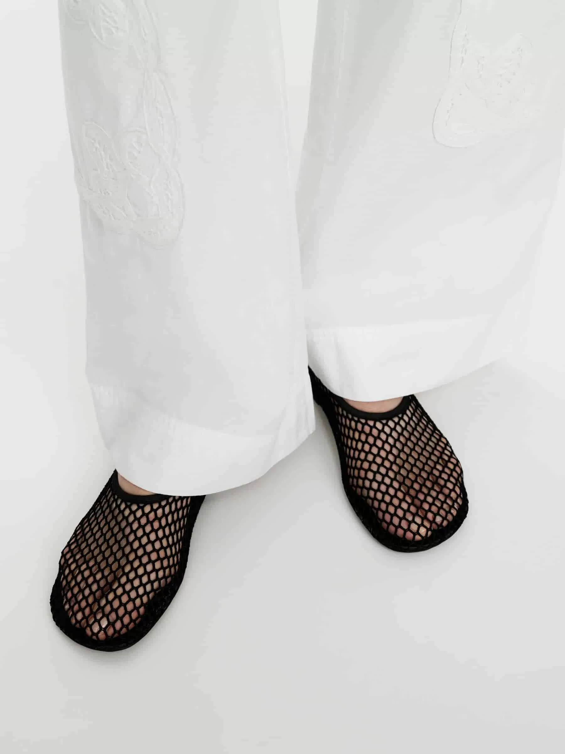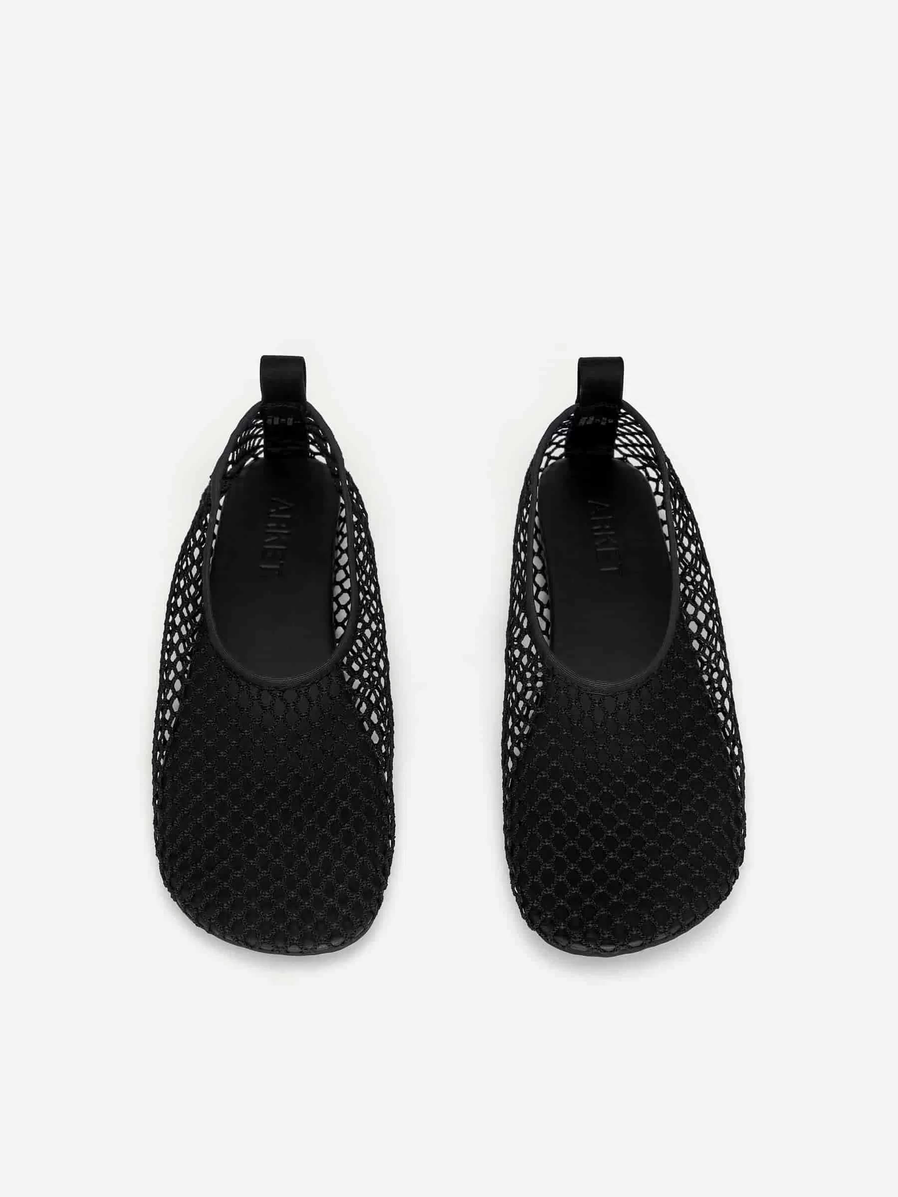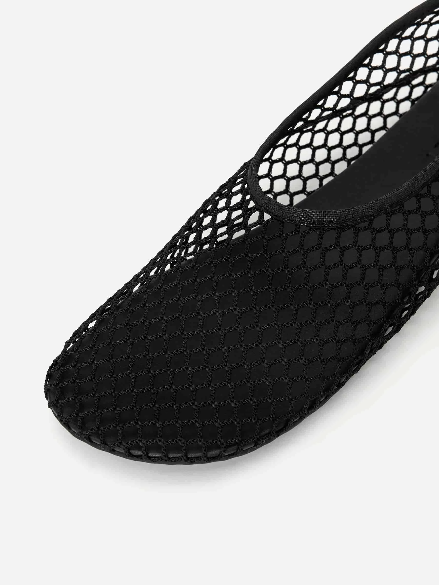 Mesh flat with elastic binding on top edge and back strap puller for easy dressing. Rubber sole.