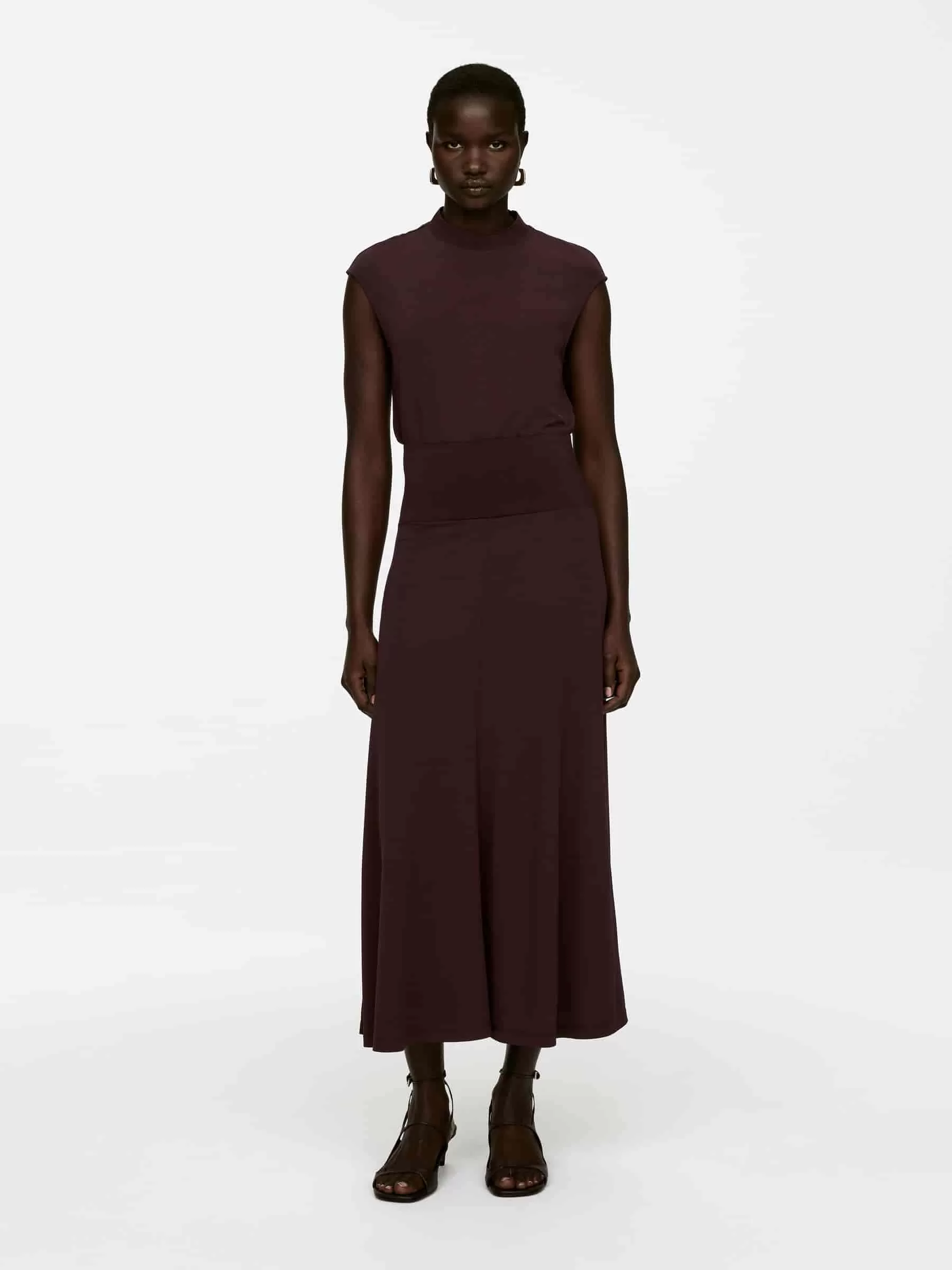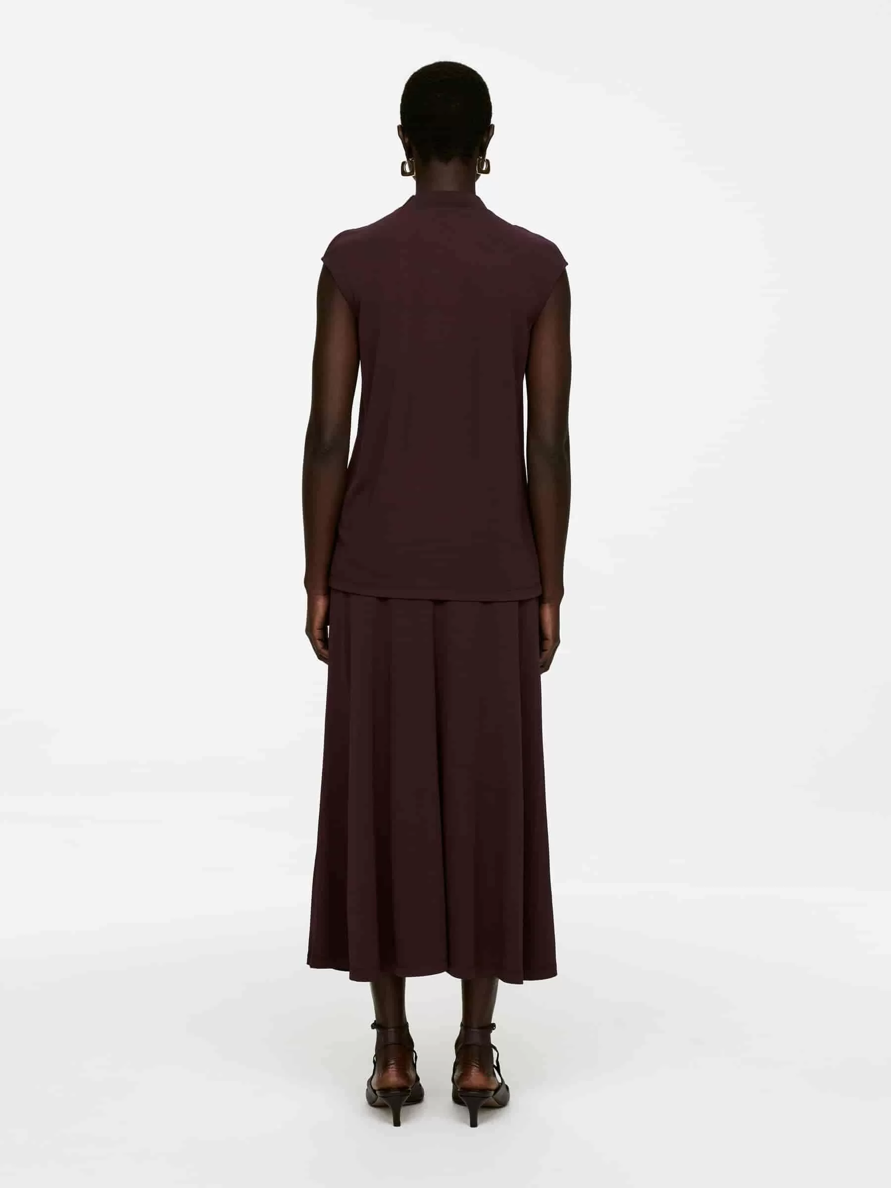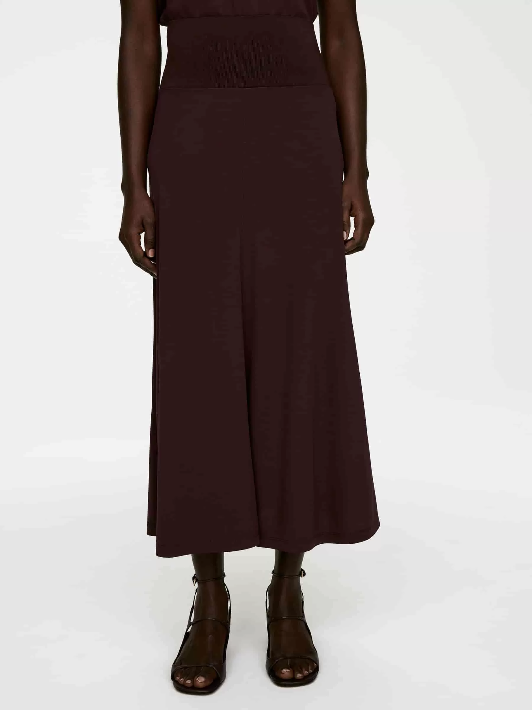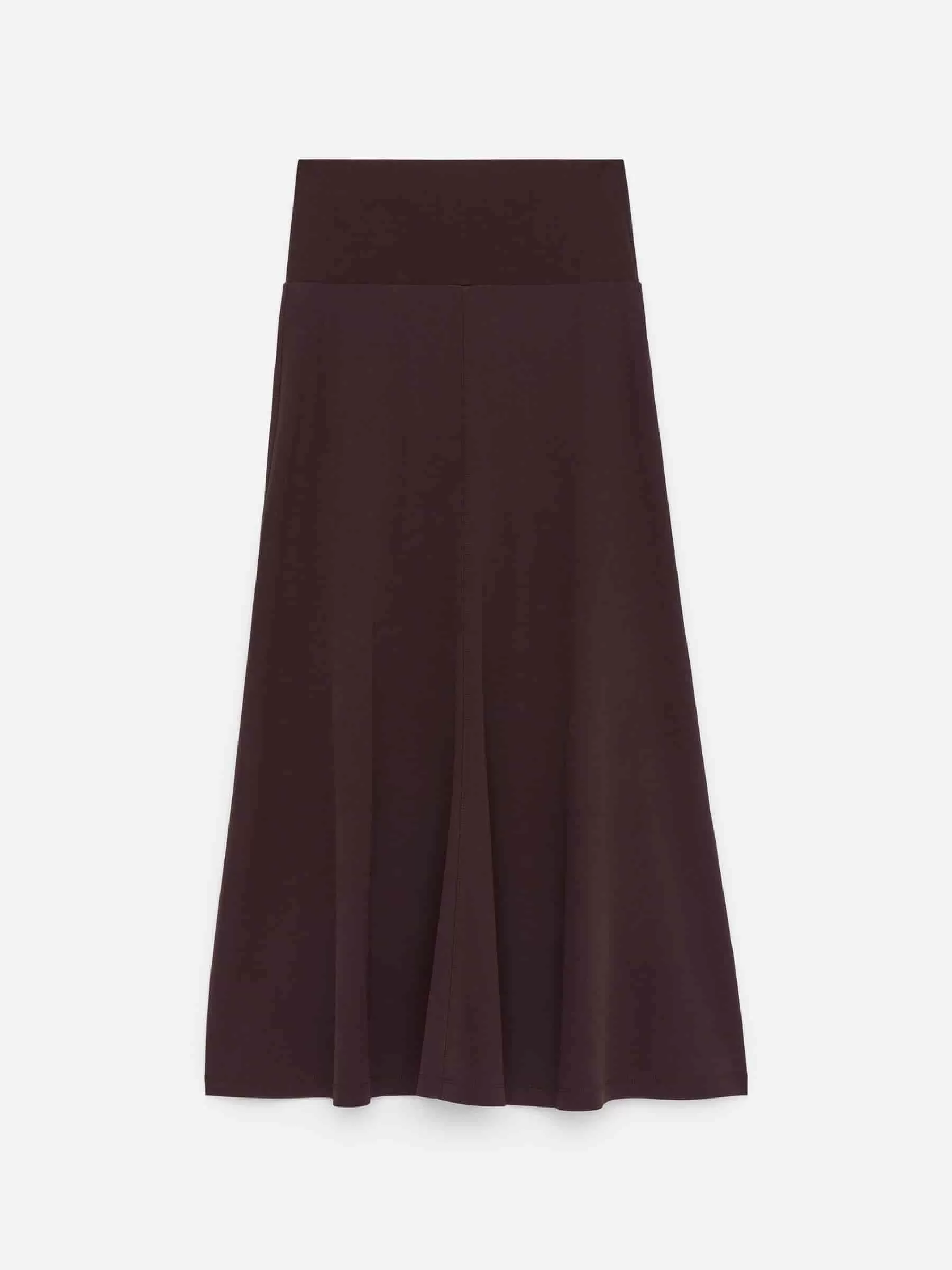 Fluid maxi skirt crafted from a crêpe interlock jersey fabric. This style features a wide waistband and vertical panel stitching at centre front and centre back. Part of set