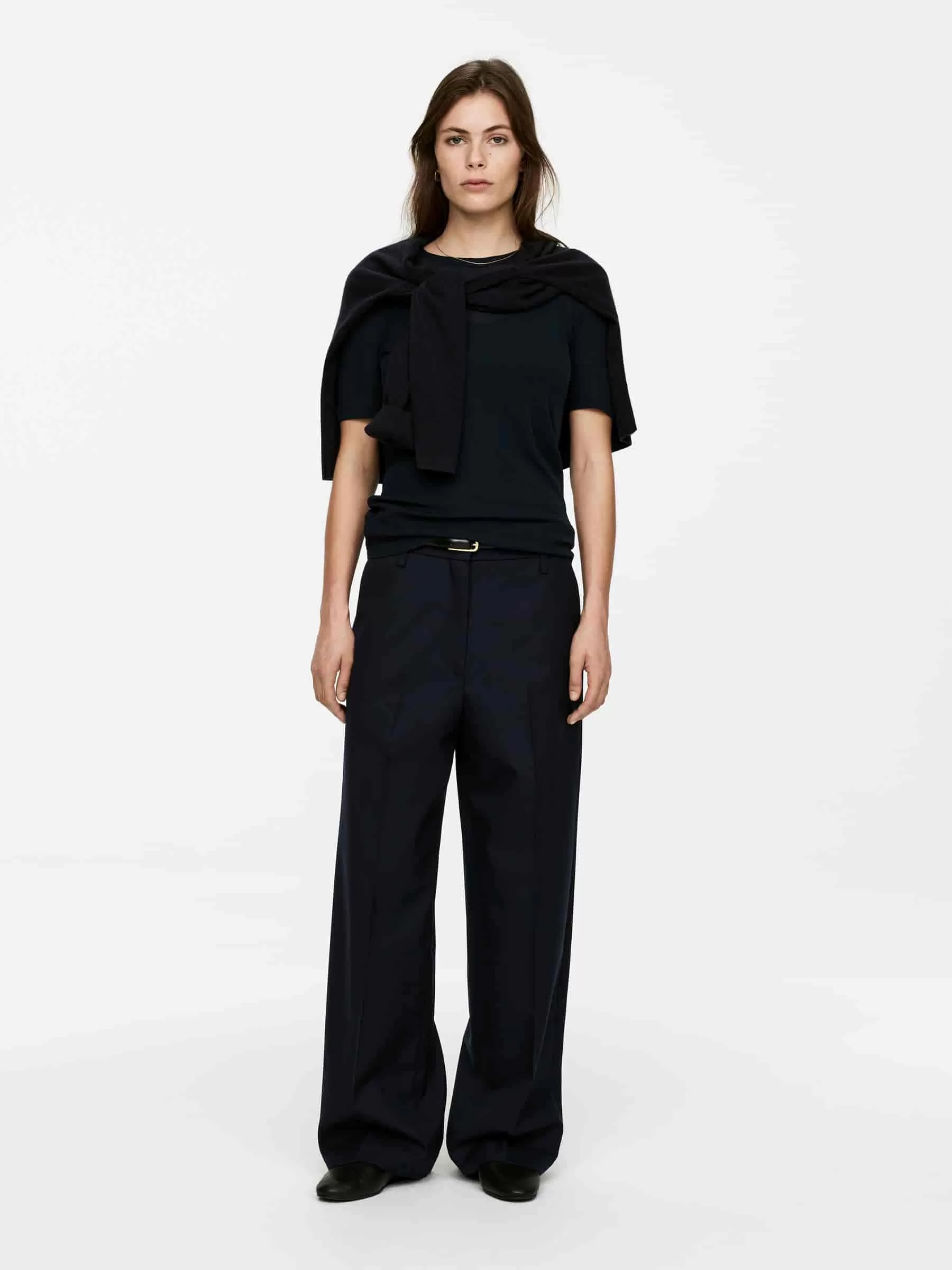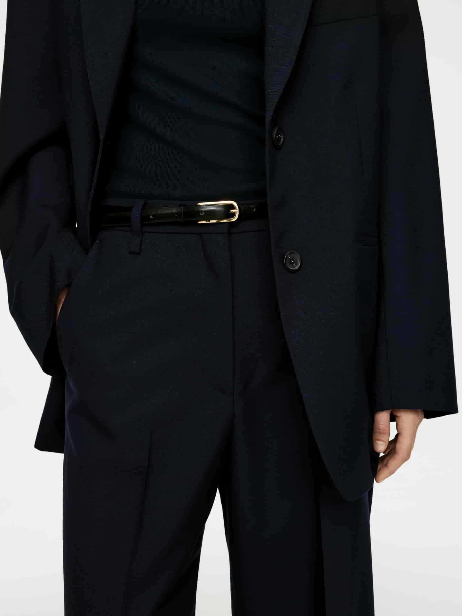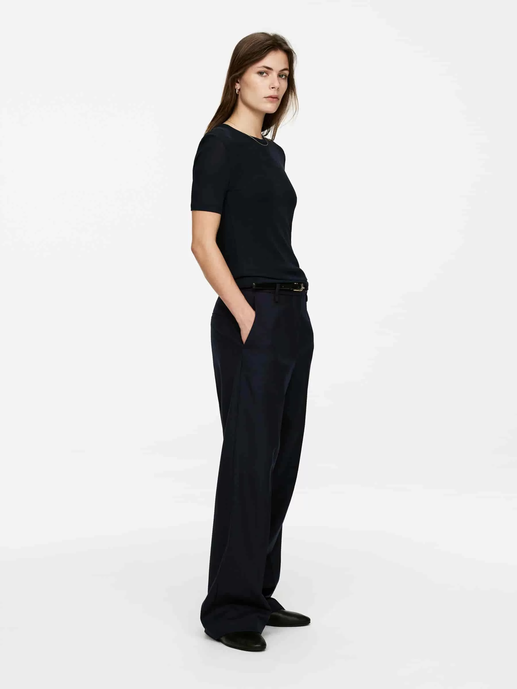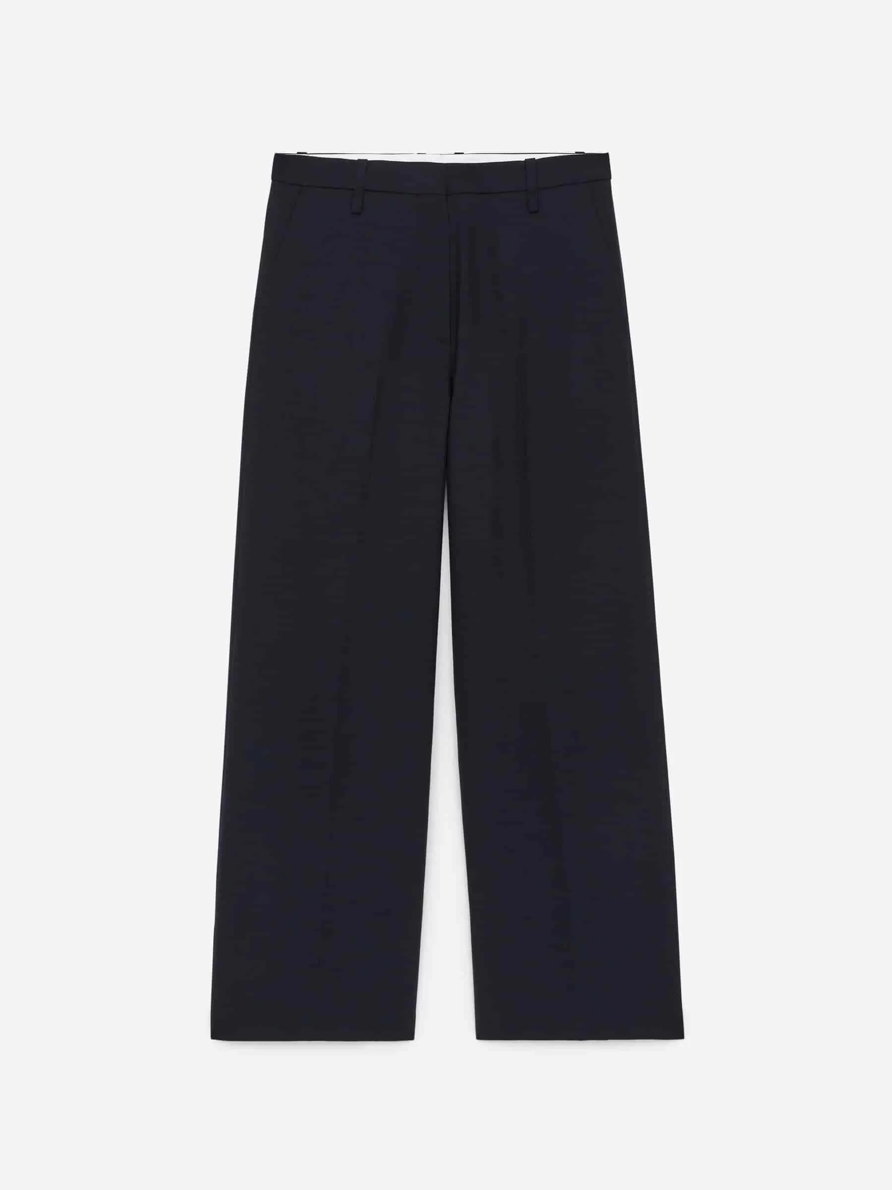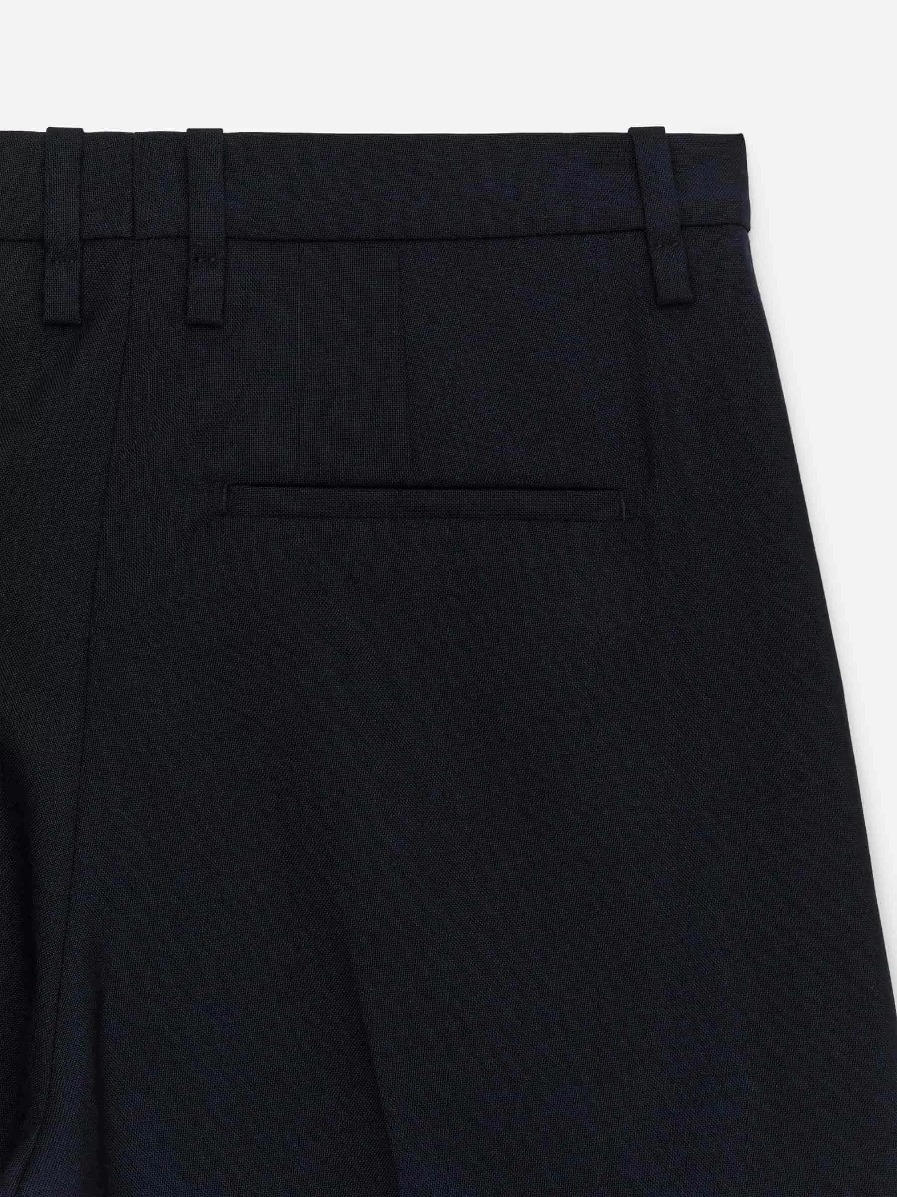 Trousers crafted from a hopsack weave made of wool. A mid-waist style with press creases at front and back, side pockets and a single welt pocket at back. The shell fabric contains 100% RWS wool (TE-00047206). Products certified to the Responsible Wool Standard (RWS) contain wool fiber from farms independently certified to animal welfare and land management requirements.