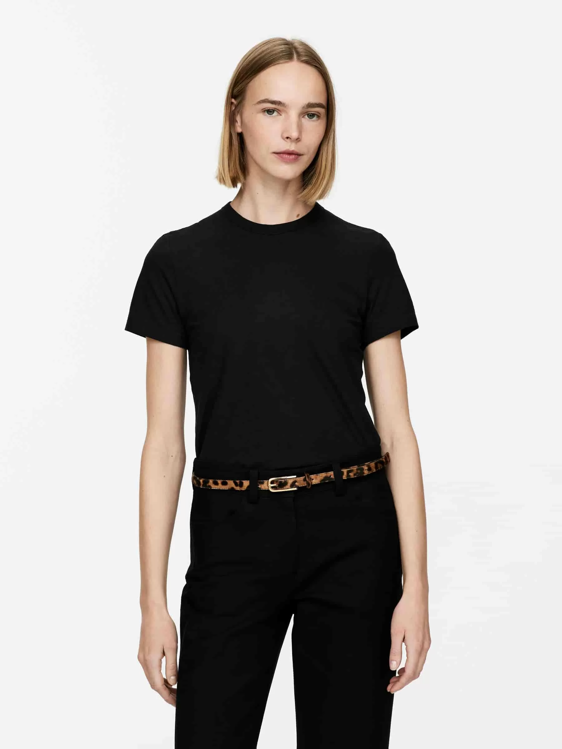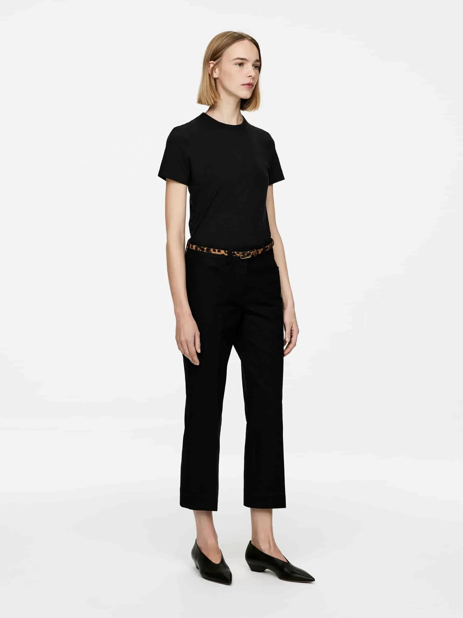 Fitted t-shirt crafted from an ice crêpe knitted cotton quality that combines fluidity with a unique crisp hand feel. Detailed with bamboo stitches at end of sleeves and bottom hem and a wide binding at neck.