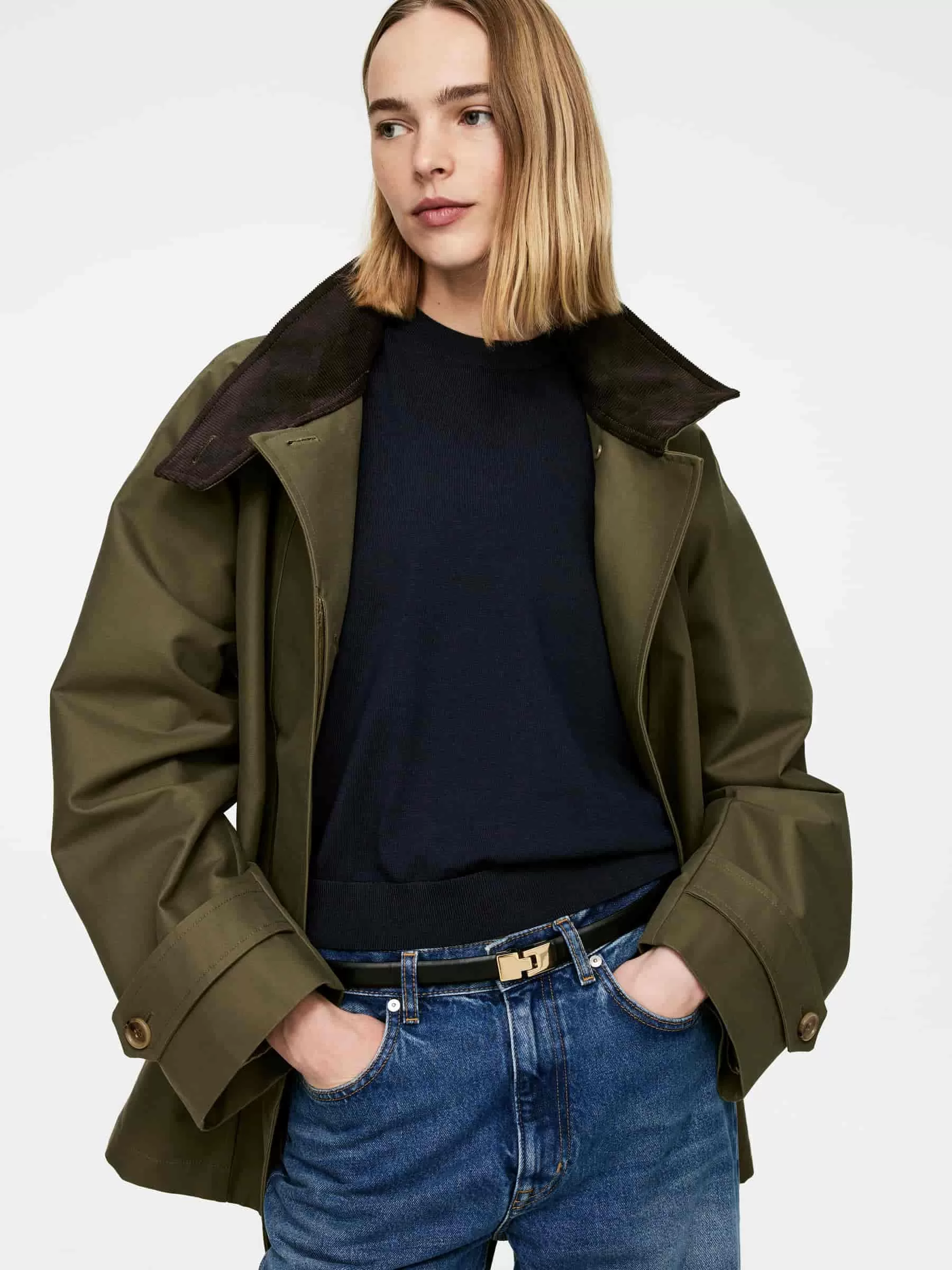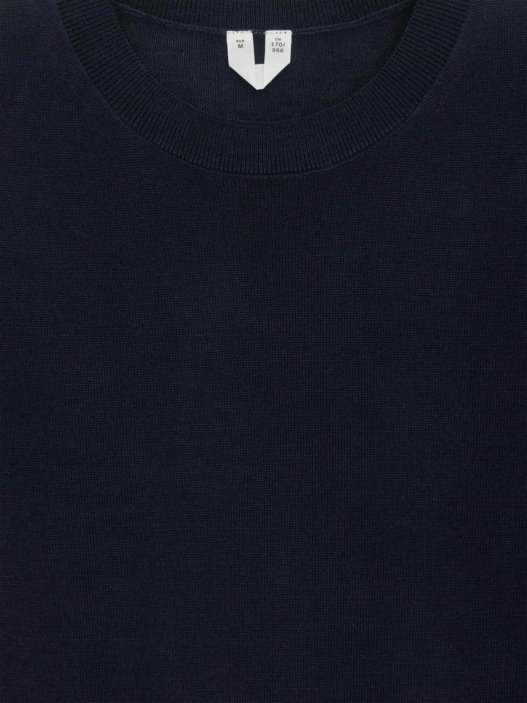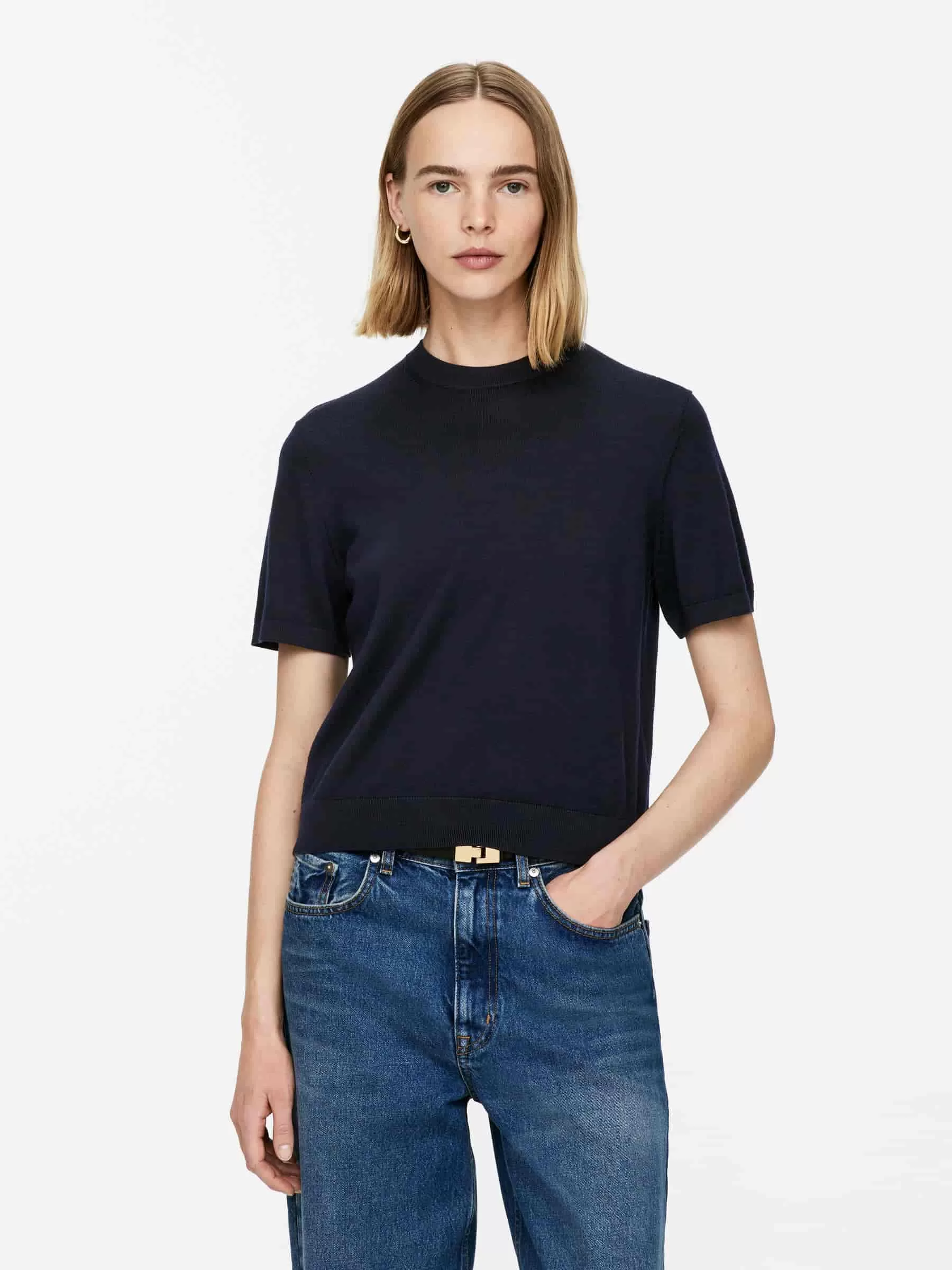 Plain-knitted jumper with short sleeves in merino wool. Styled with ribbed trims. The jumper contains 100% RWS wool, certified by control union 893290. Products certified to the Responsible Wool Standard (RWS) contain wool fiber from farms independently certified to animal welfare and land management requirements.