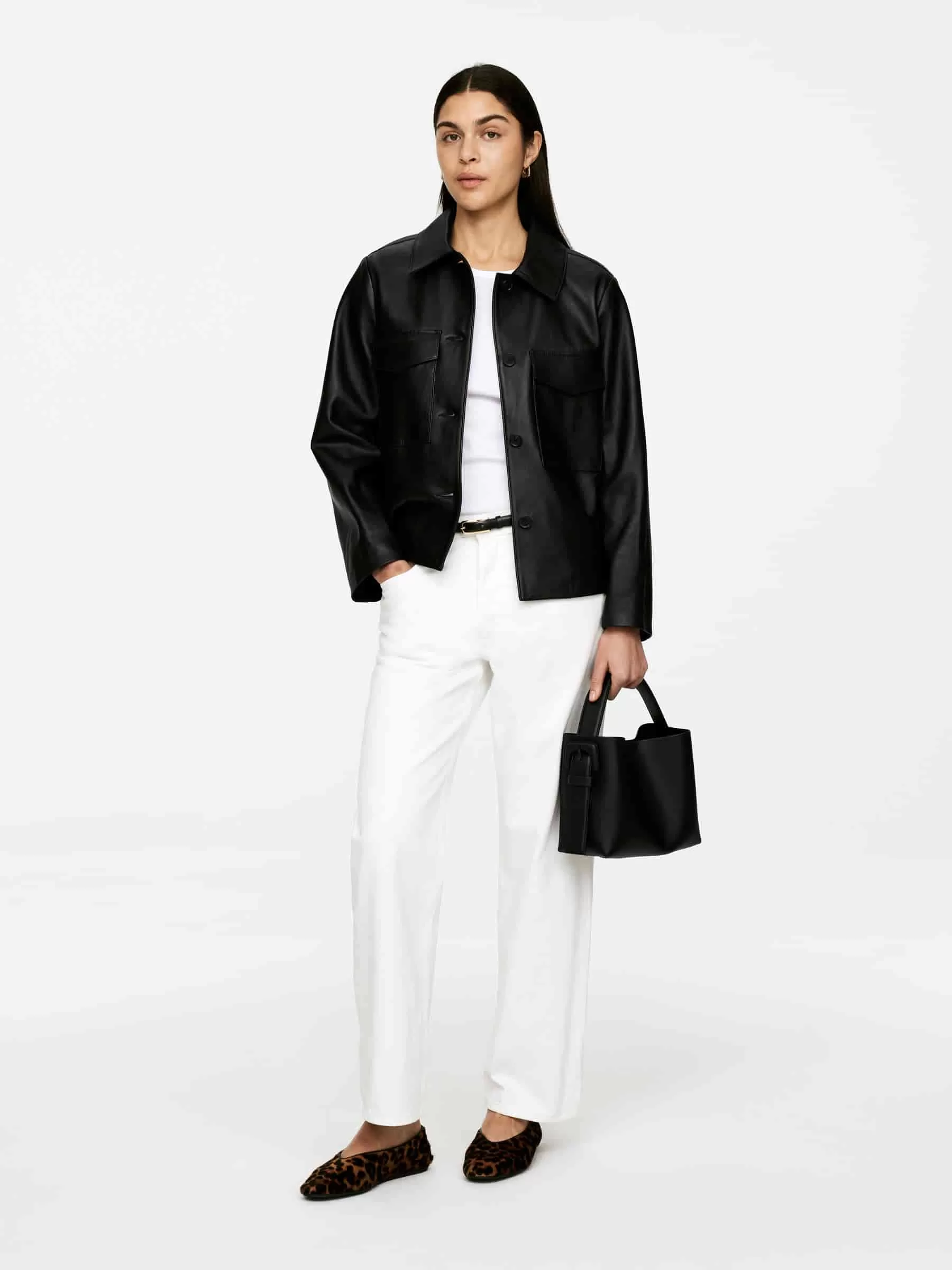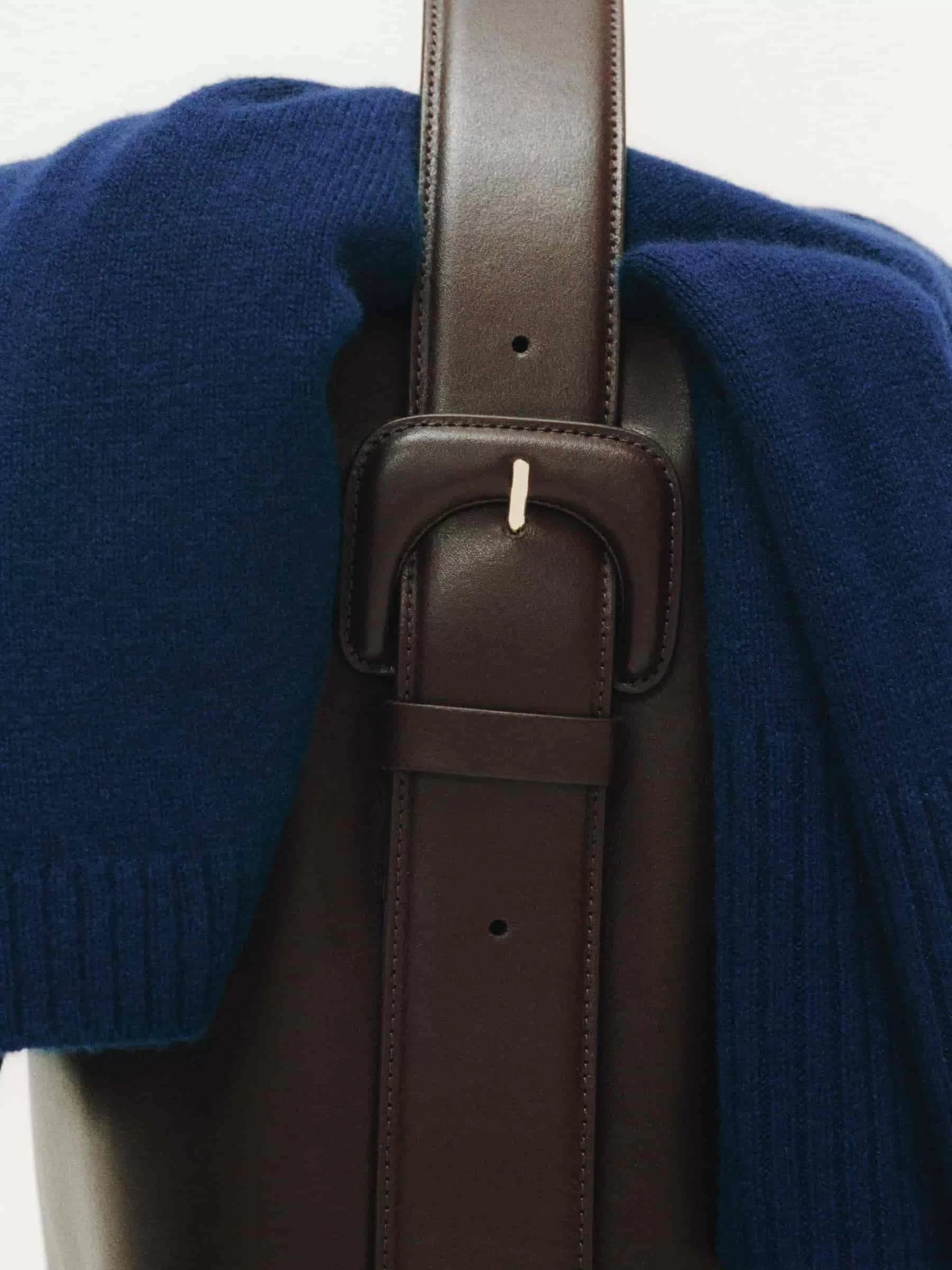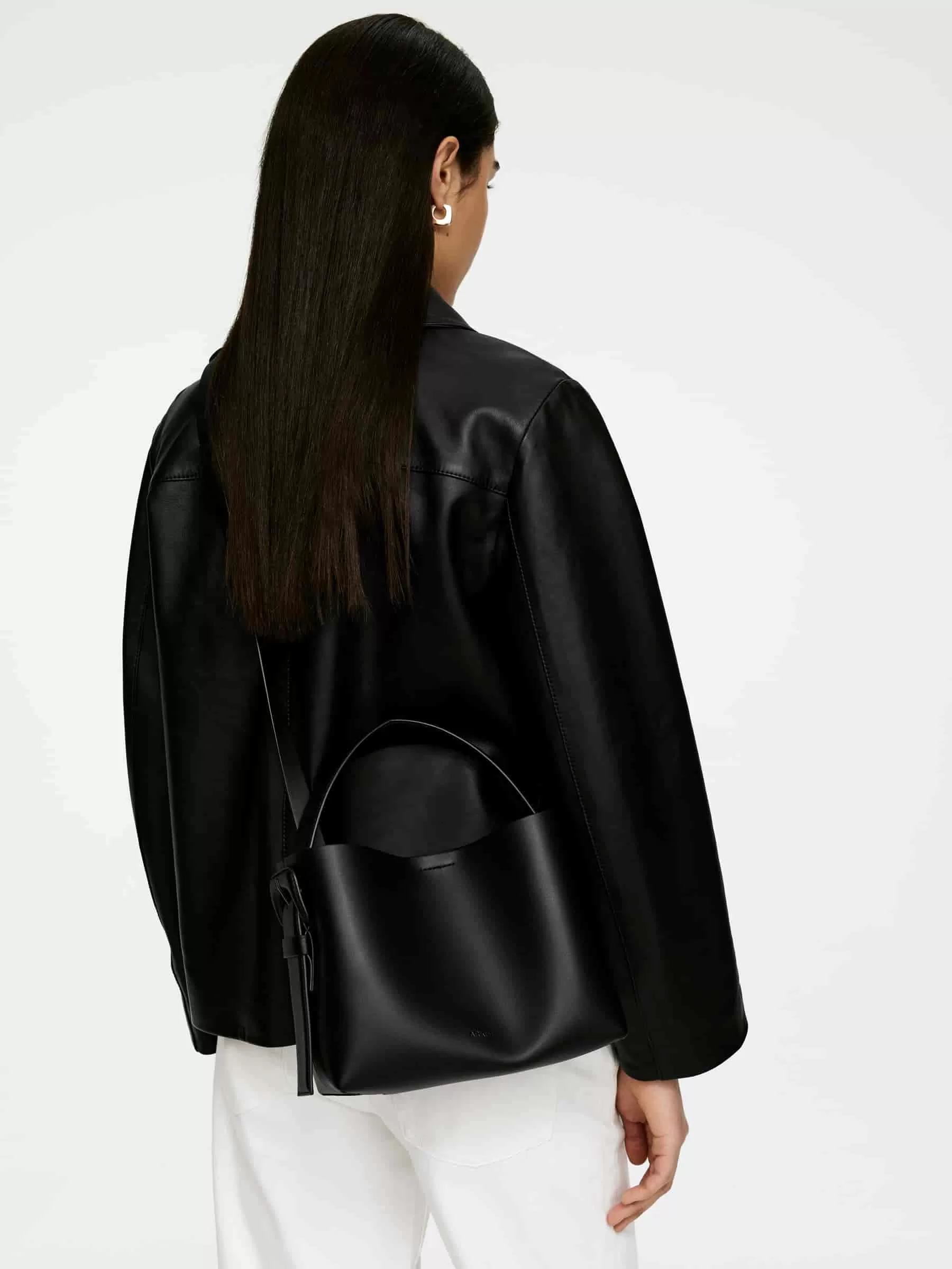 Mid-size crossbody bag crafted from rigid bonded leather. Detailed with a magnetic closure and a wide top handle with a leather-covered buckle. Both shoulder strap and top handle are adjustable in length. The bag holds a mid compartment with zip closure. Dimensions 23 cm x 19 cm x 10.5 cm. The leather used has undergone a chrome-free tanning process.