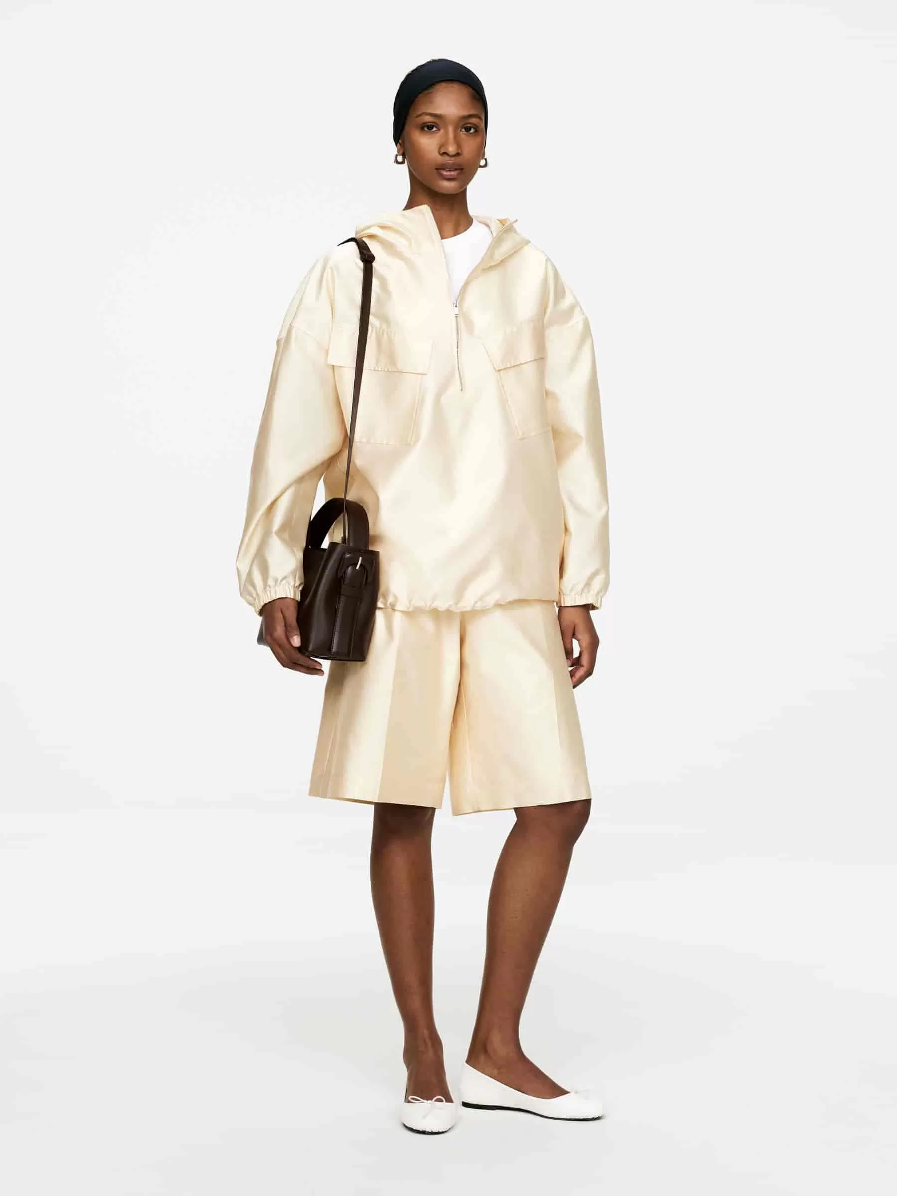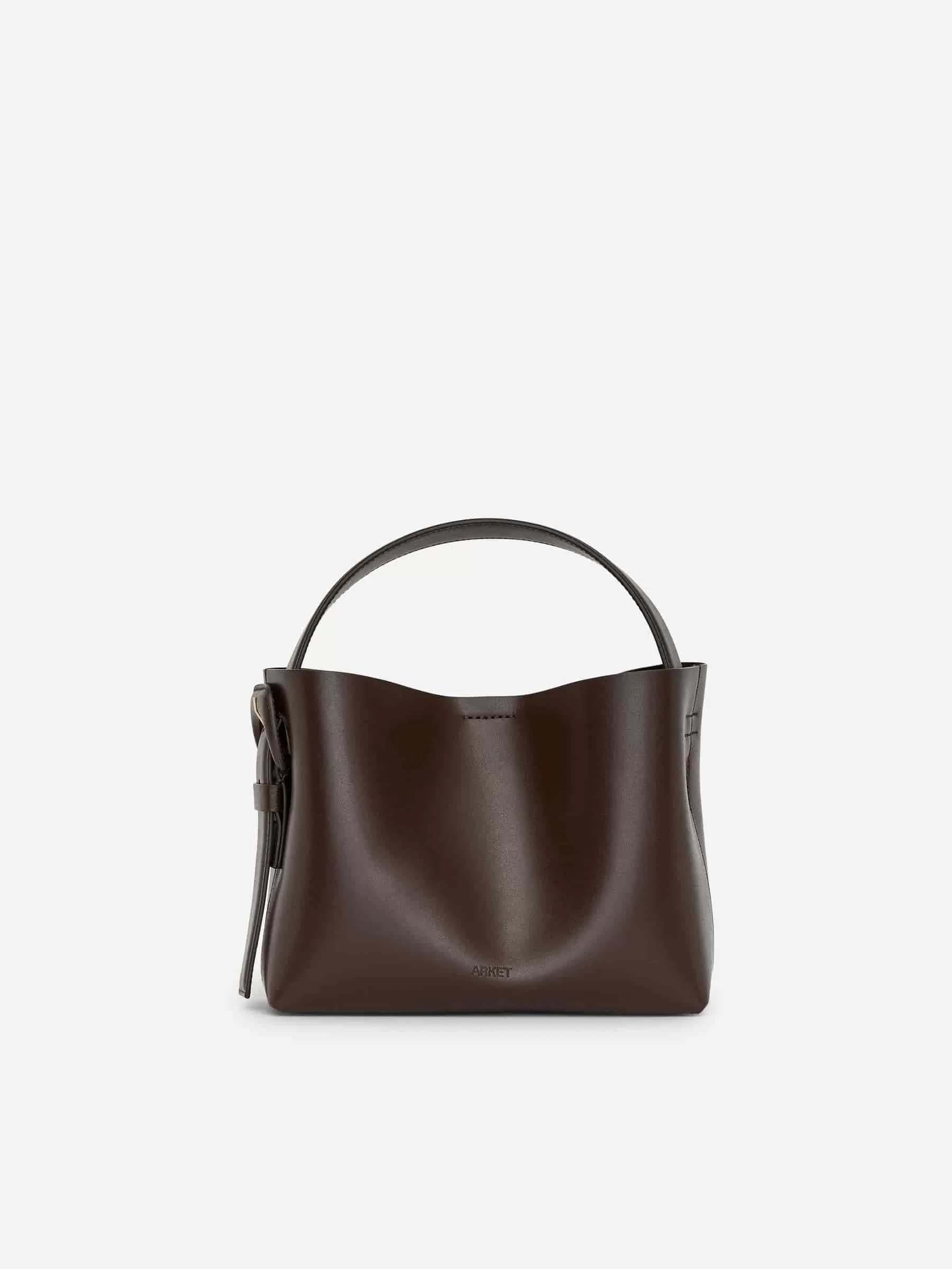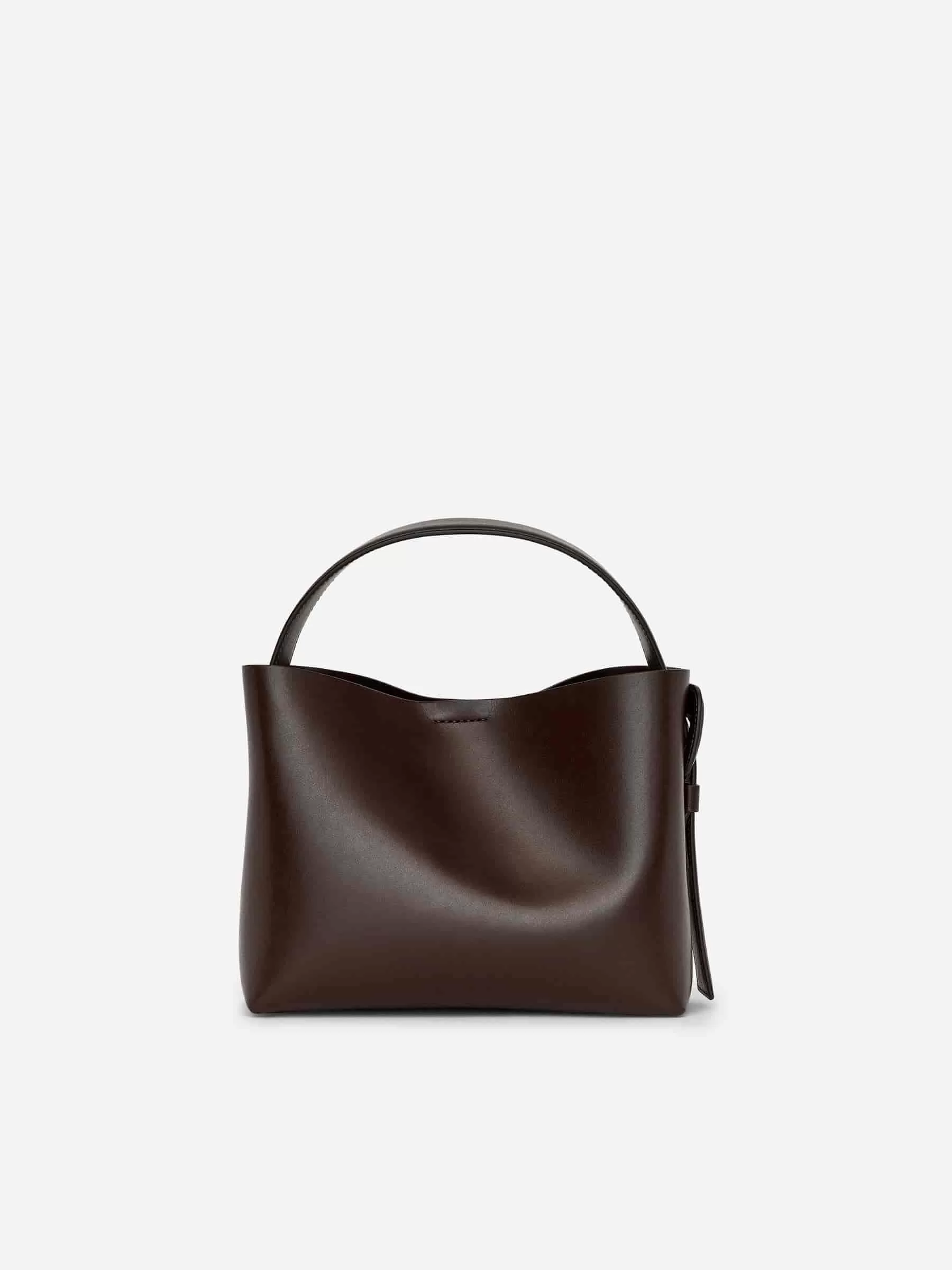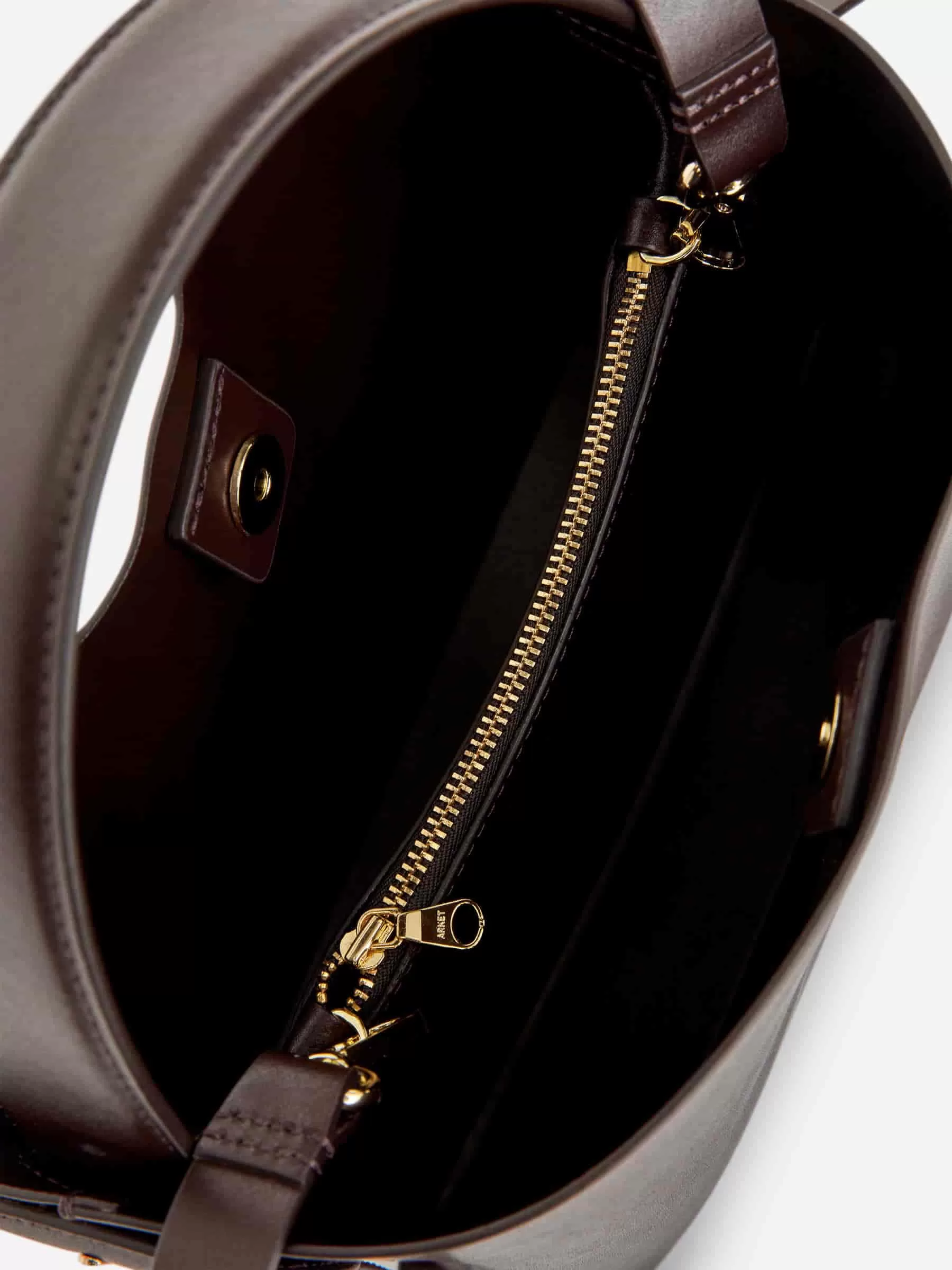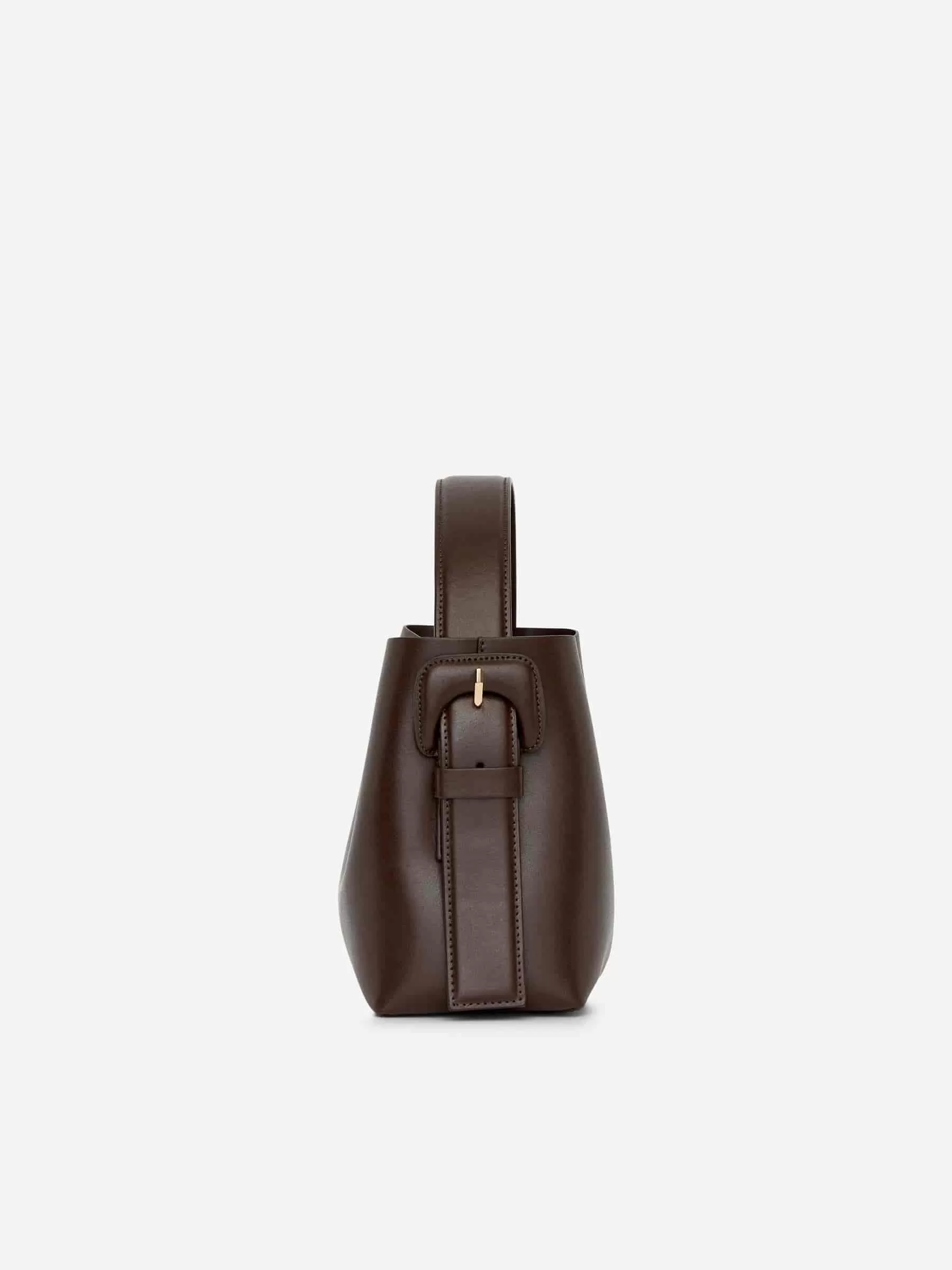 Mid-size crossbody bag crafted from rigid bonded leather. Detailed with a magnetic closure and a wide top handle with a leather-covered buckle. Both shoulder strap and top handle are adjustable in length. The bag holds a mid compartment with zip closure. Dimensions 23 cm x 19 cm x 10.5 cm. The leather used has undergone a chrome-free tanning process.