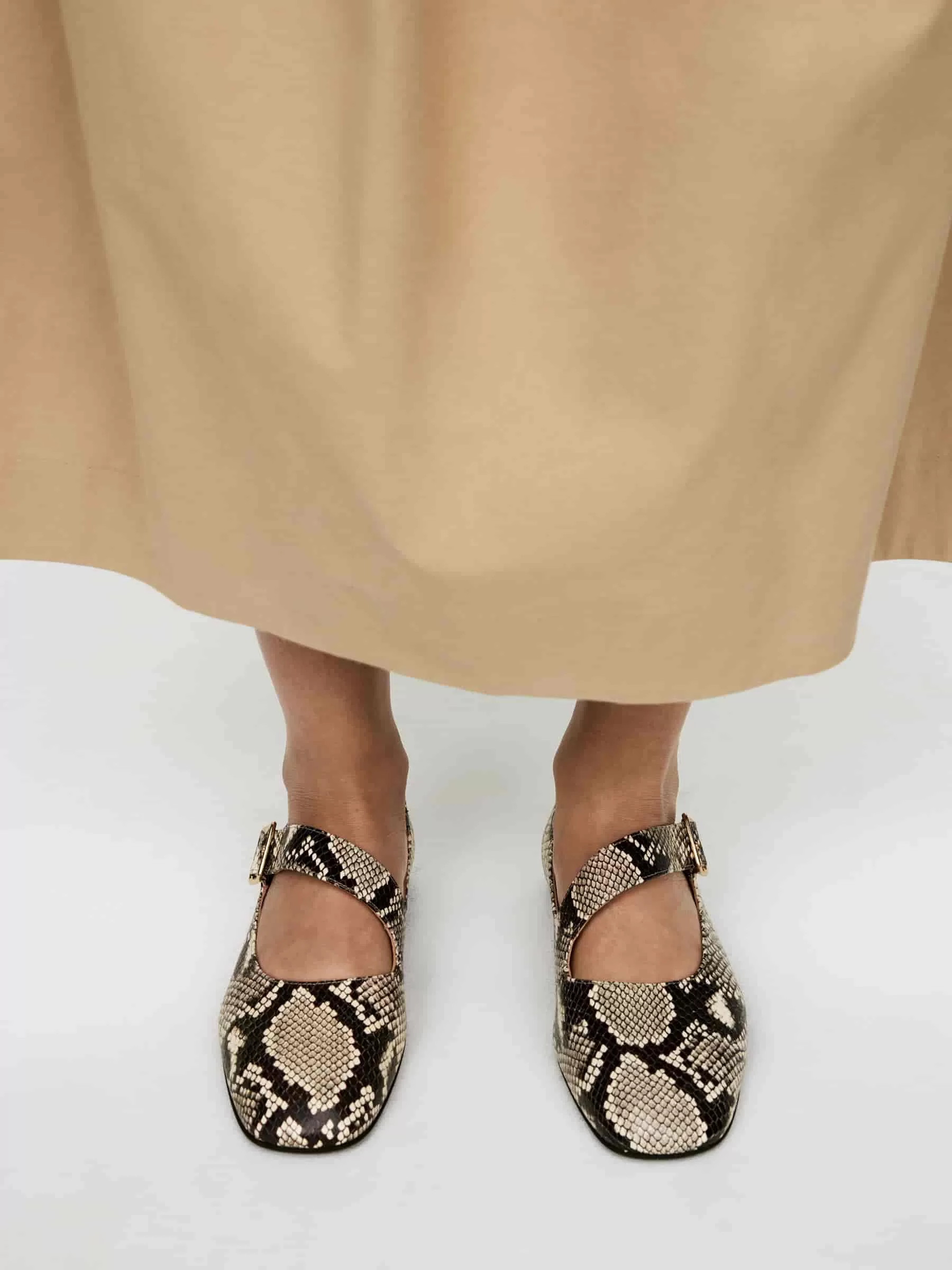 Mary Jane-style leather flats with adjustable crossover straps and gold-toned buckle closure. A snakeskin-patterned style with a rubber sole.