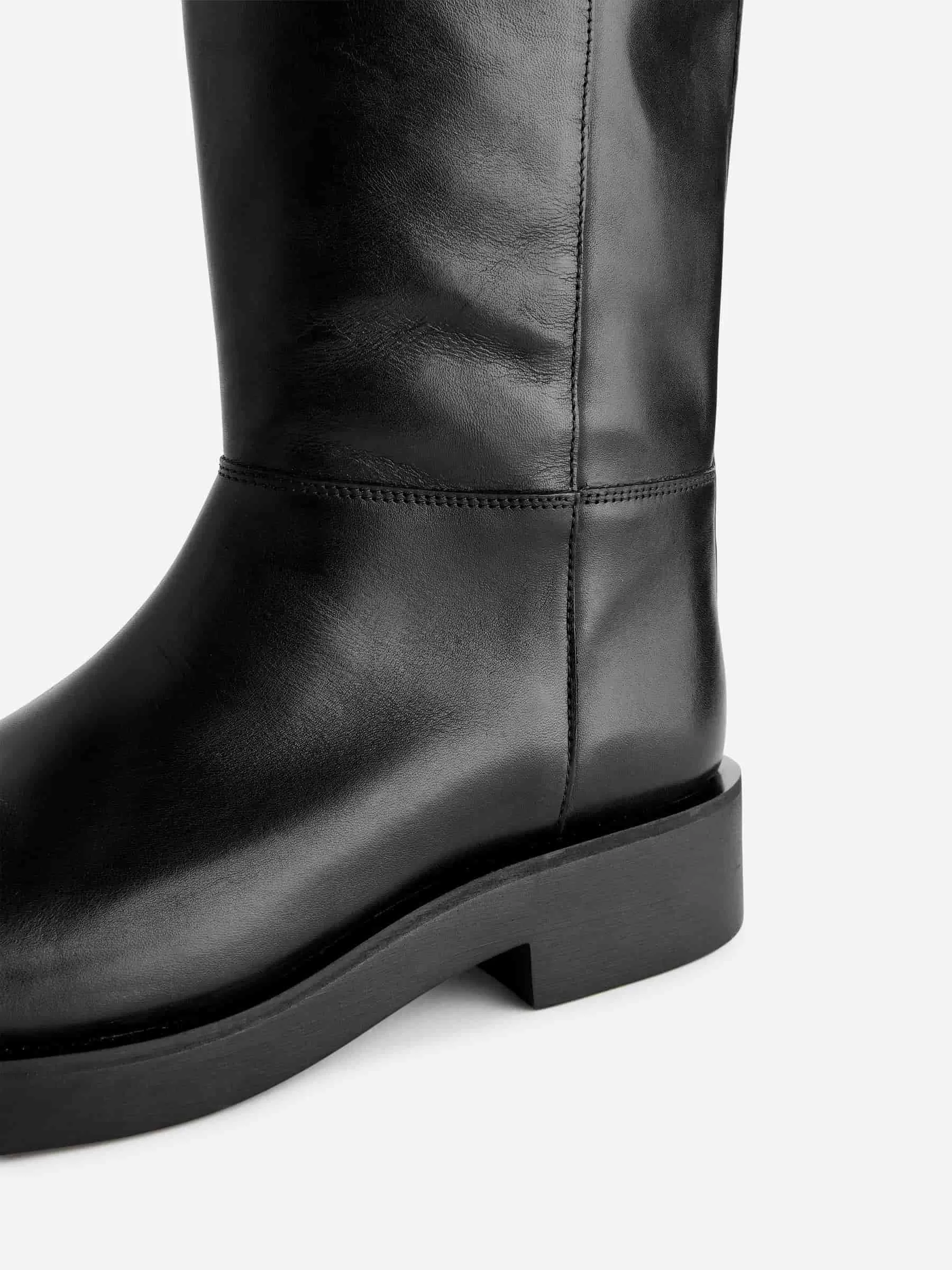 Boots designed with inspiration from classic riding boots with decorative seams on the side and around the wrist. Pull strap at the back make the boots easy to put on. Heel height 3.5 cm. Shaft height (size 39) 41.4 cm. Boot opening circumference (size 39) 39.2 cm.