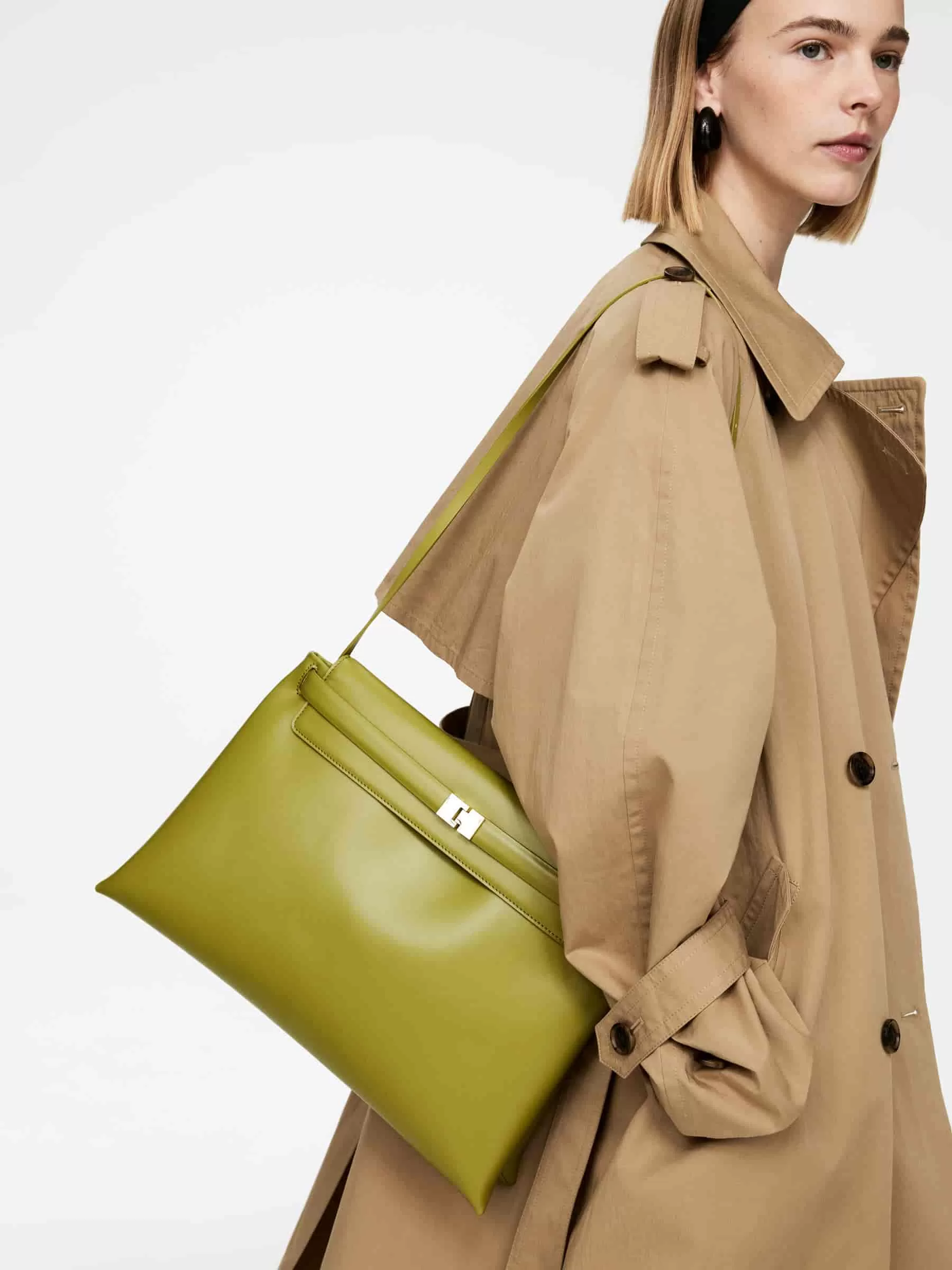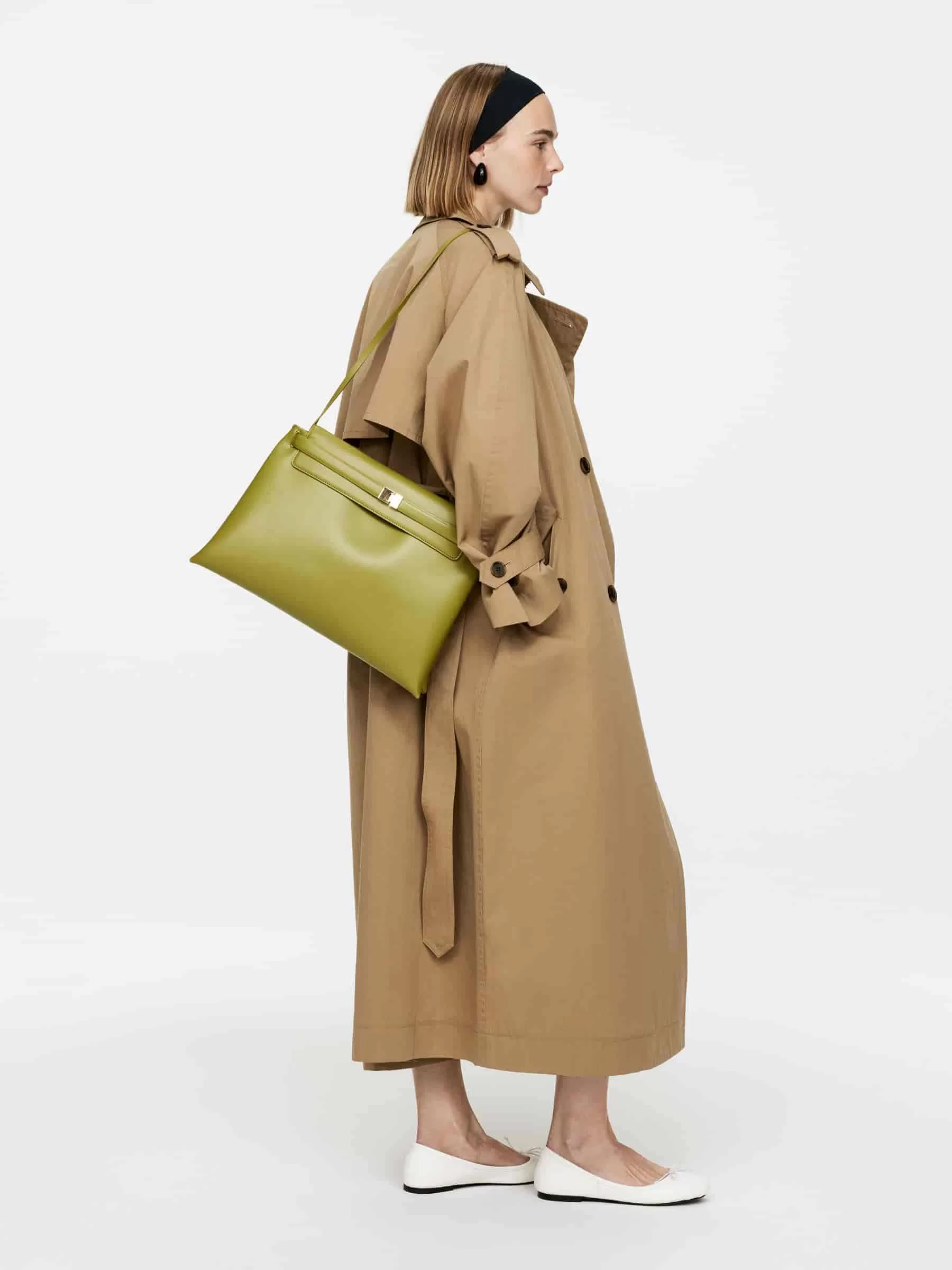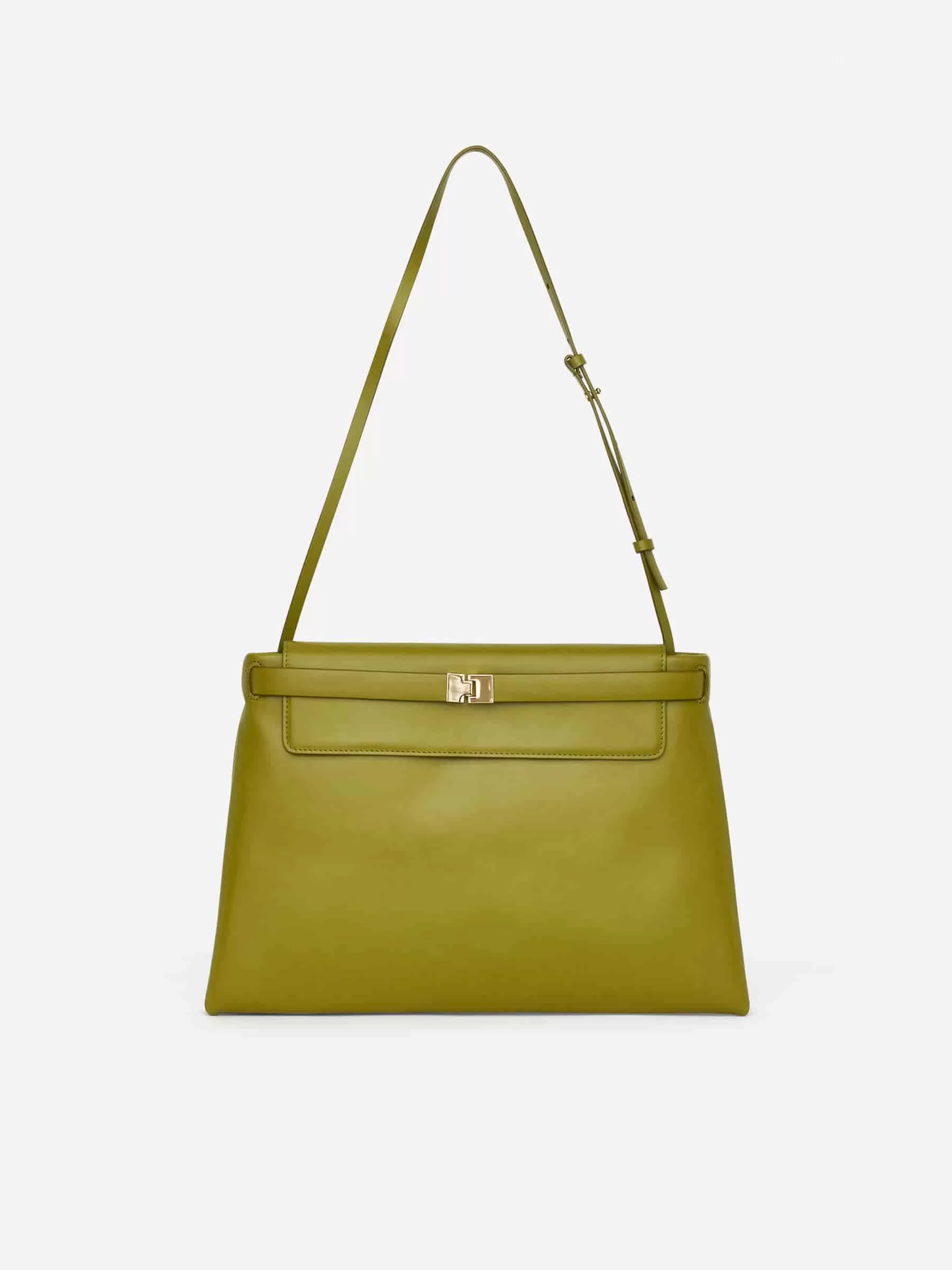 Bag crafted from chrome-free leather. Styled with a detachable belt with a gold-plated buckle around top flap. Removable shoulder strap and zip closure. The bag can be worn as a clutch or on the shoulder. Measurements 39 x 25,5 cm.